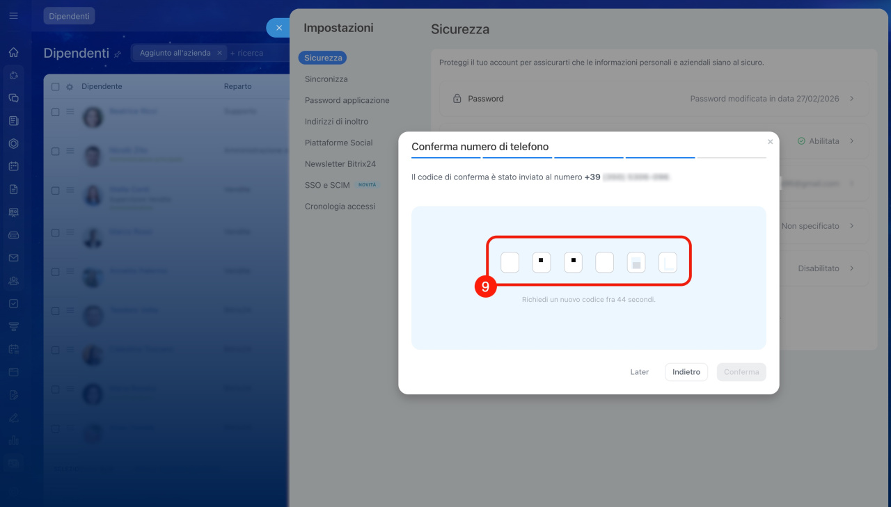Abbiamo migliorato questo sistema di protezione, rendendolo più semplice e sicuro. In precedenza, la conferma avveniva tramite codici generati da applicazioni specifiche, ora è possibile utilizzare l'app mobile di Bitrix24 o un codice monouso inviato via SMS.