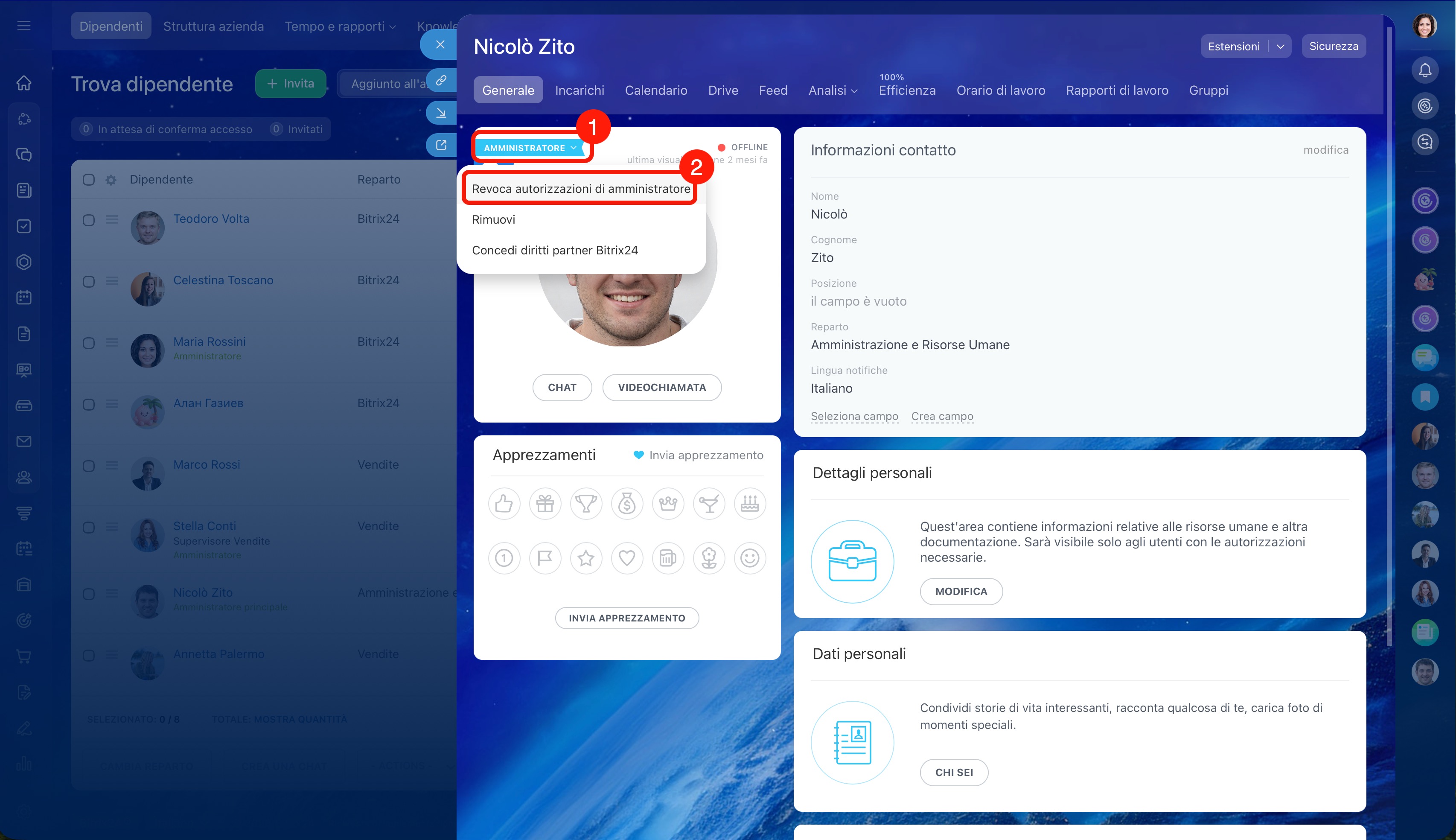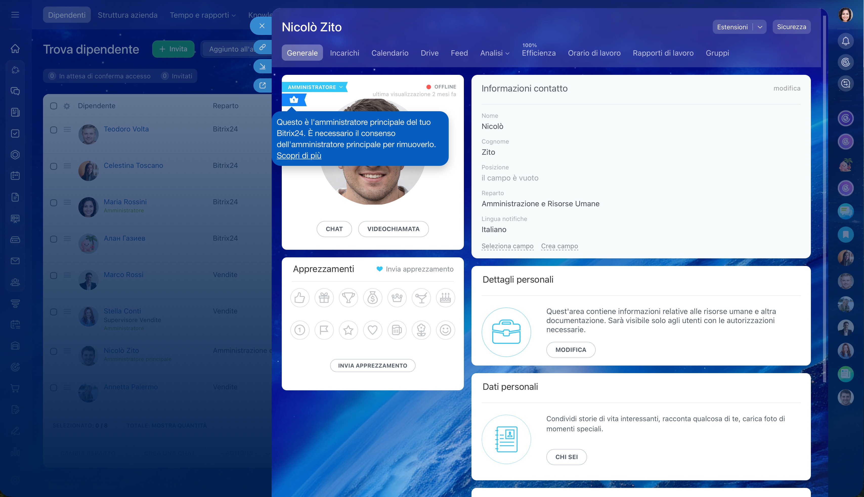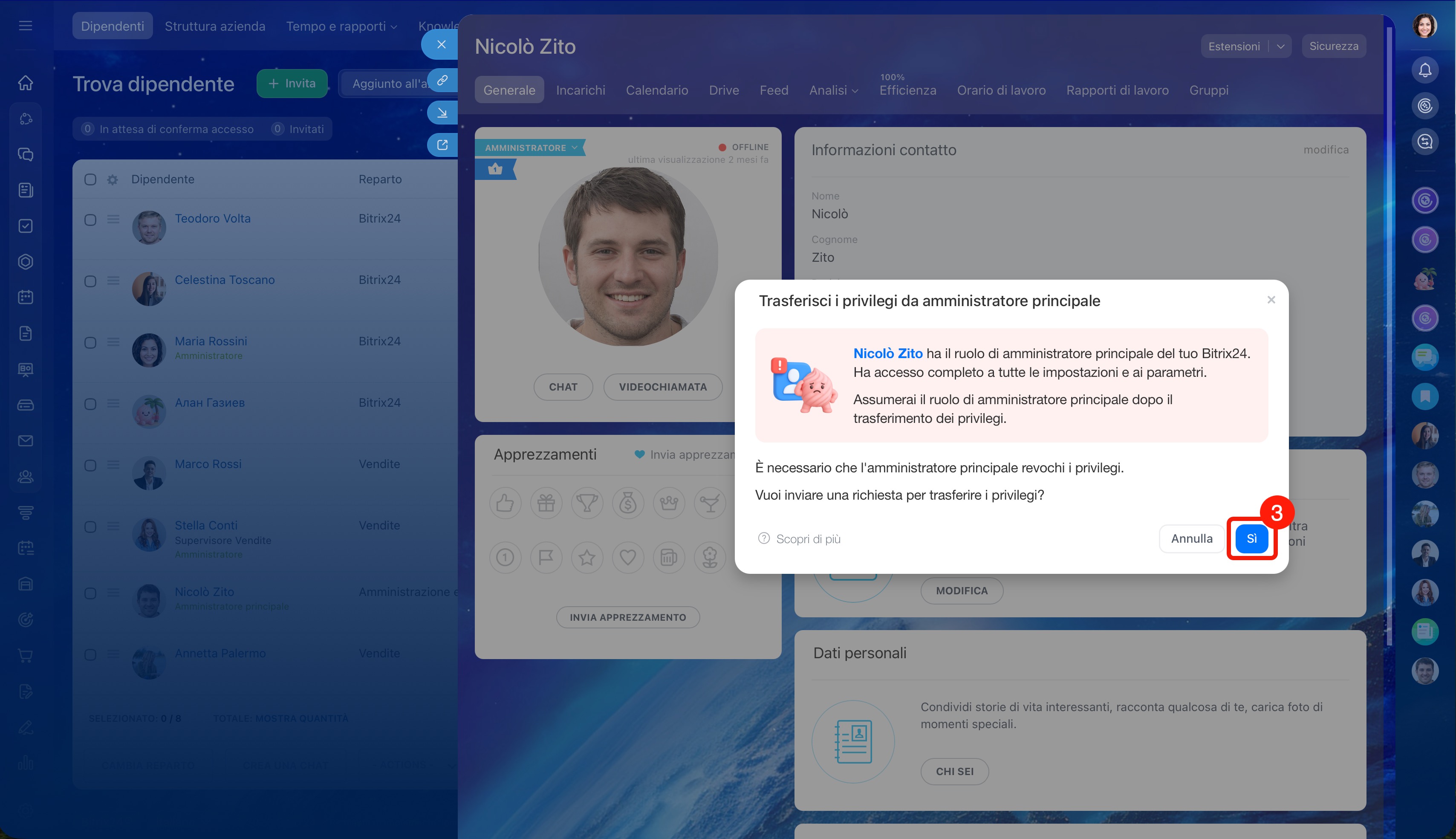 L'amministratore principale ha gli stessi diritti degli altri amministratori, ma solo lui può confermare il trasferimento dei privilegi e il proprio licenziamento, per evitare che il proprietario di Bitrix24 venga cambiato accidentalmente o senza autorizzazione.