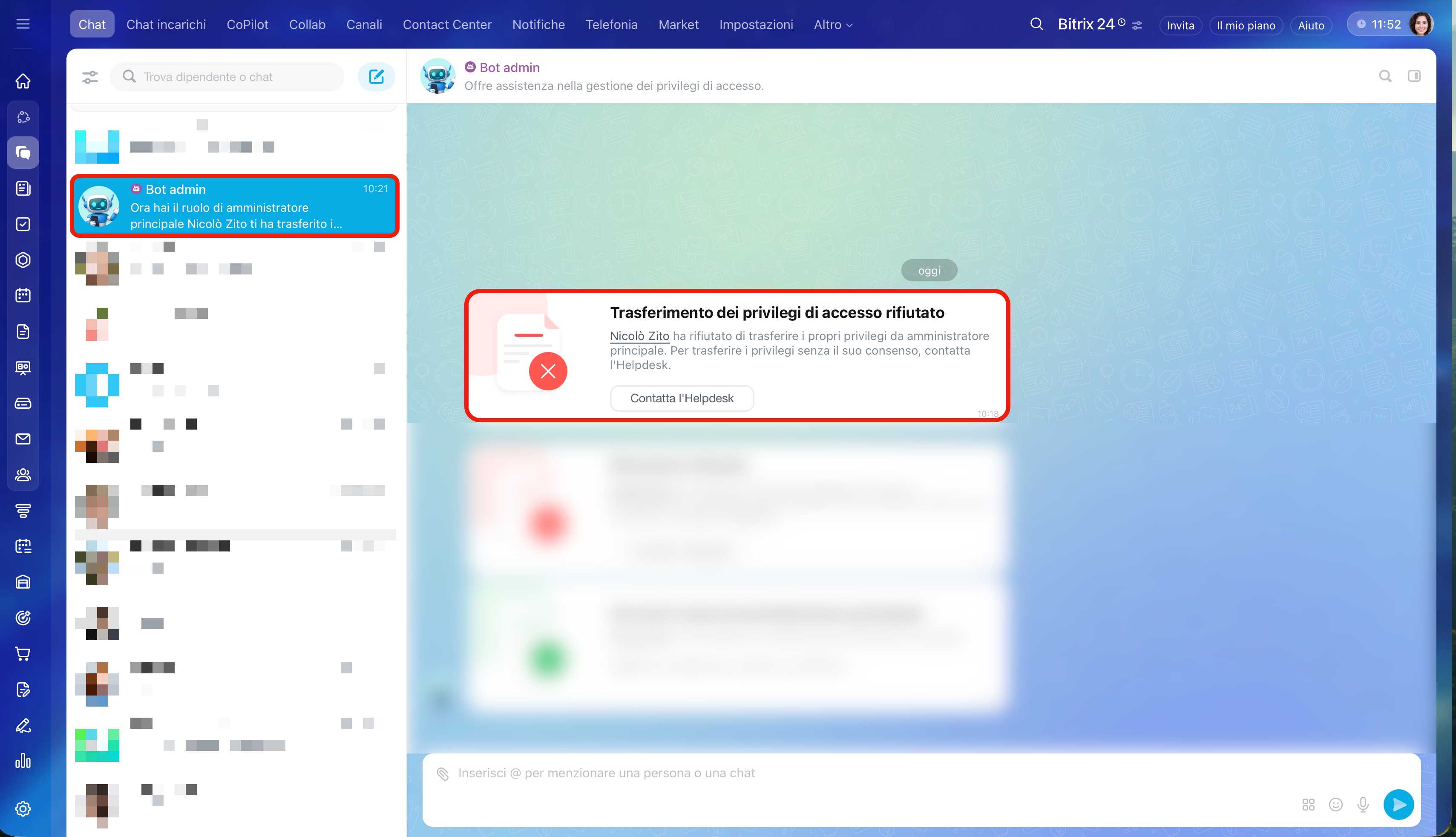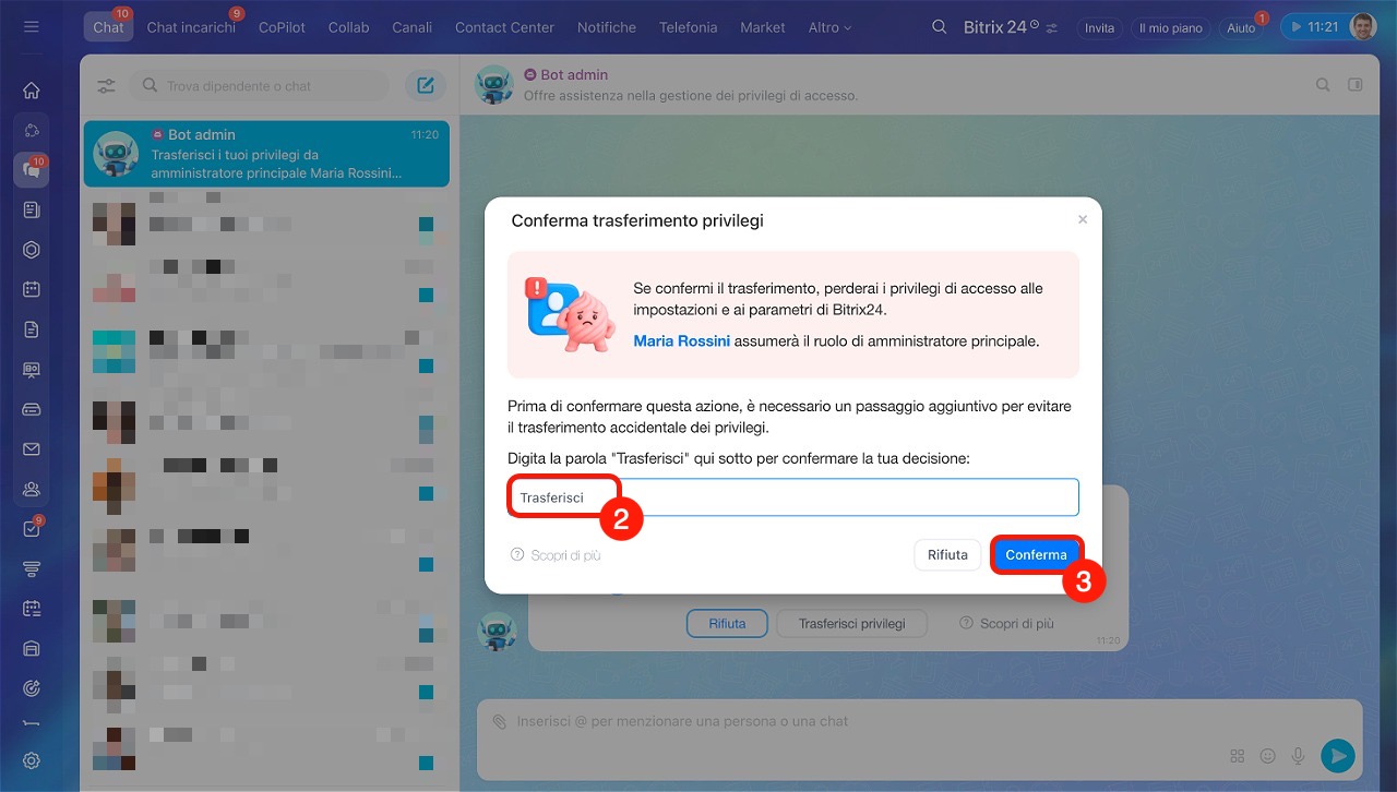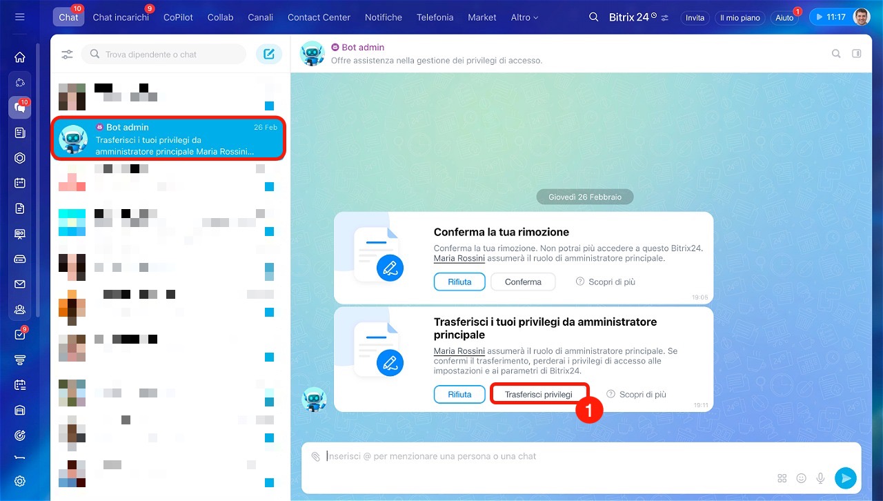 L'amministratore principale riceverà un messaggio dal Bot admin con la richiesta di trasferire i privilegi e le informazioni sul dipendente che ha inviato la richiesta.