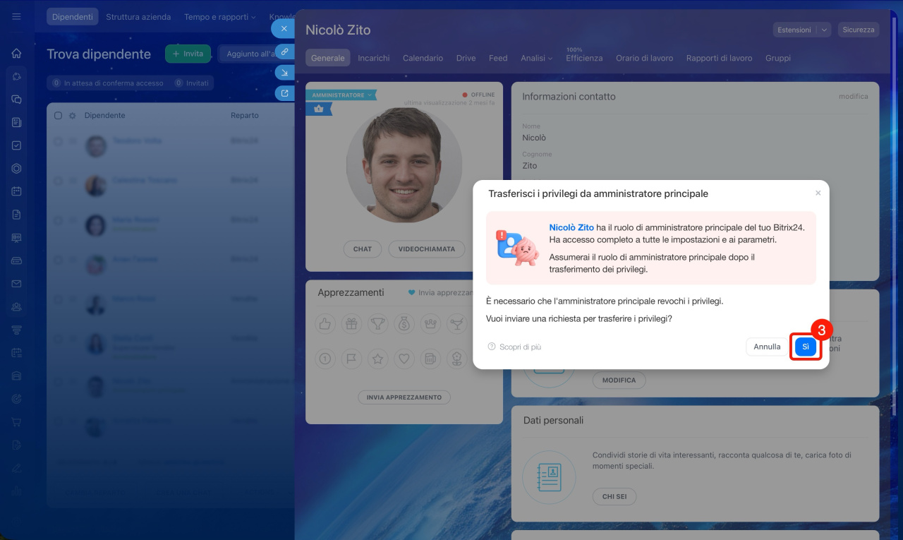 Il processo di trasferimento dei privilegi è lo stesso utilizzato in caso di rimozione dell’amministratore principale. Dopo la rimozione, l'amministratore principale non potrà più accedere al tuo Bitrix24.