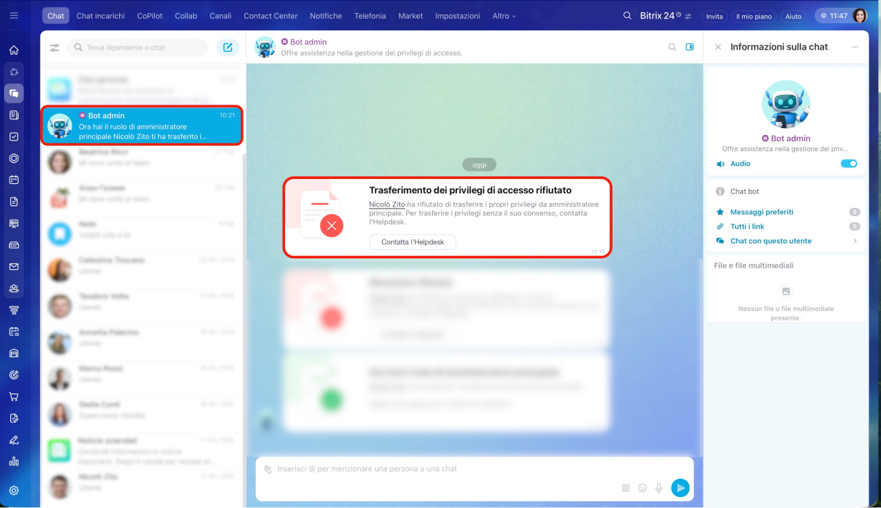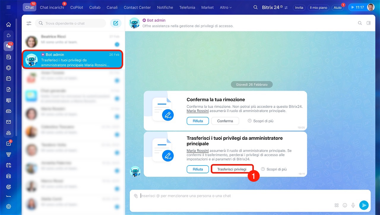 L'amministratore principale riceverà un messaggio dal Bot admin con la richiesta di trasferire i privilegi e le informazioni sul dipendente che ha inviato la richiesta.