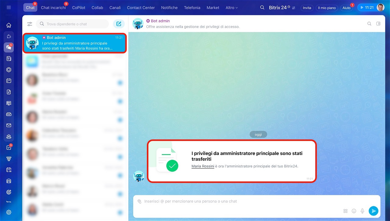 L'amministratore principale è il dipendente che ha creato il tuo Bitrix24. Riceve notifiche di sistema via e-mail, come il rinnovo del piano, notizie e inviti a webinar.