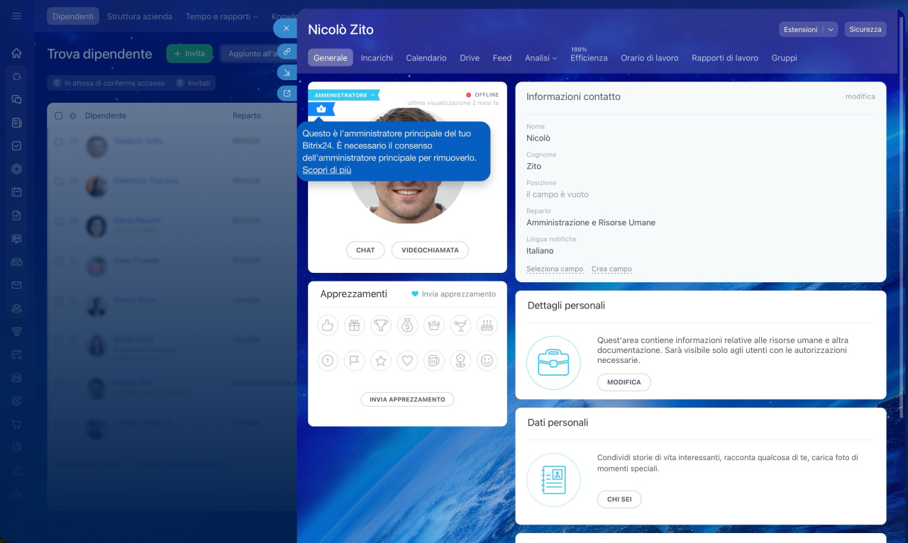 - L'amministratore principale è il dipendente che ha creato il tuo Bitrix24. Riceve notifiche di sistema via e-mail.