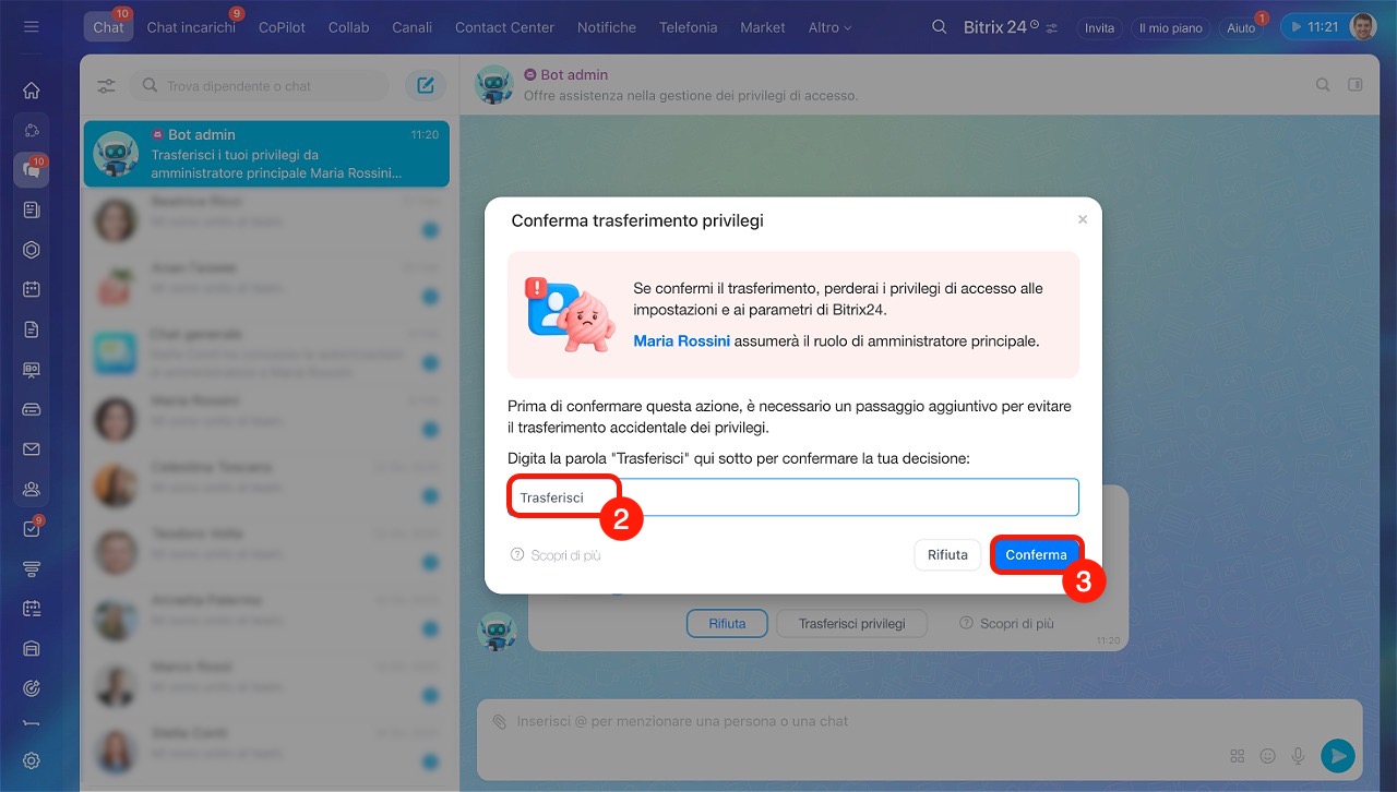 - Il processo di trasferimento dei privilegi e di rimozione è identico. Dopo la rimozione, l'amministratore principale non potrà più accedere al tuo Bitrix24.