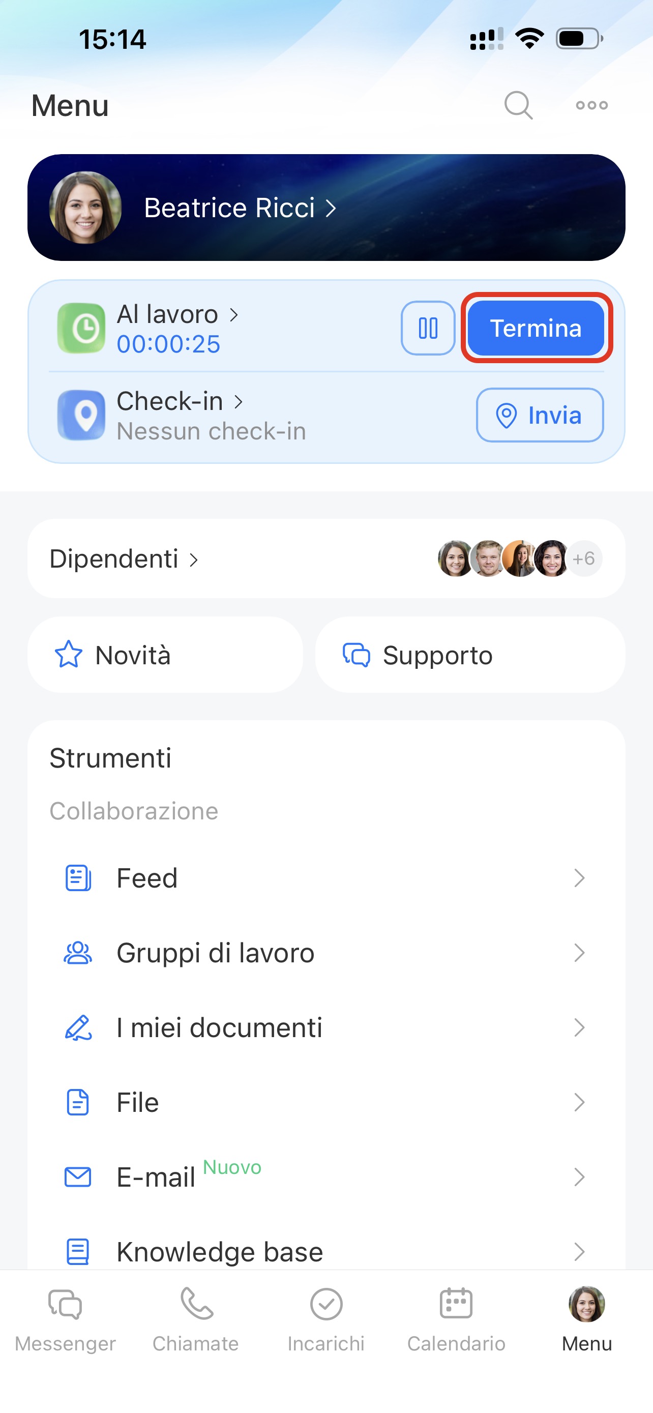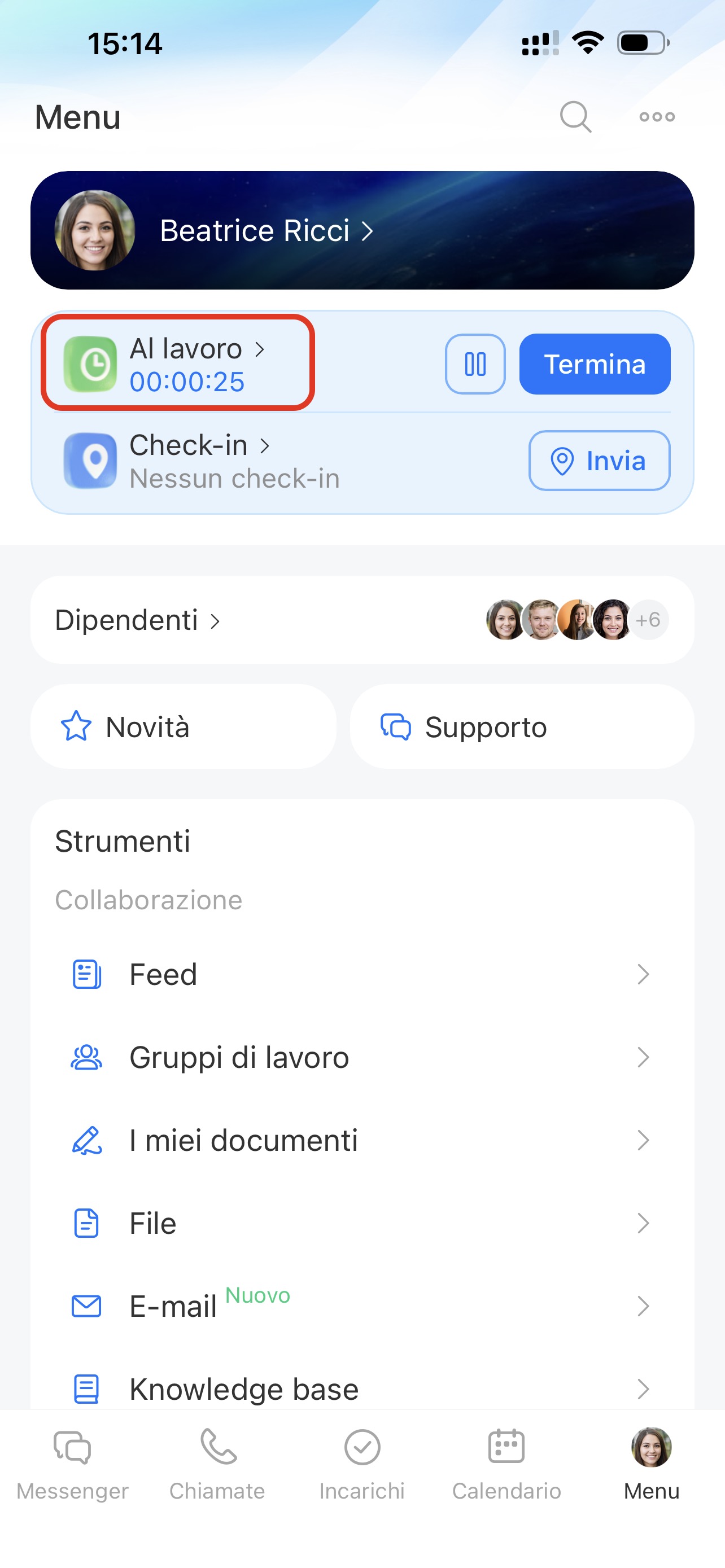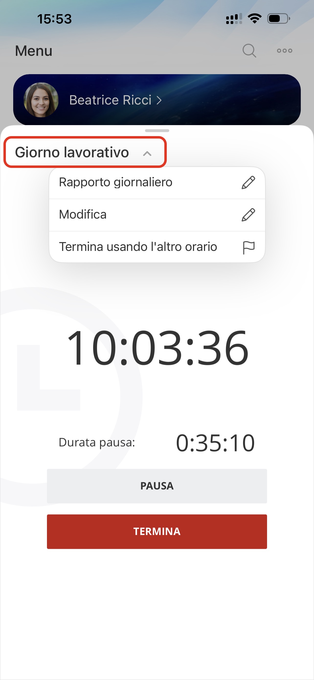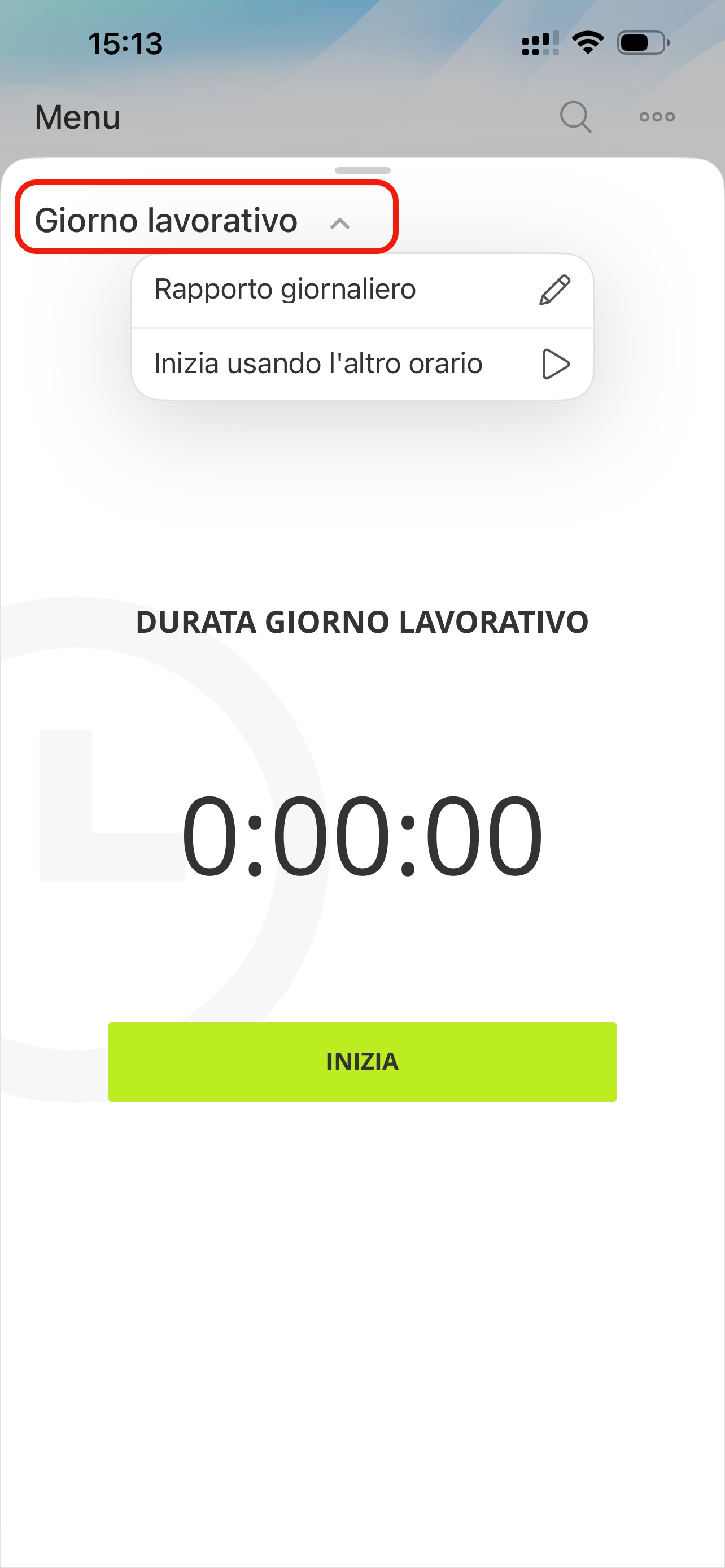 Applicazione mobile. Premi Menu e nel widget Giornata lavorativa premi Inizia. Alla fine della giornata lavorativa premi Termina.