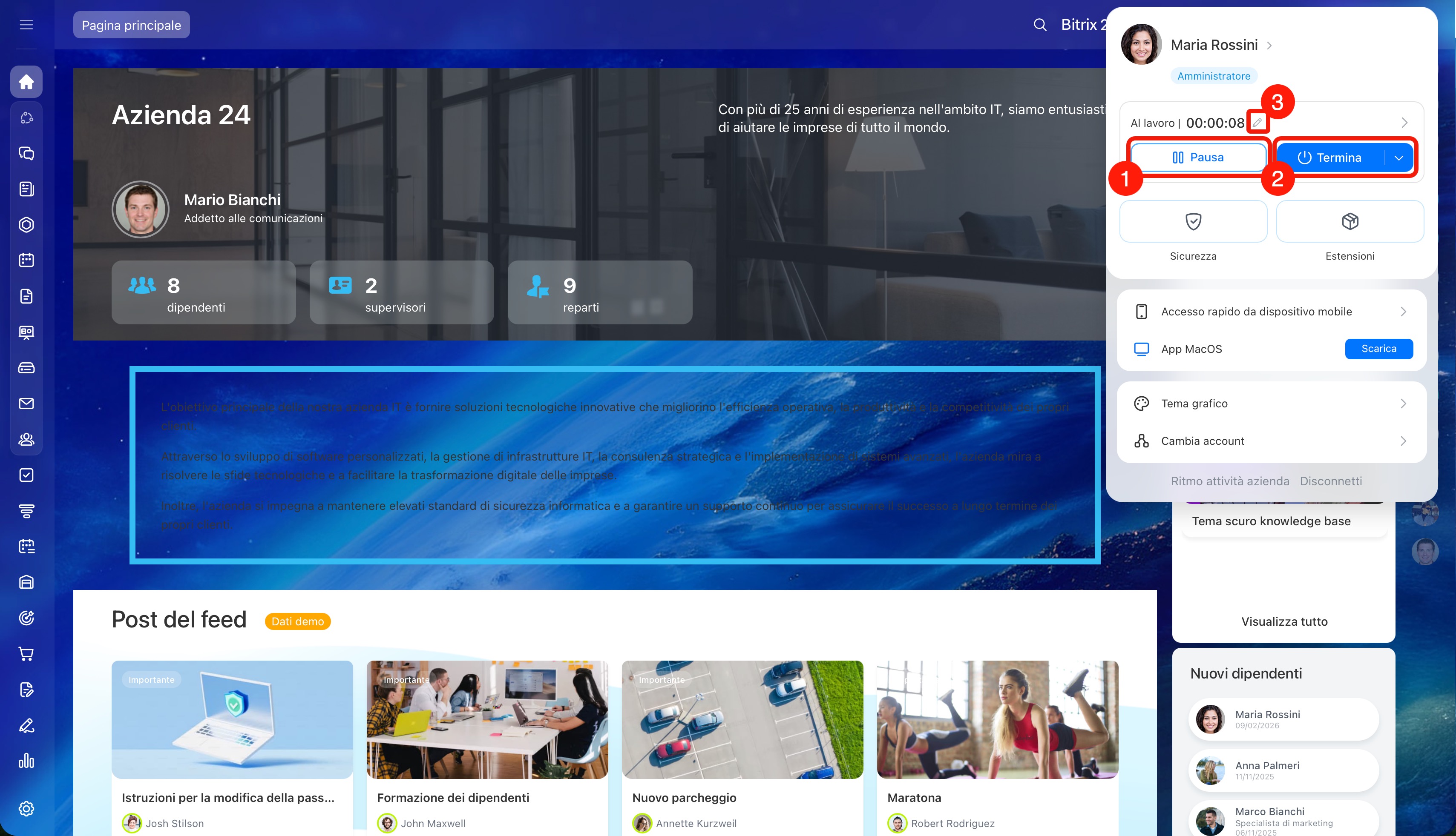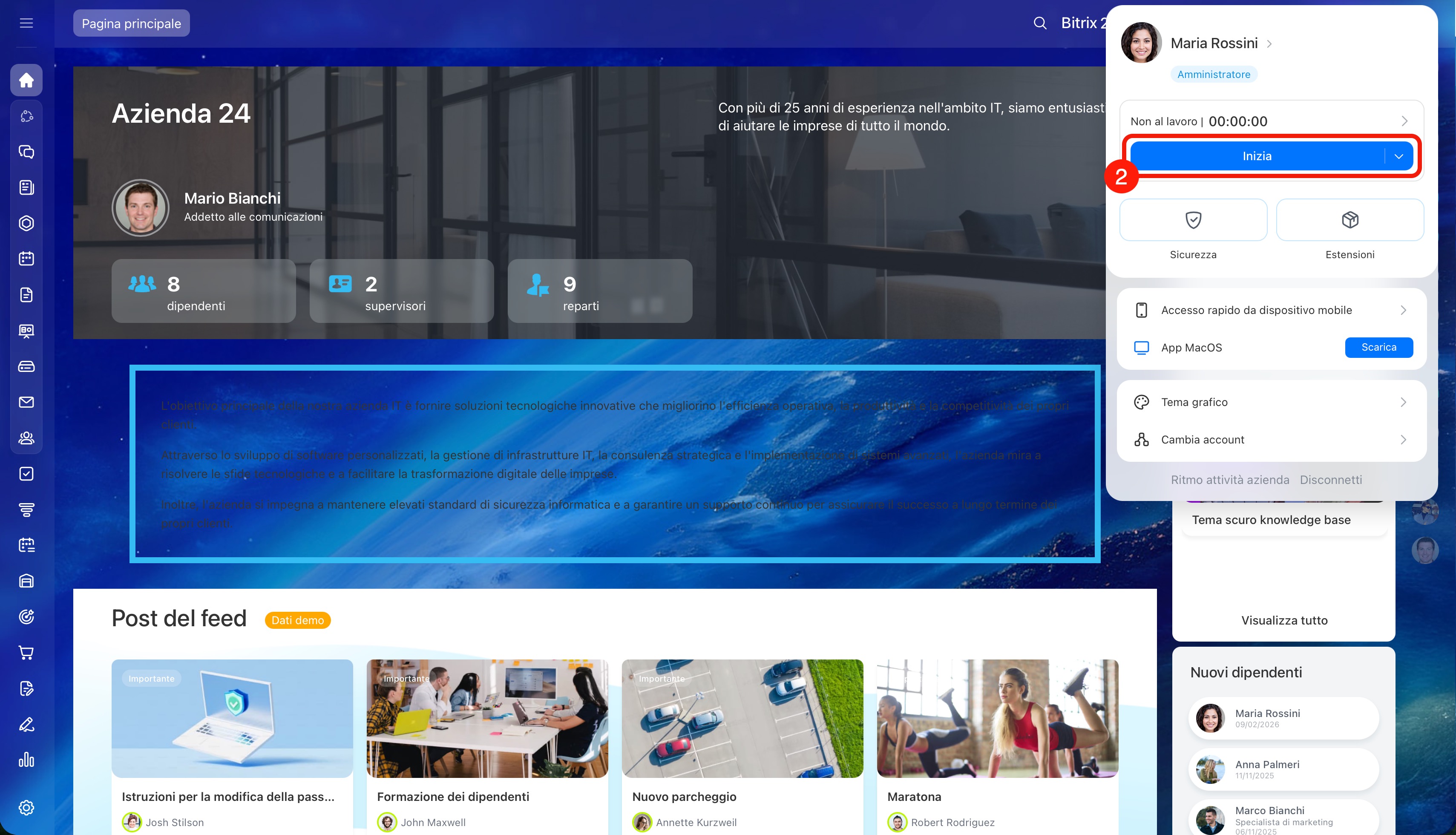 Iniziare la giornata lavorativa. Per avviare il monitoraggio della giornata lavorativa, fai clic sulla tua foto nell'angolo in alto a destra (1) e seleziona Inizia (2).