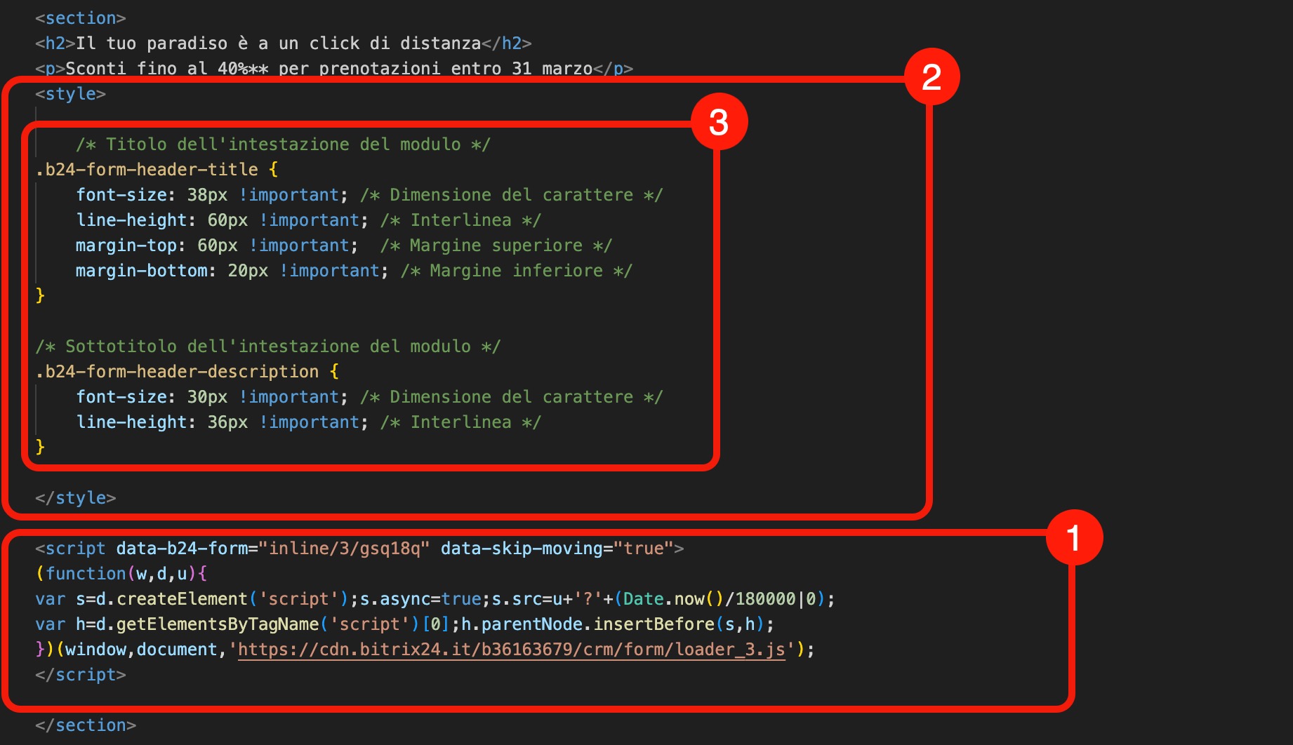 Il testo tra i tag /* e */ è un commento che aiuta a orientarsi nel codice e non influisce sull’aspetto del modulo CRM. Puoi lasciarlo oppure eliminarlo.