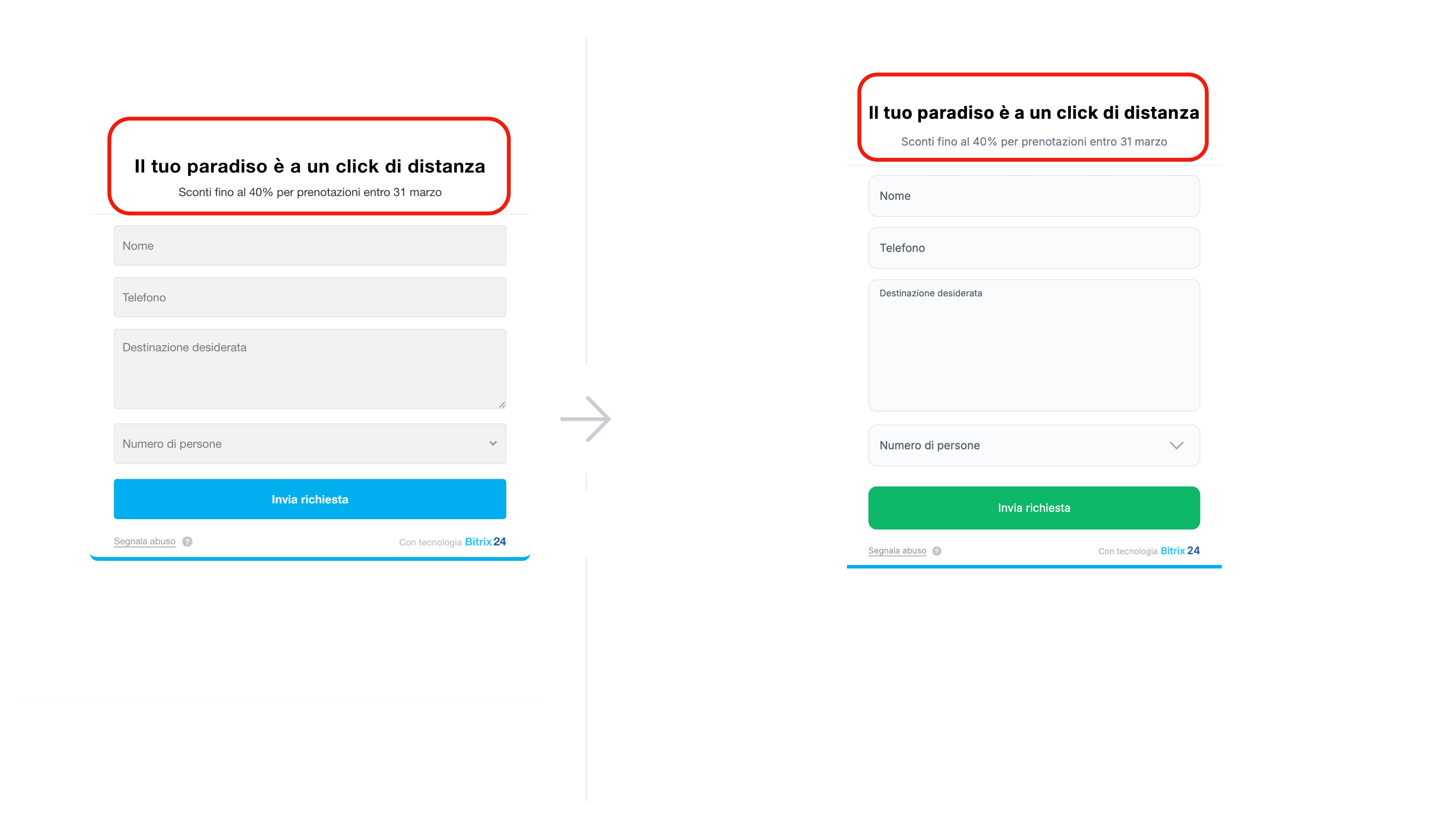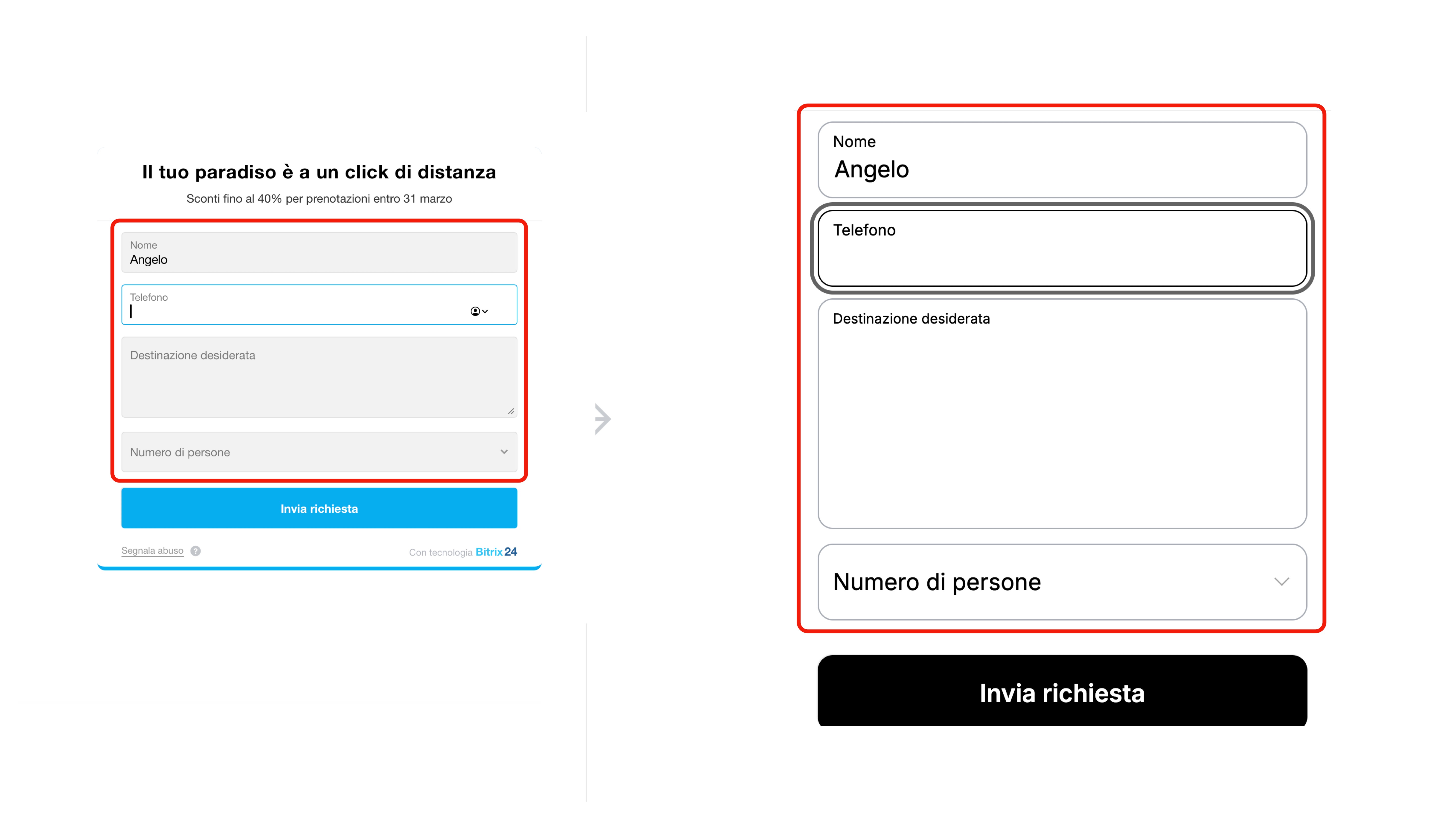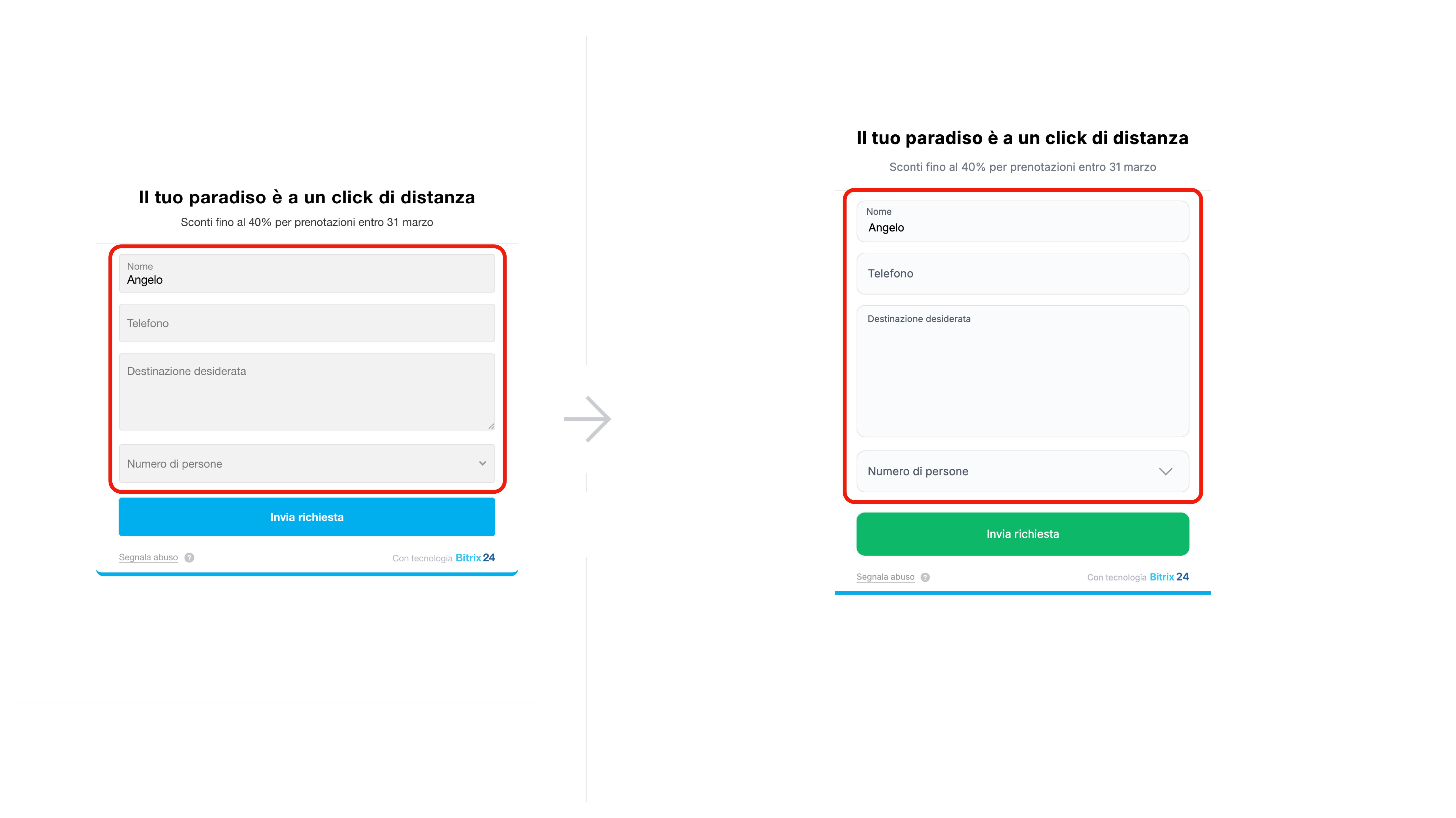 I moduli in Bitrix24 vengono creati e configurati nell’editor integrato. Se i parametri standard non sono sufficienti, l’aspetto del modulo può essere modificato con CSS. Ad esempio, puoi cambiare la dimensione del carattere, il colore del testo e dello sfondo, lo stile dei pulsanti, configurare il bordo e l’arrotondamento dei campi. Questo aiuta ad adattare il modulo al design del progetto e a renderlo più comodo per gli utenti.
