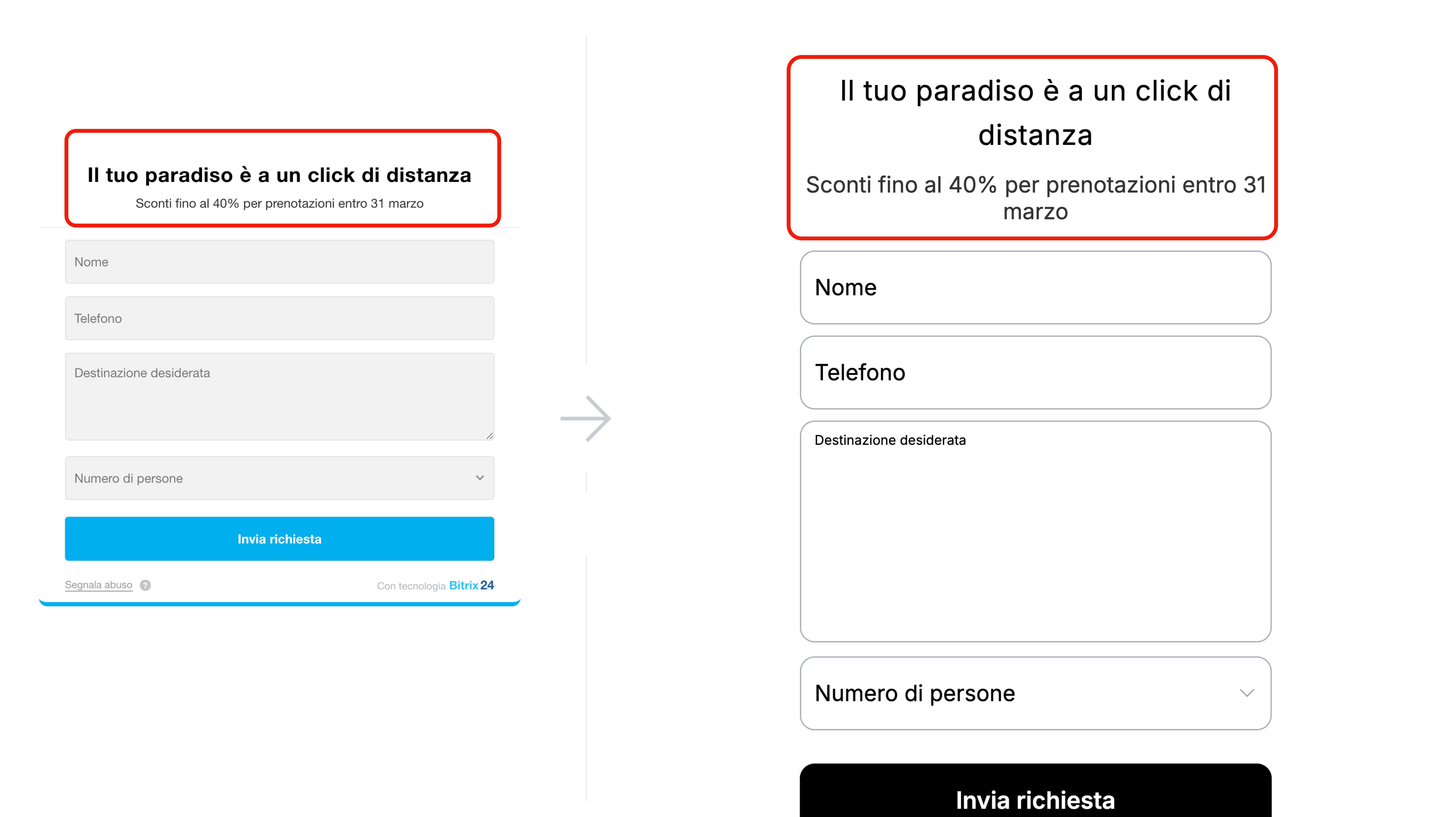 Titolo e sottotitolo del modulo. Aumenta la dimensione del carattere, l’interlinea e lo spazio dopo il titolo per rendere il testo più leggibile.