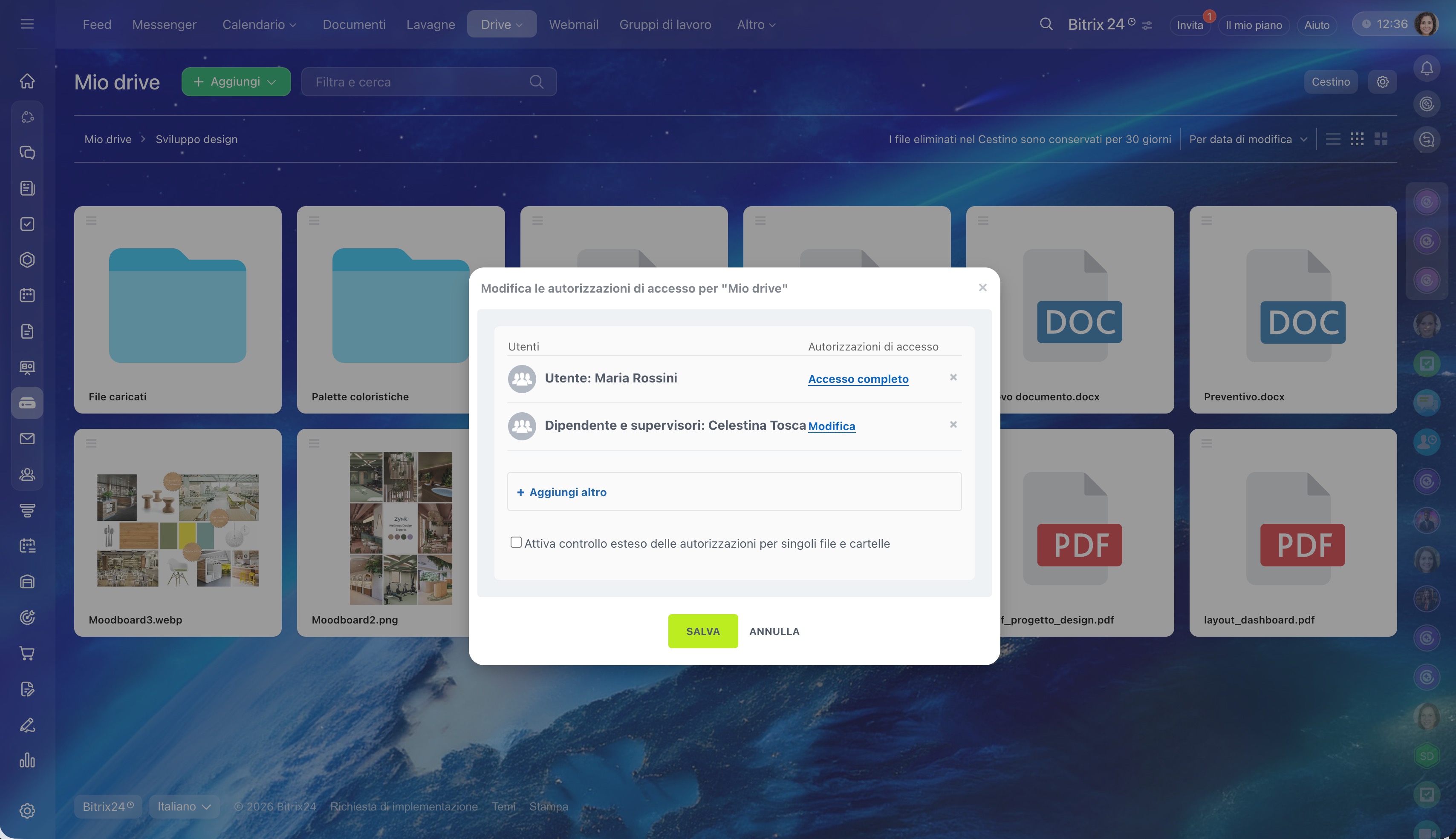 In Bitrix24 è possibile configurare in modo flessibile le autorizzazioni di accesso a file, cartelle o contenuti di ogni Drive. Ad esempio, consentire ai dipendenti di visualizzare una cartella e a un responsabile di modificare i documenti.