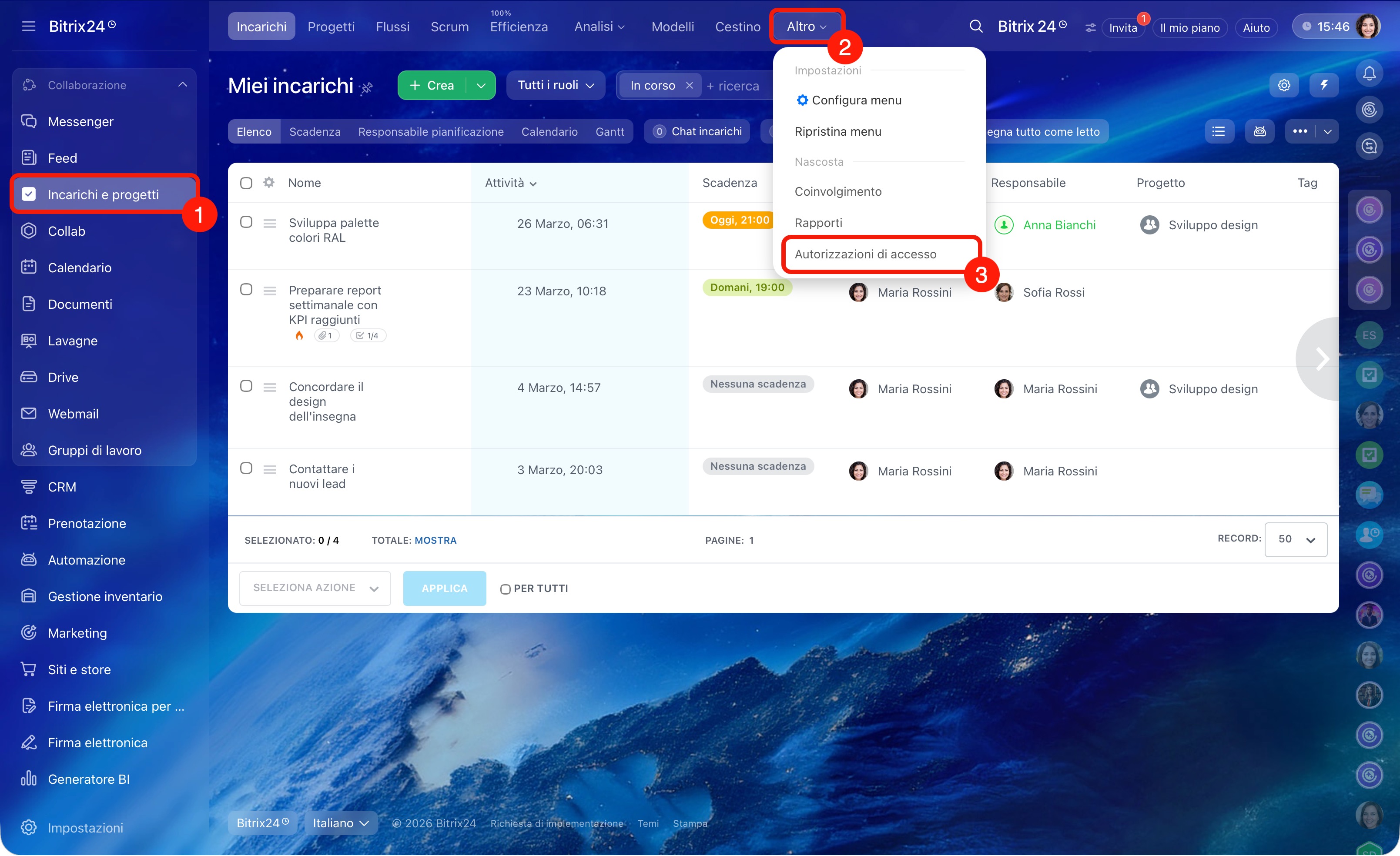 Per impostazione predefinita le autorizzazioni di accesso possono essere configurate dall’amministratore di Bitrix24, ma può concedere questo diritto anche ad altri dipendenti. Per configurare le autorizzazioni apri Incarichi e progetti > Altro > Autorizzazioni di accesso. I