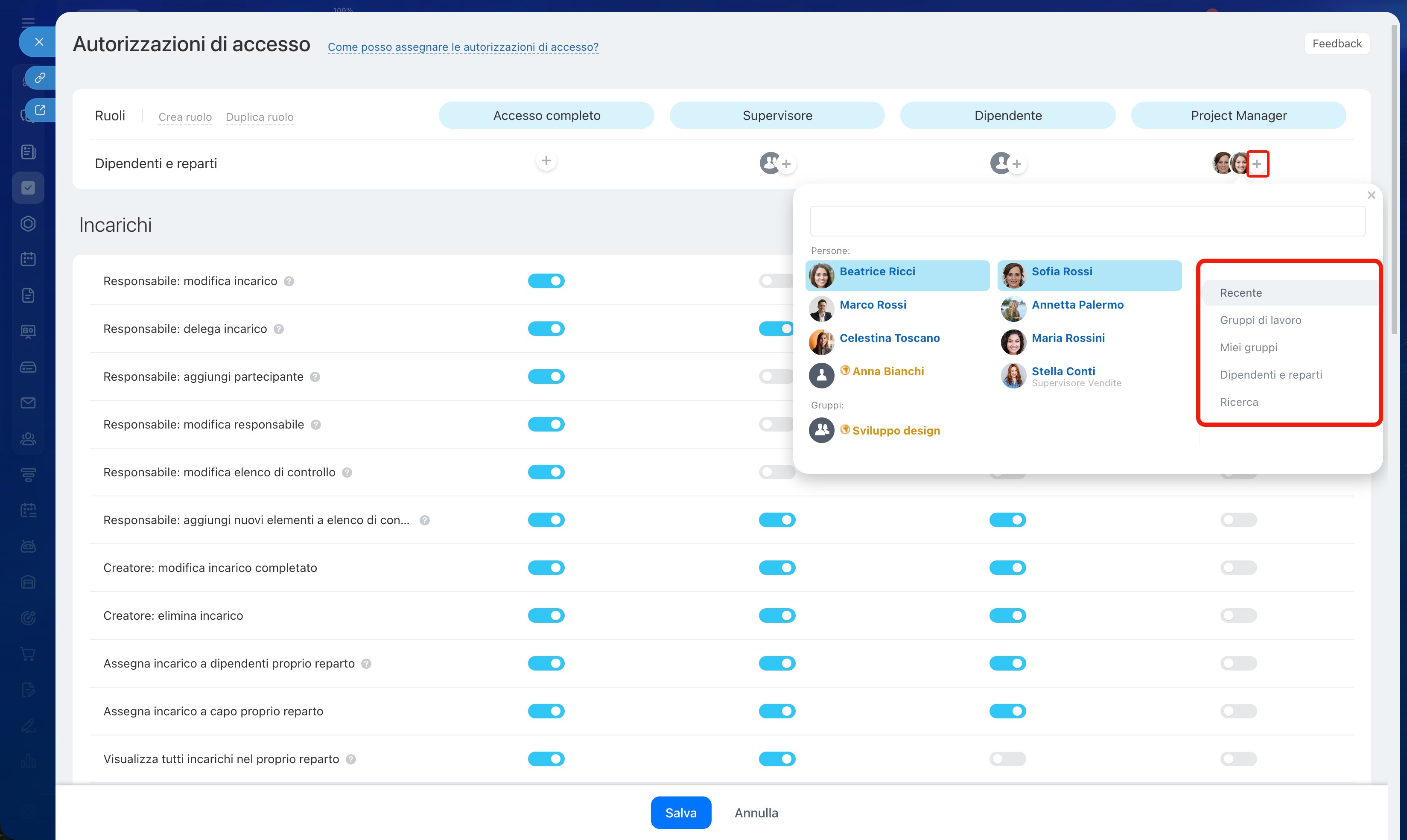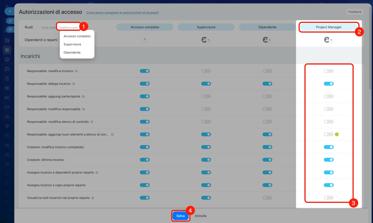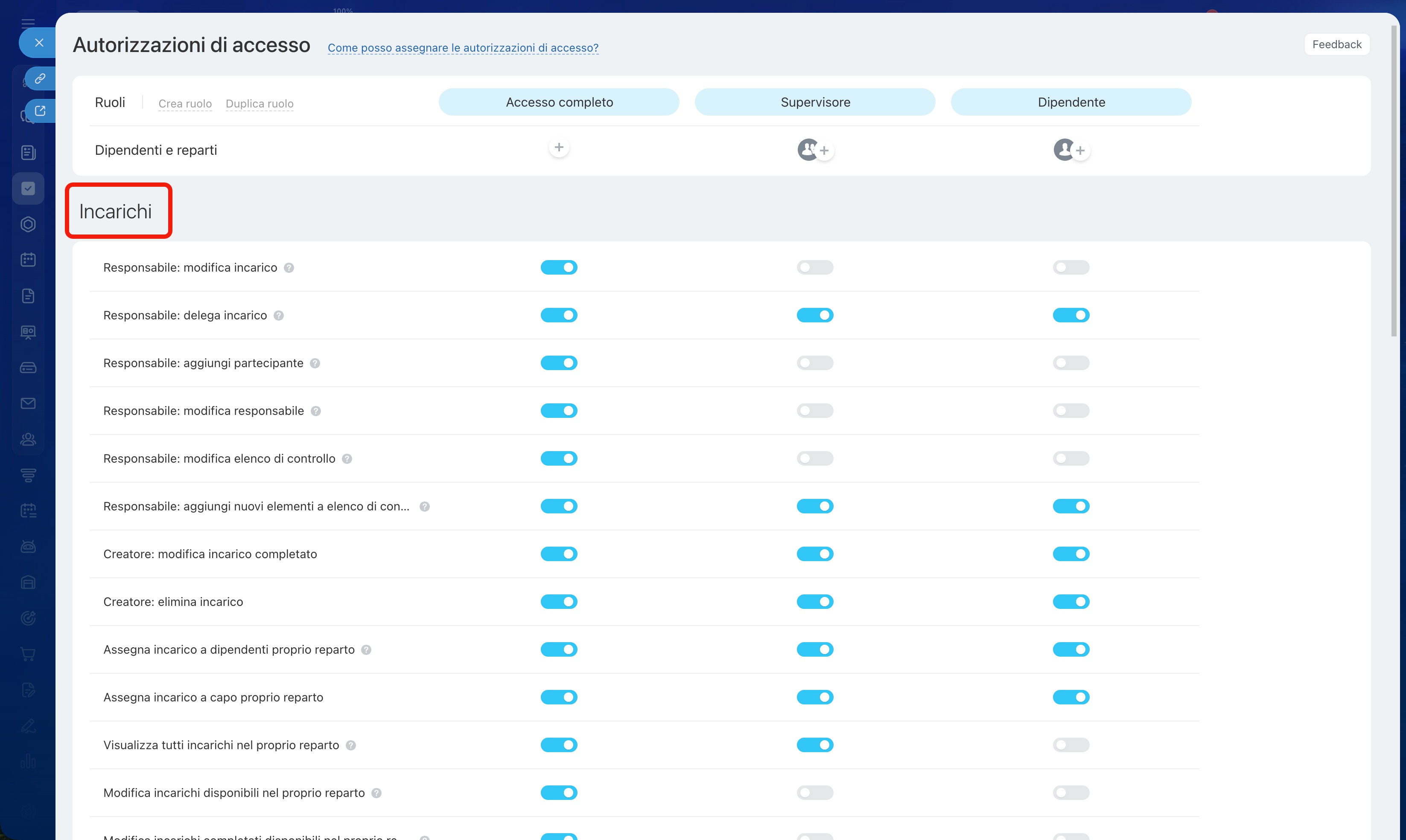 Nelle impostazioni di ogni ruolo è possibile configurare le autorizzazioni per diversi strumenti nella sezione Incarichi e progetti.