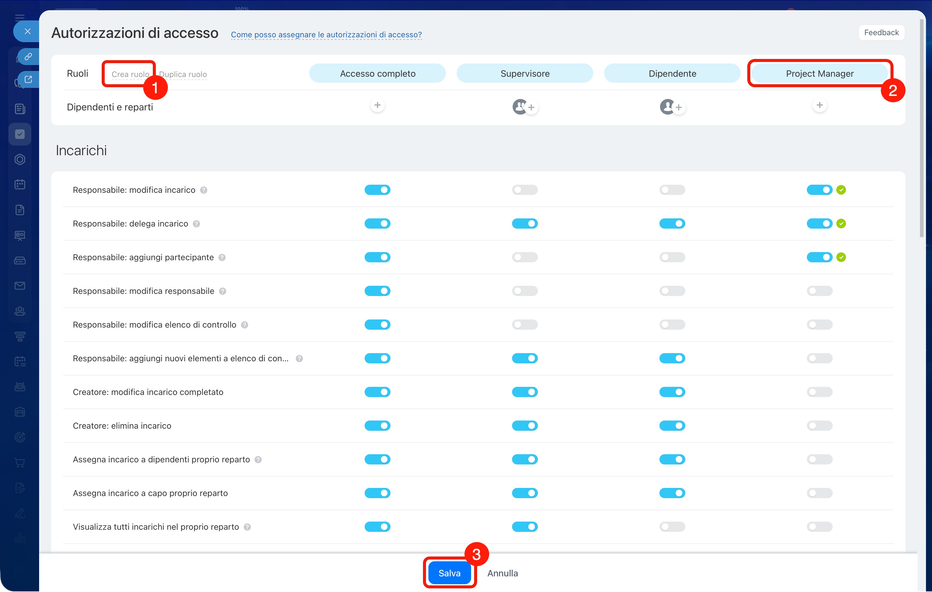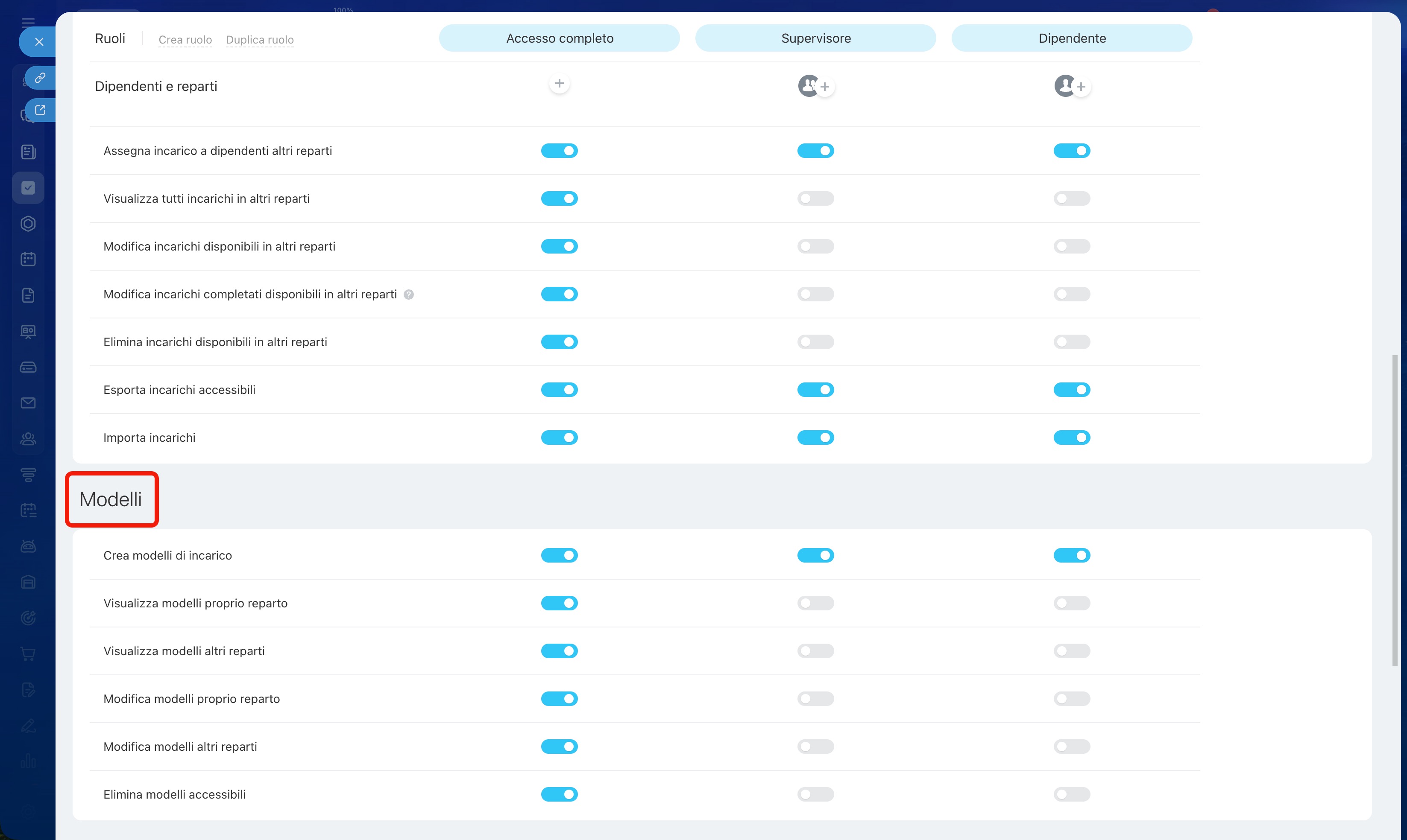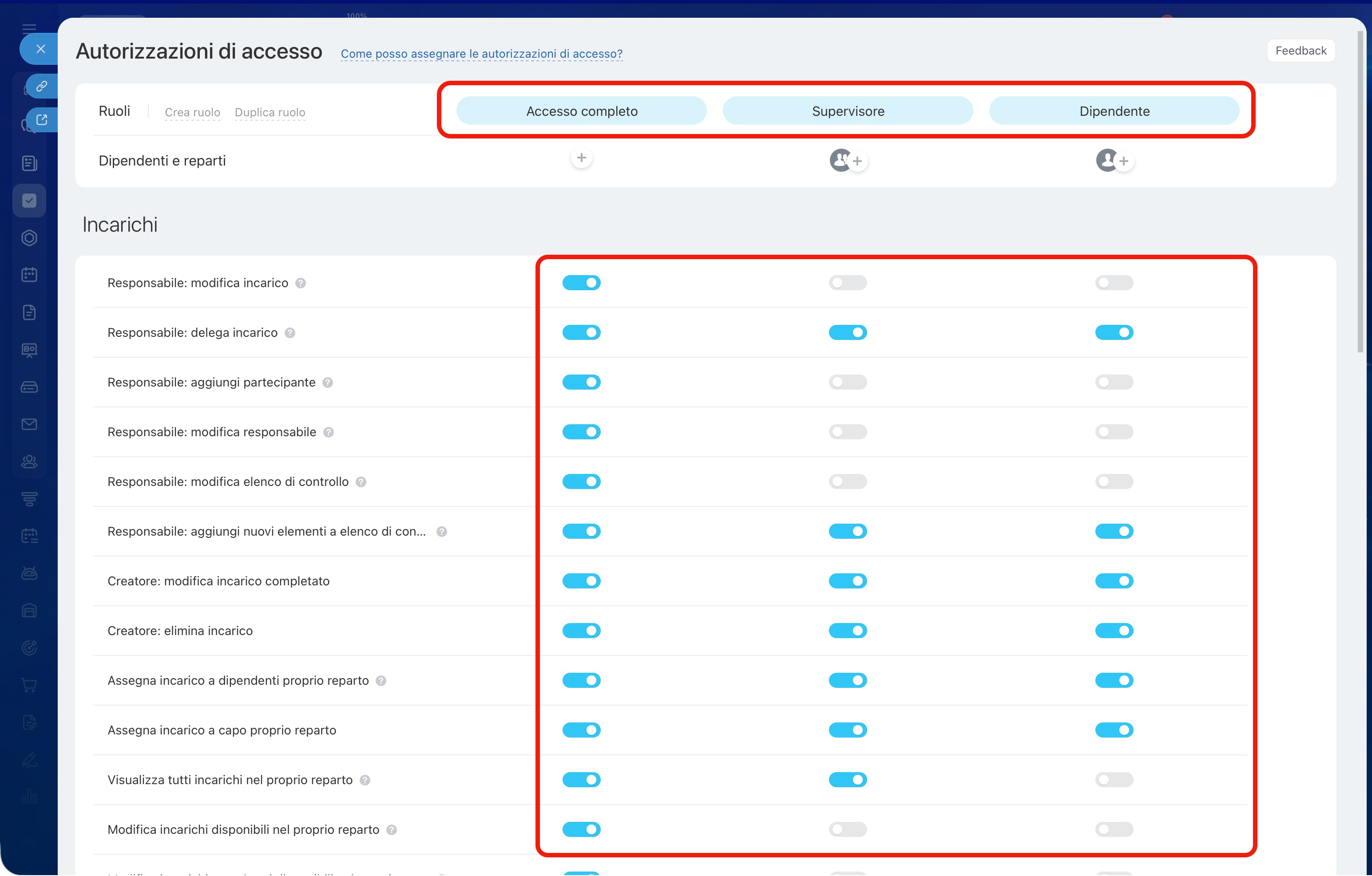 Nelle impostazioni di ogni ruolo è possibile configurare le autorizzazioni per diversi strumenti nella sezione Incarichi e progetti.