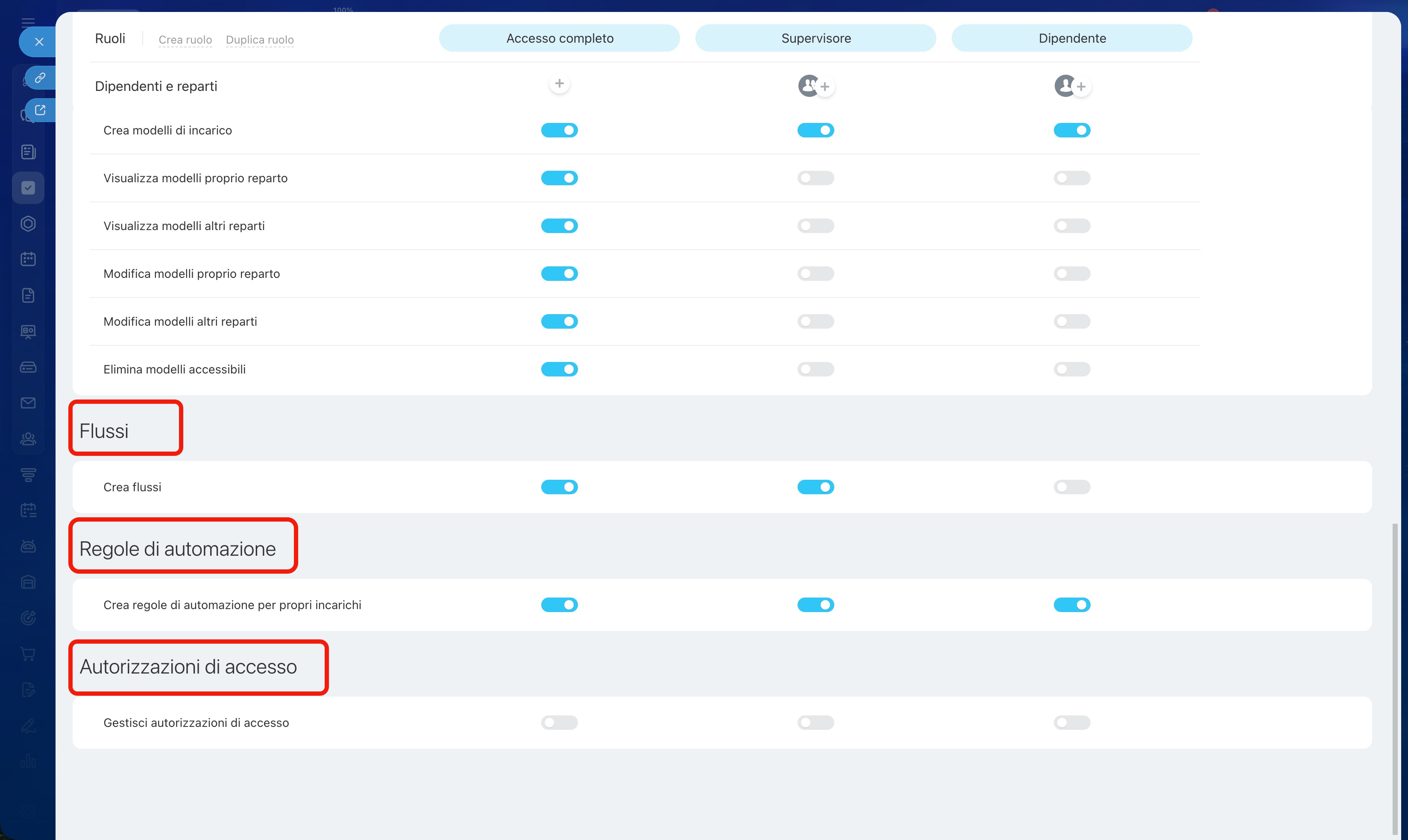 - Le autorizzazioni di accesso determinano chi può gestire incarichi, modelli, flussi e regole di automazione e chi può solo assegnare ed eseguire incarichi.