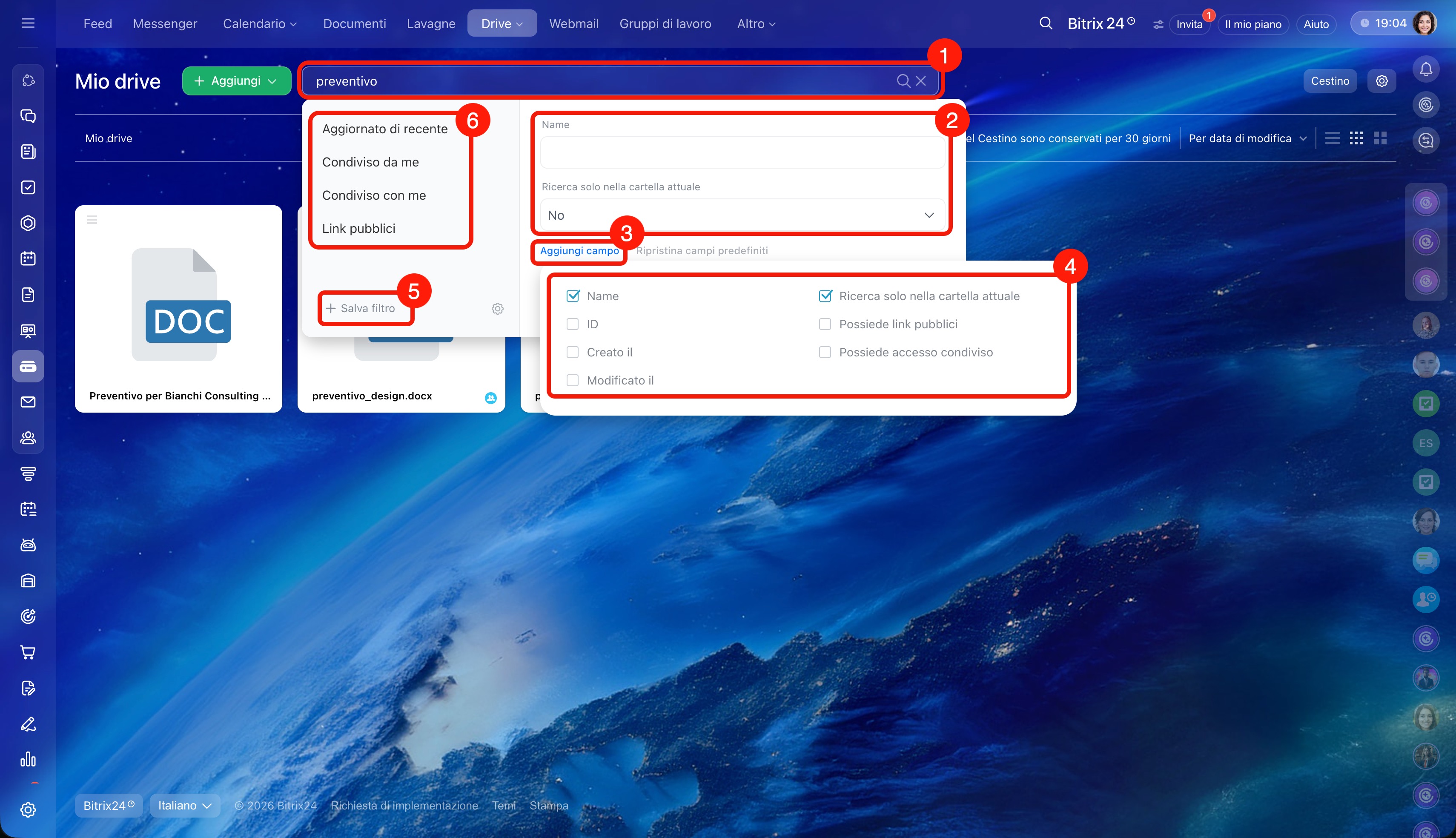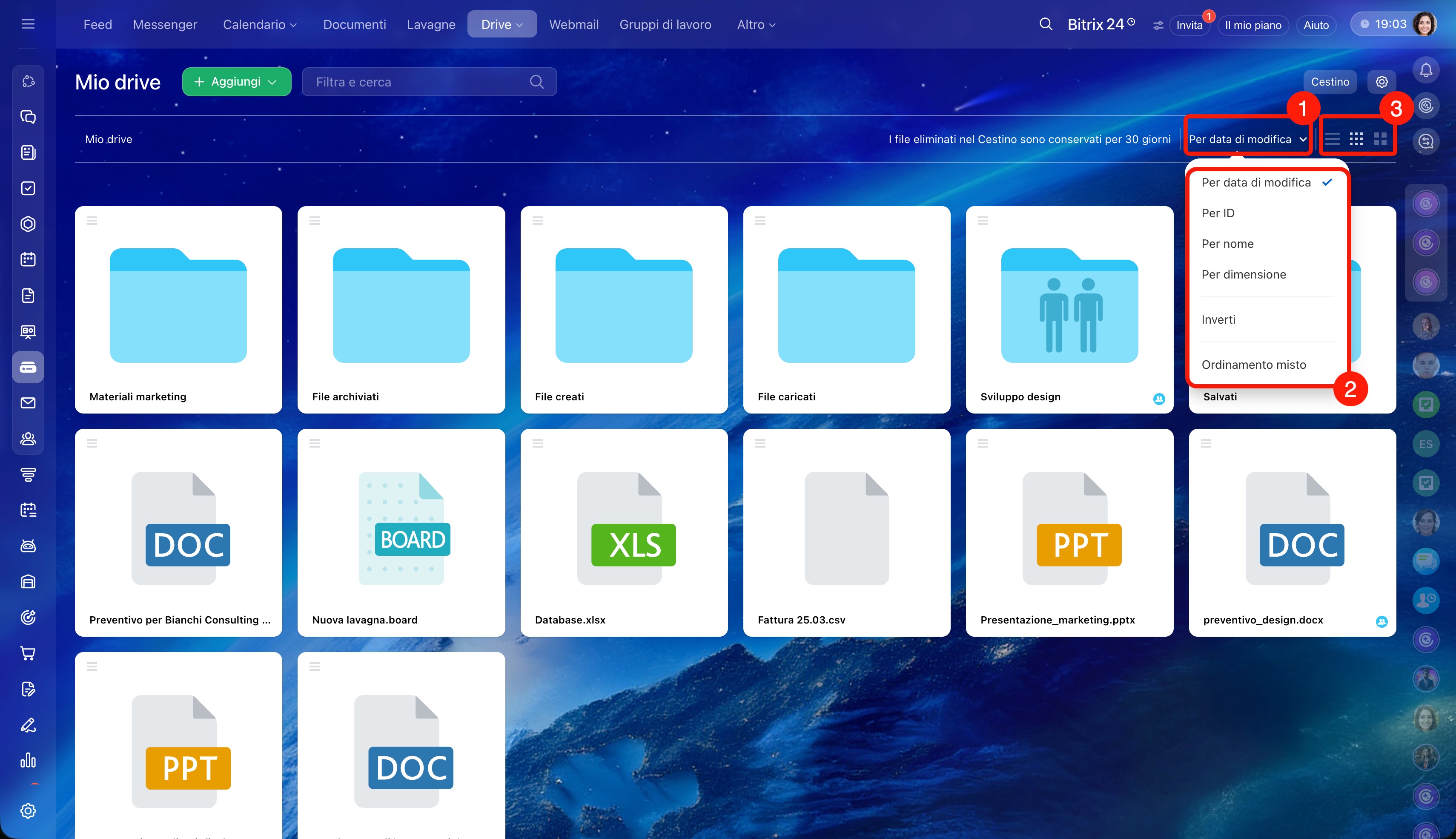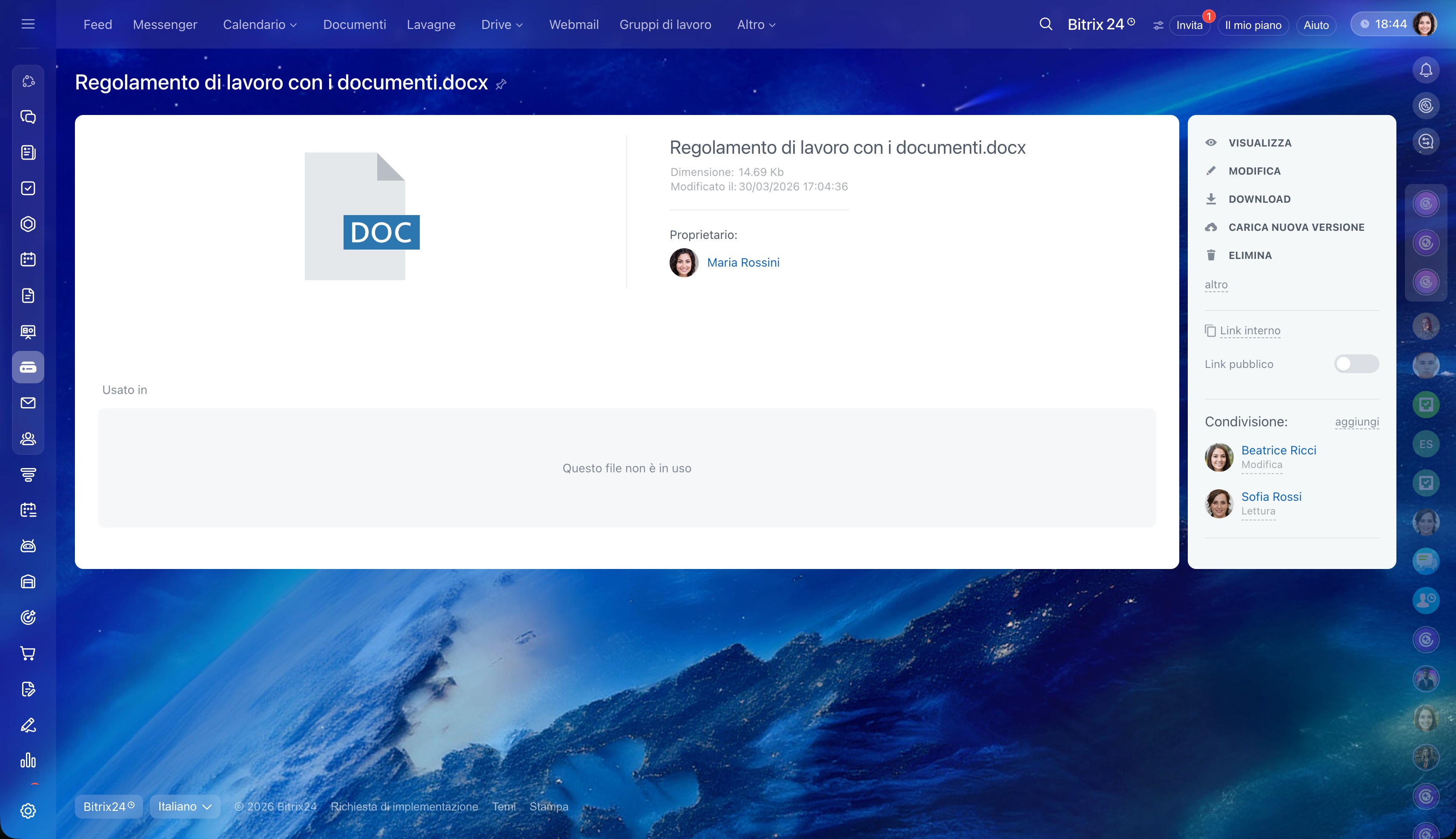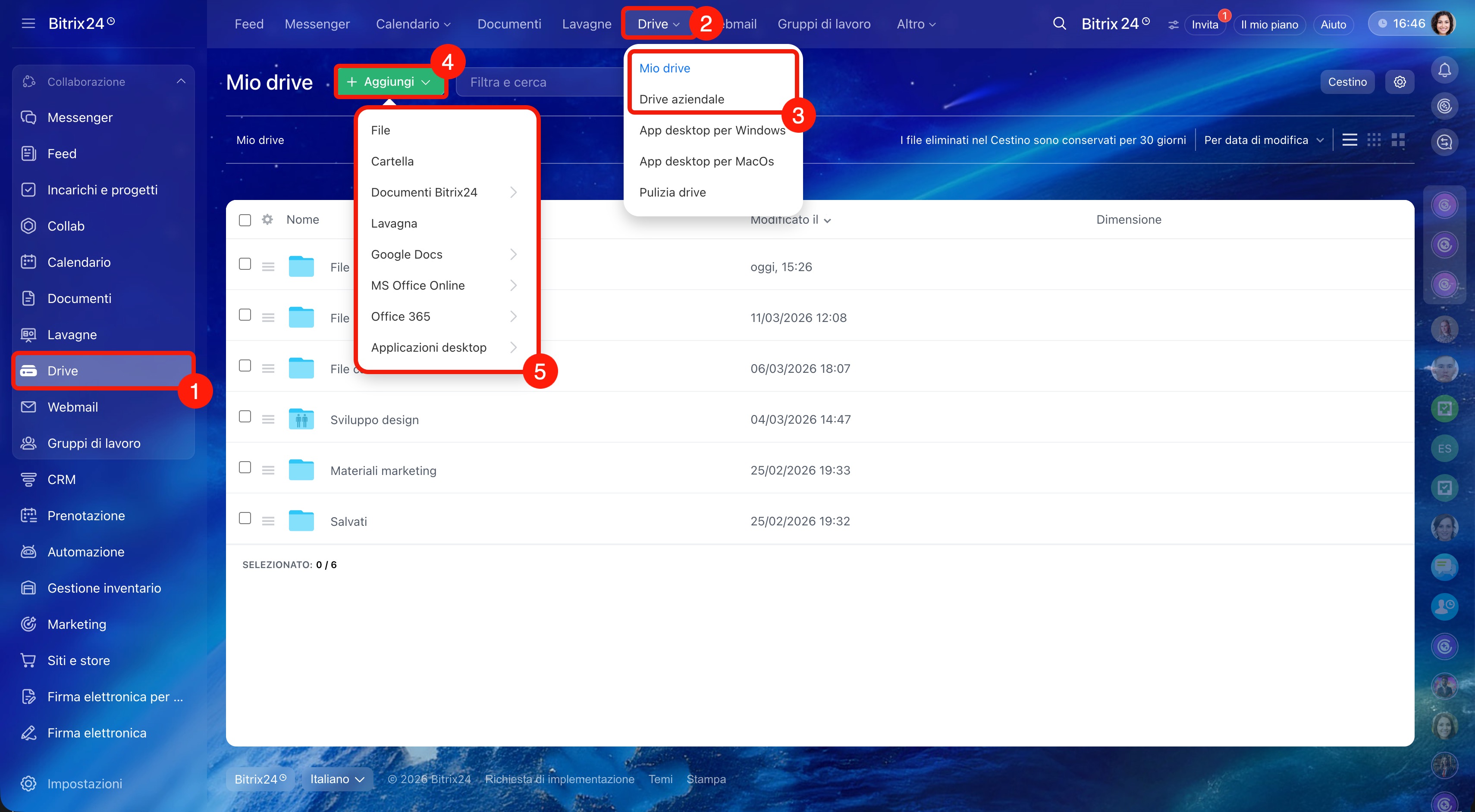- Bitrix24 Drive aiuta ad archiviare i file e a lavorarci autonomamente oppure con altri utenti di Bitrix24 sul computer e nell’applicazione mobile.