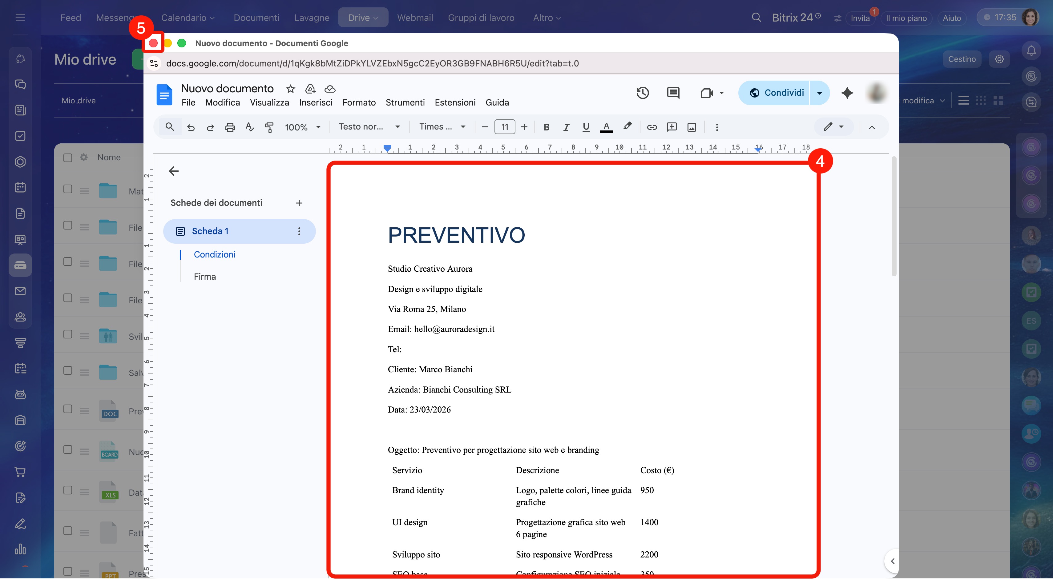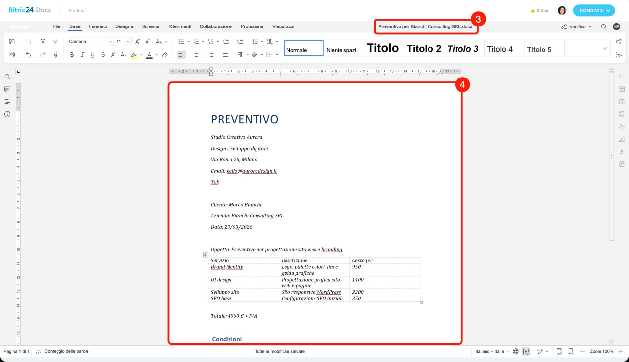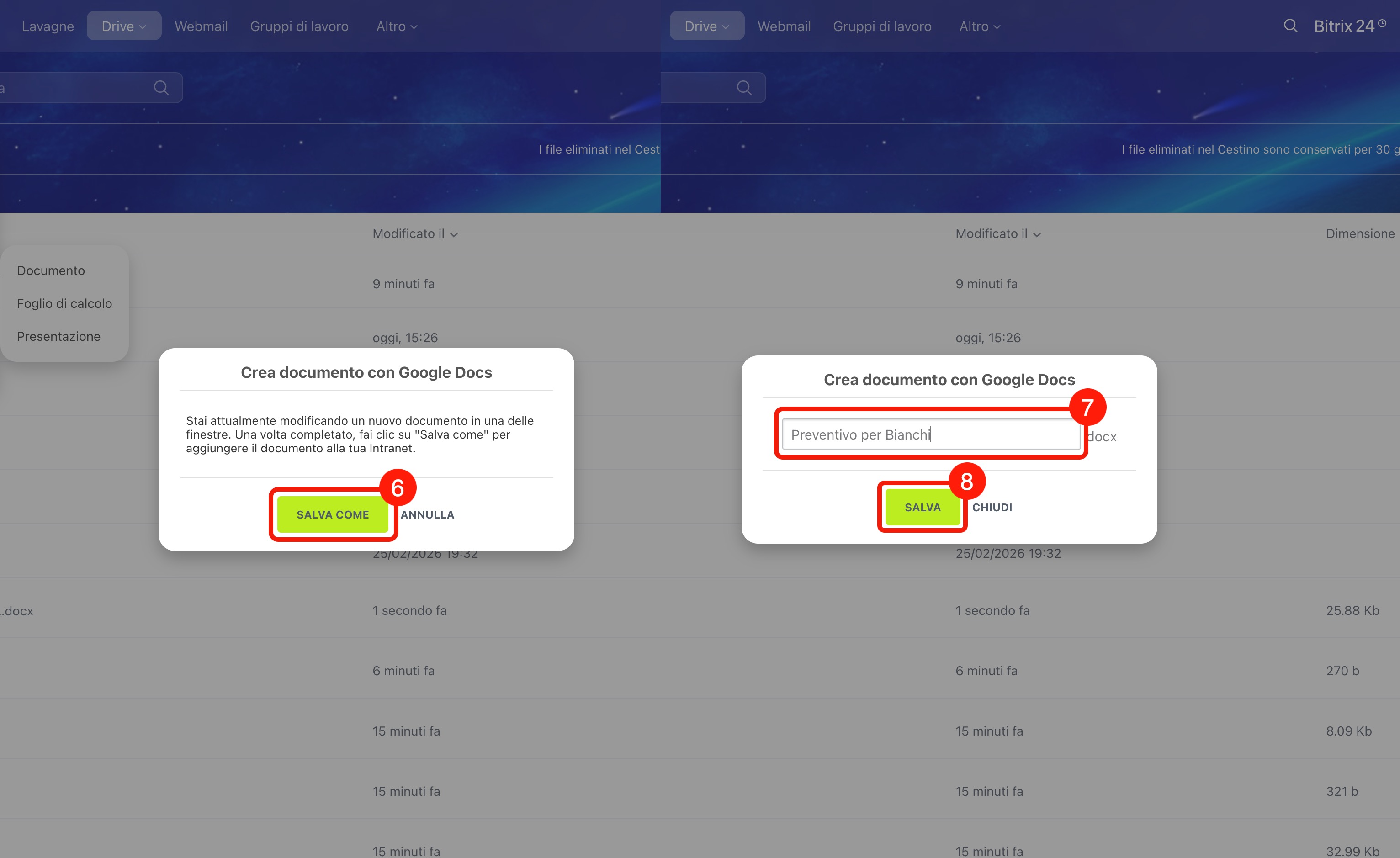 6–8. Fai clic su Salva come, inserisci il nome del documento e salva le modifiche: il file verrà aggiunto a Bitrix24.