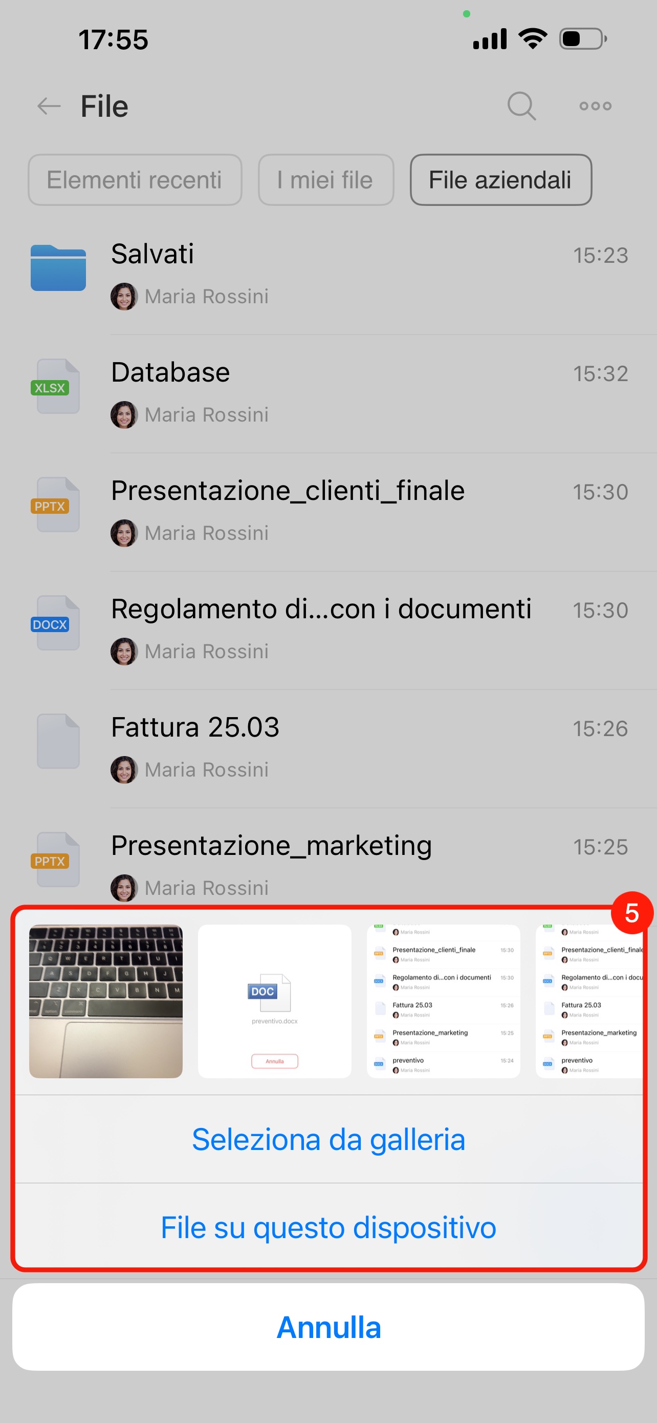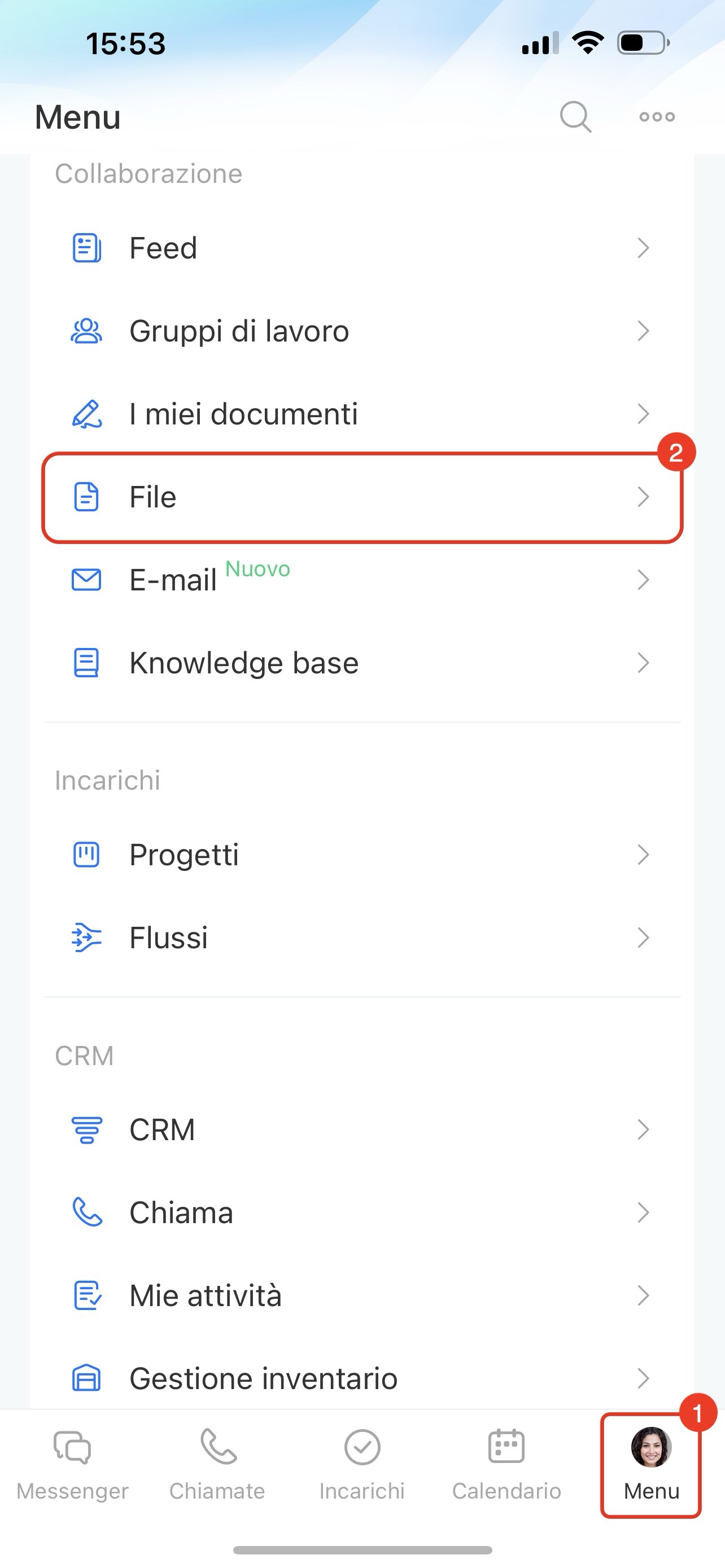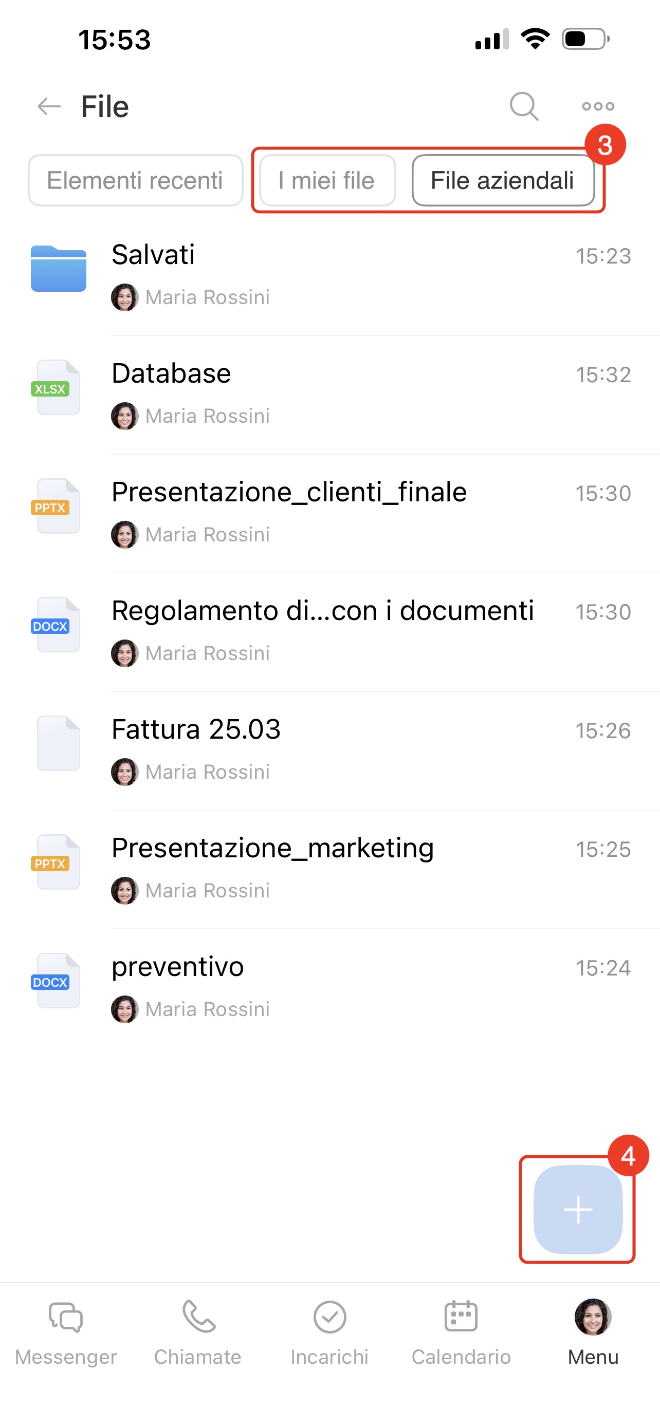 2–3. Tocca File e vai alla scheda I miei file per aggiungere un file al Drive personale oppure File aziendali per aggiungerlo al Drive aziendale.