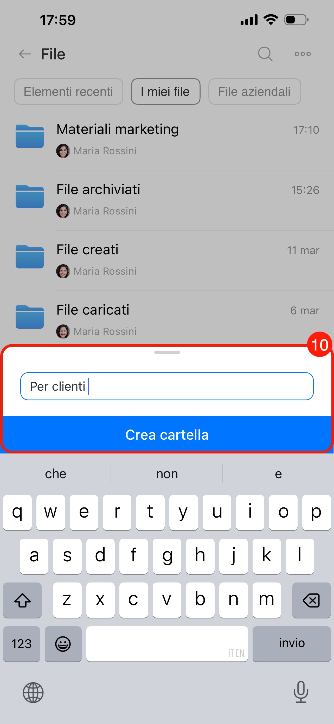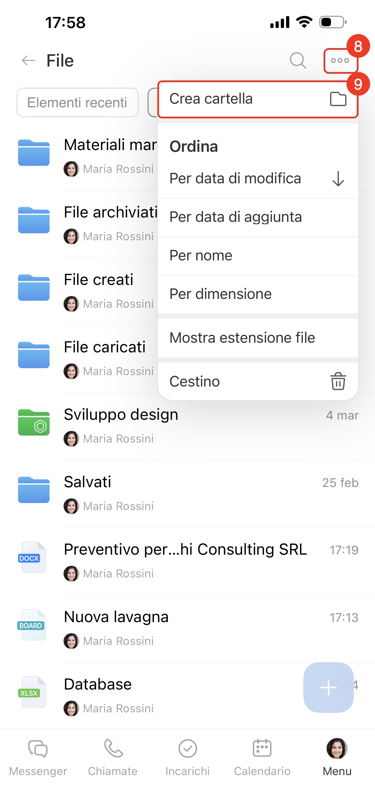 8–10. Per creare una cartella, tocca in alto a destra Tre punti (...) > Crea cartella, inserisci il nome e conferma l’azione.