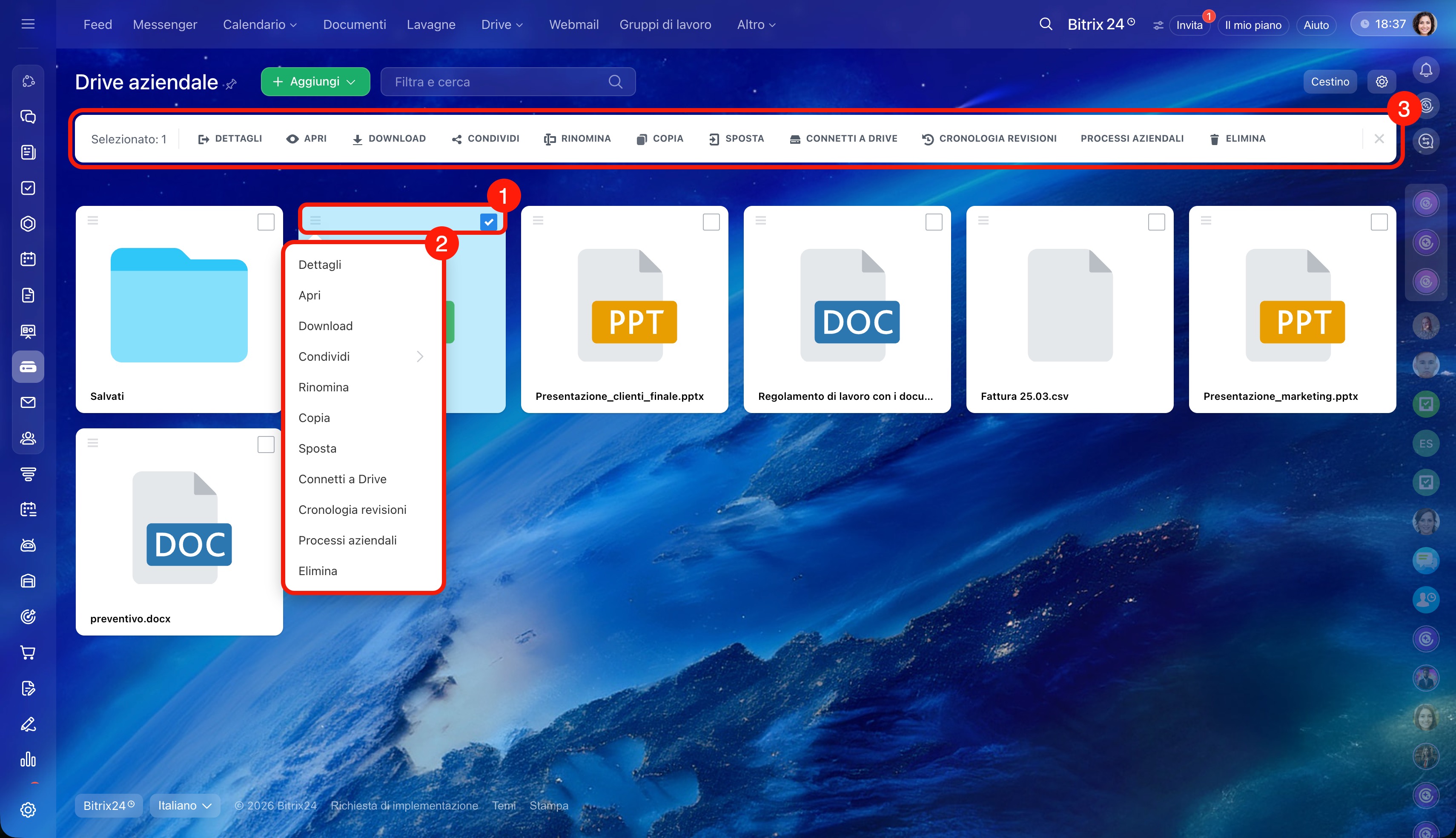- Per passare alla gestione di un file o di una cartella in Bitrix24 sul computer, selezionali e scegli le azioni. Nell’applicazione mobile, tieni premuto il file necessario.