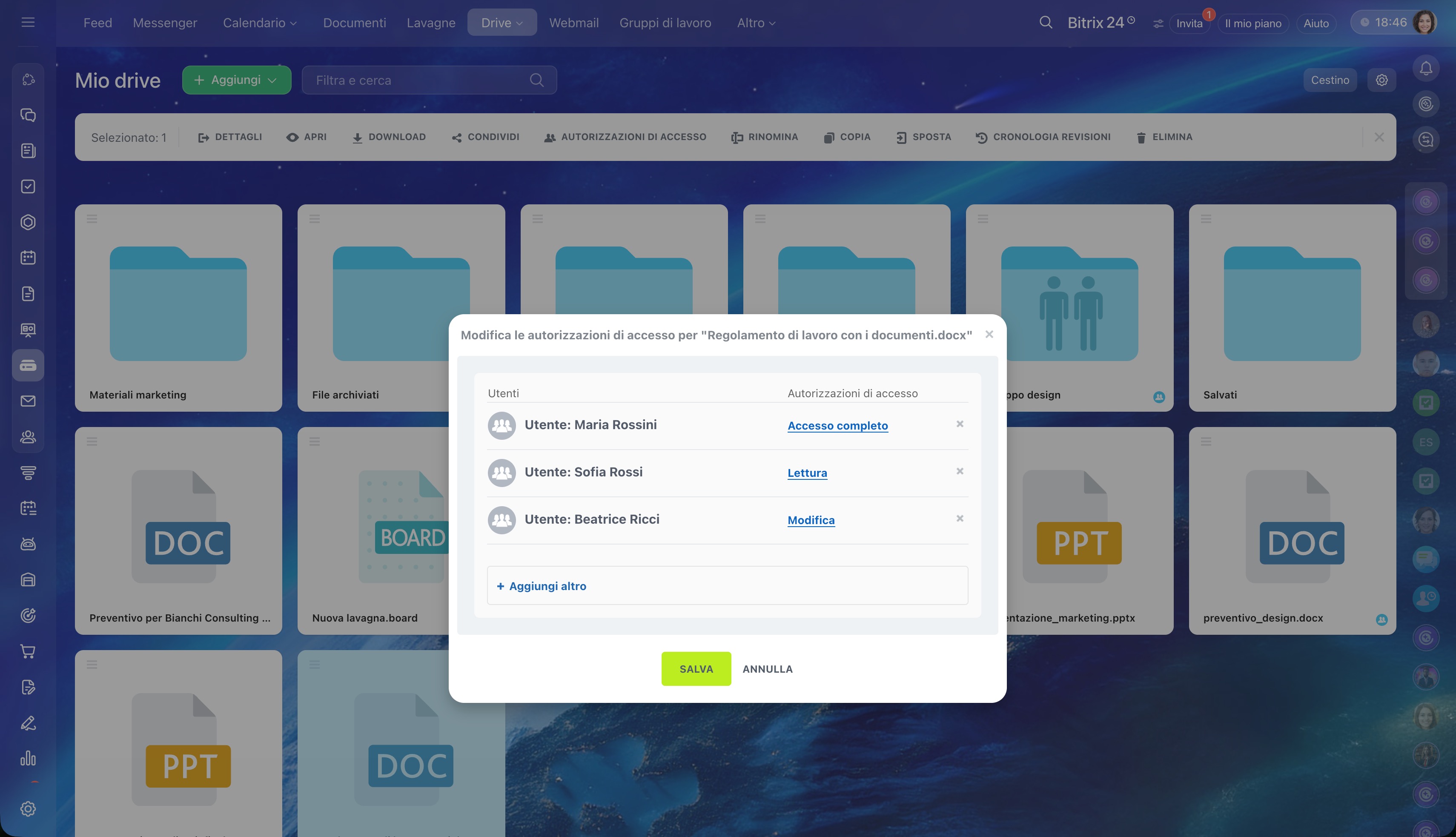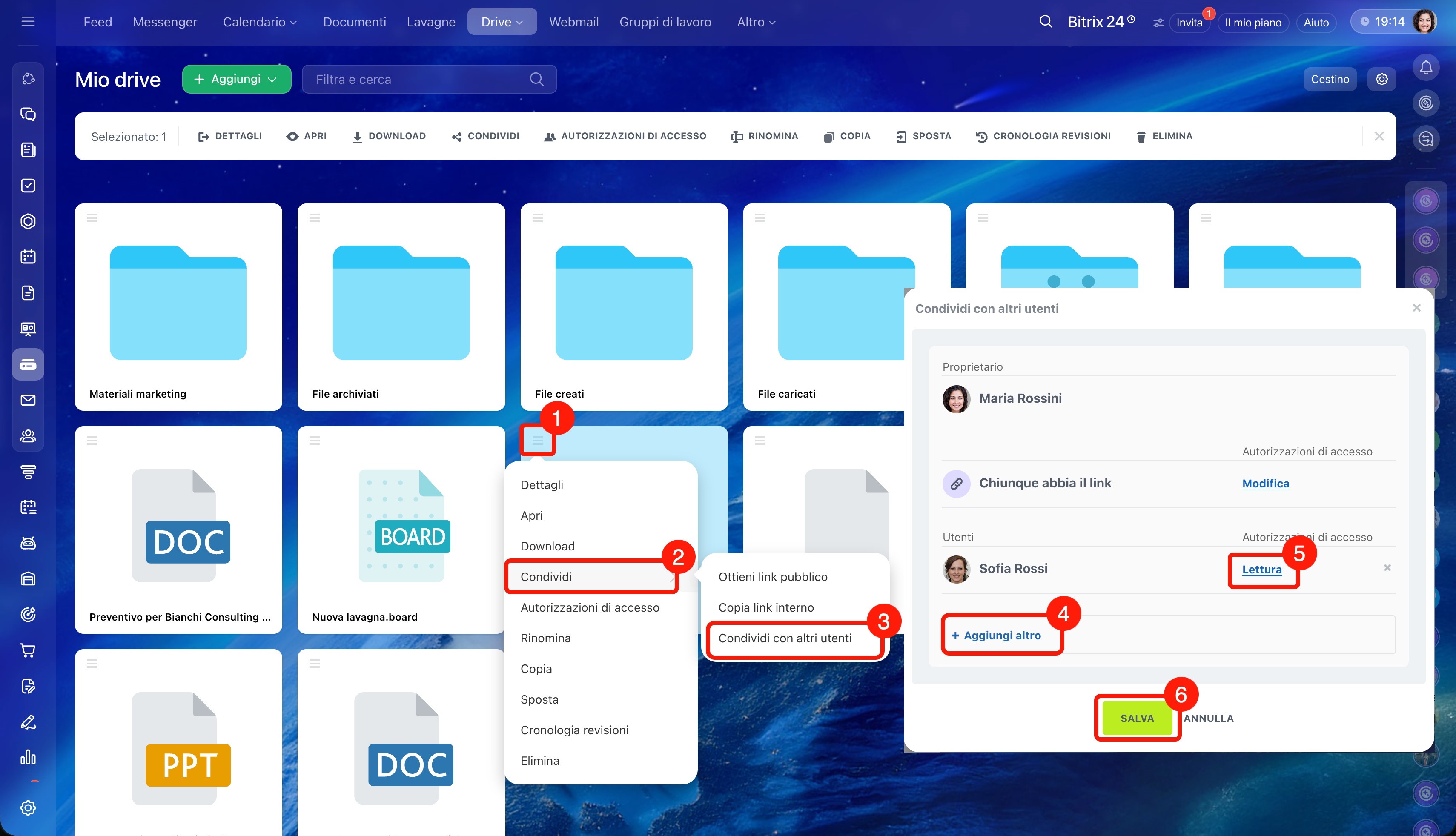 Configurare la condivisione. Permette di aggiungere un file o una cartella al drive personale di un altro dipendente. È utile per il lavoro collaborativo con i documenti: i dipendenti potranno trovare e aprire rapidamente i file necessari.
