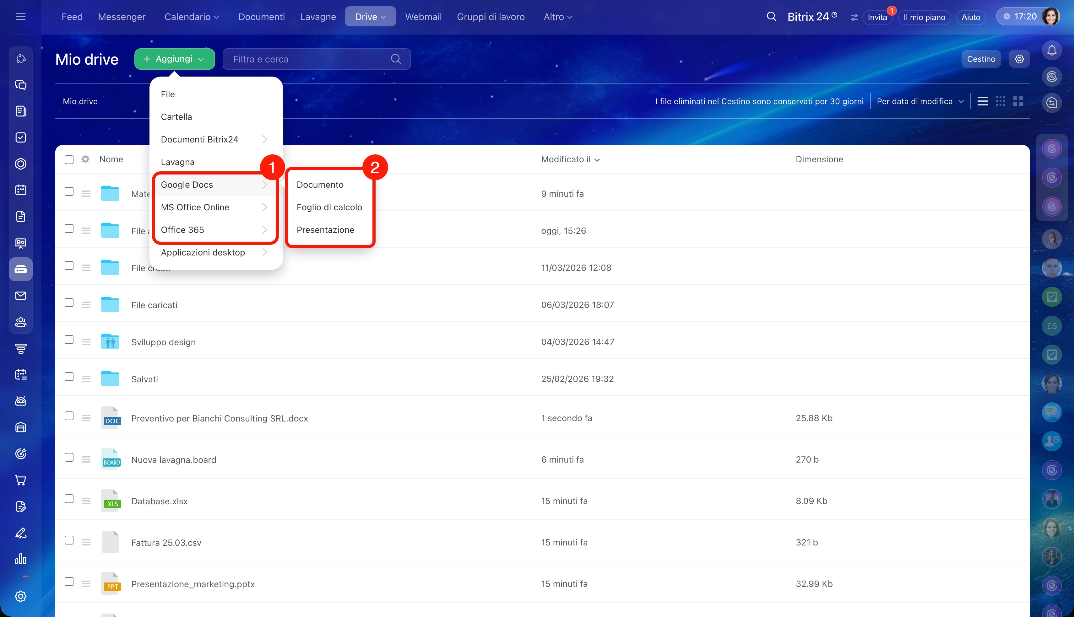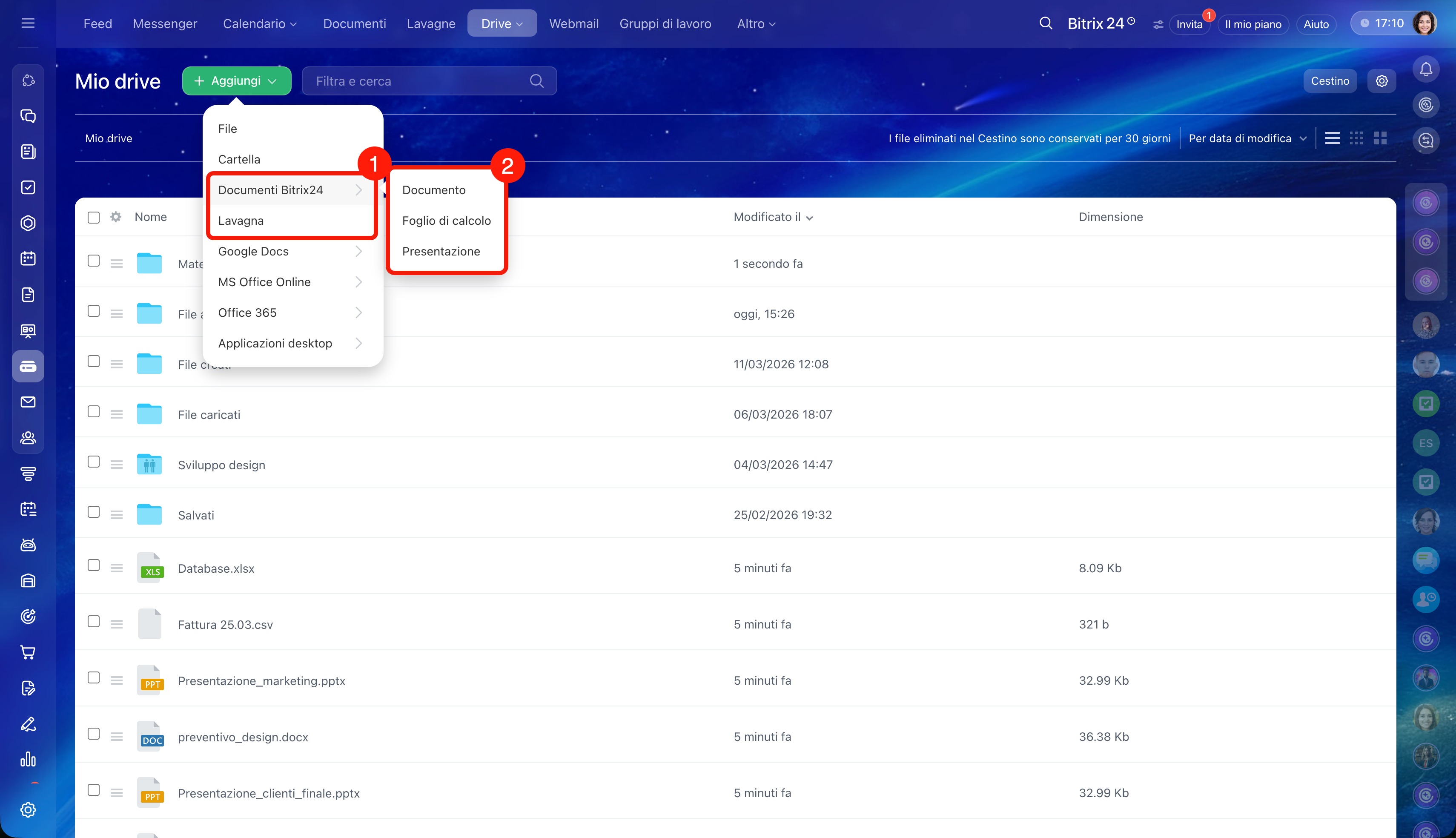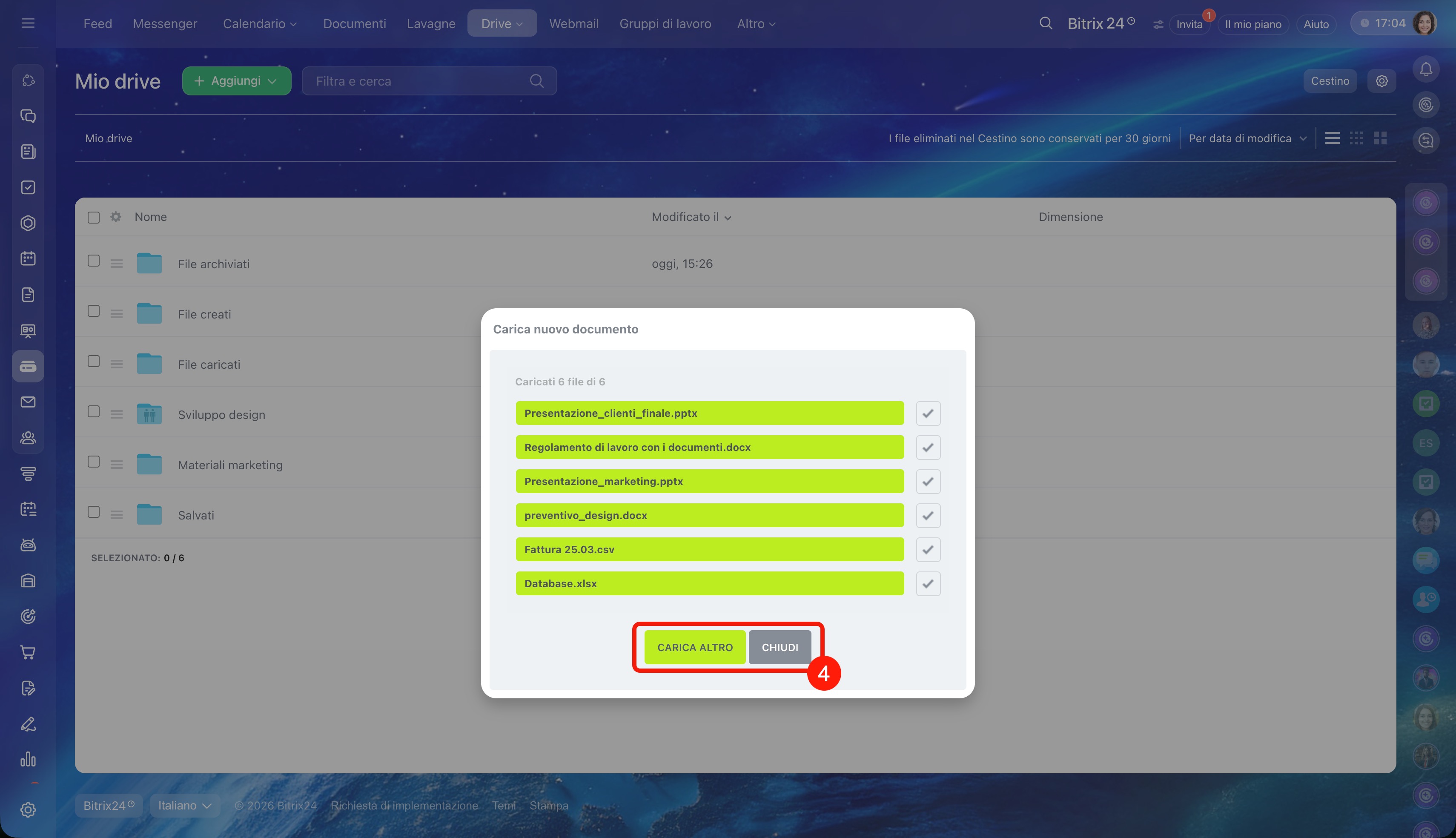 - In Bitrix24 sul computer è possibile creare o caricare un file, nell’applicazione mobile è disponibile solo il caricamento.