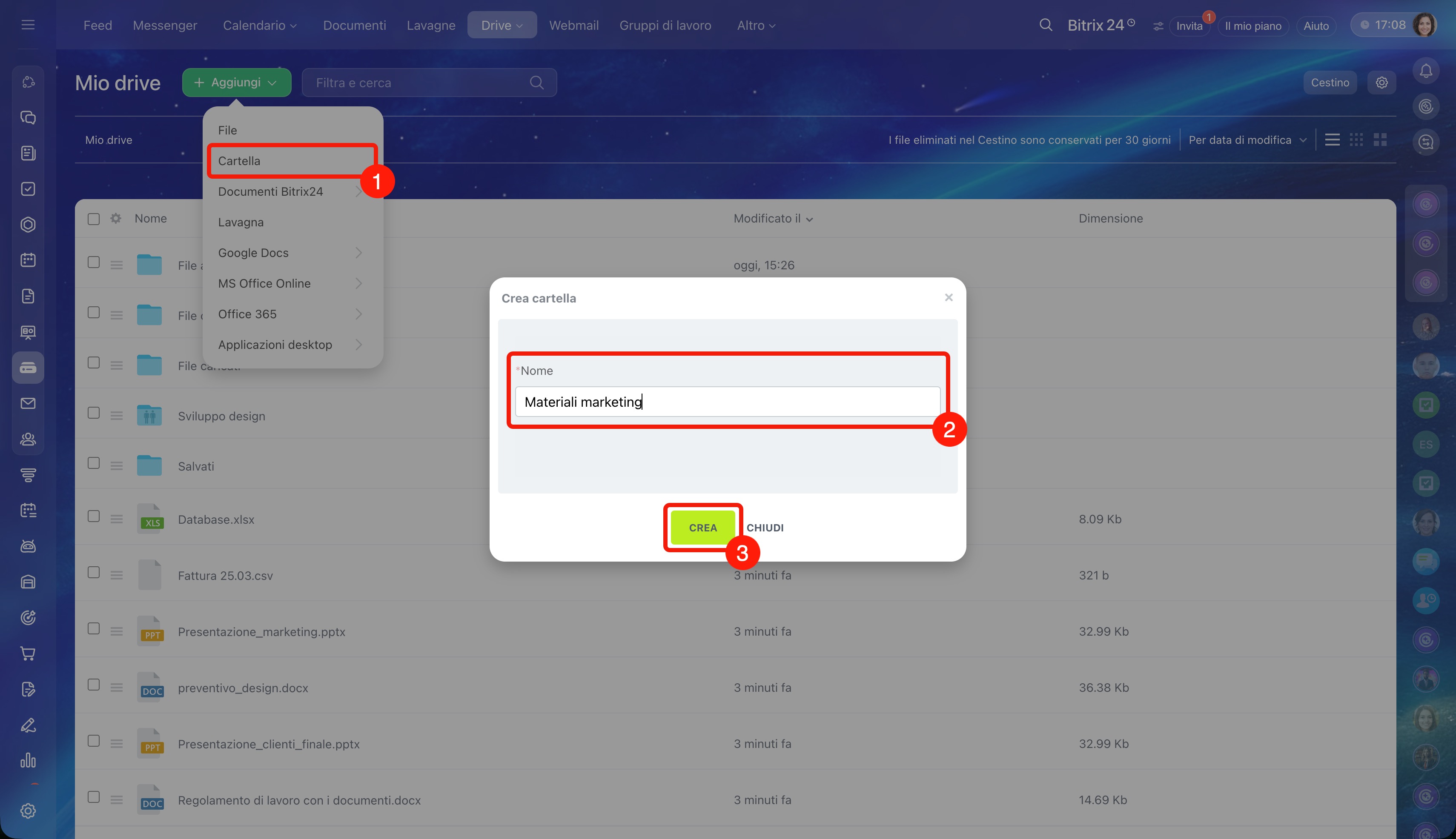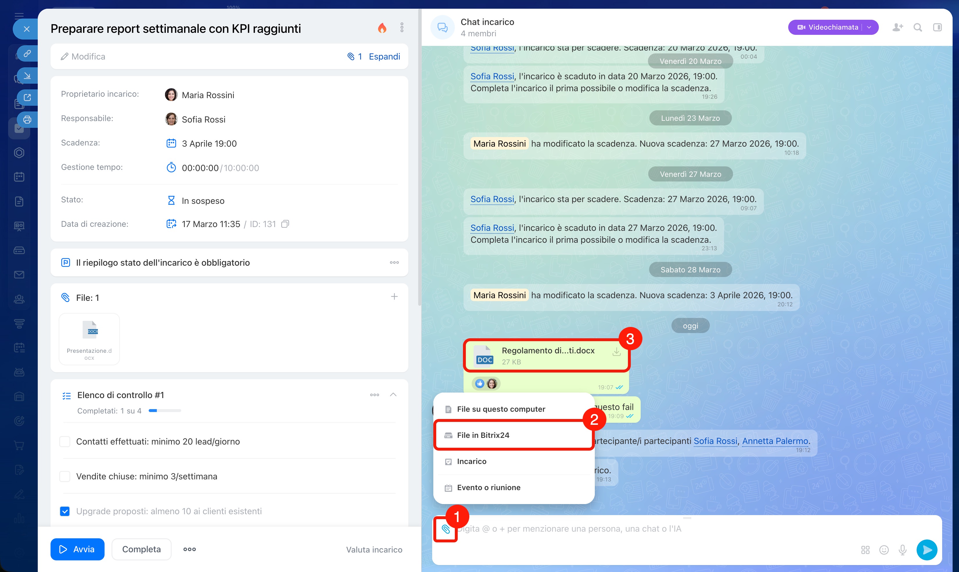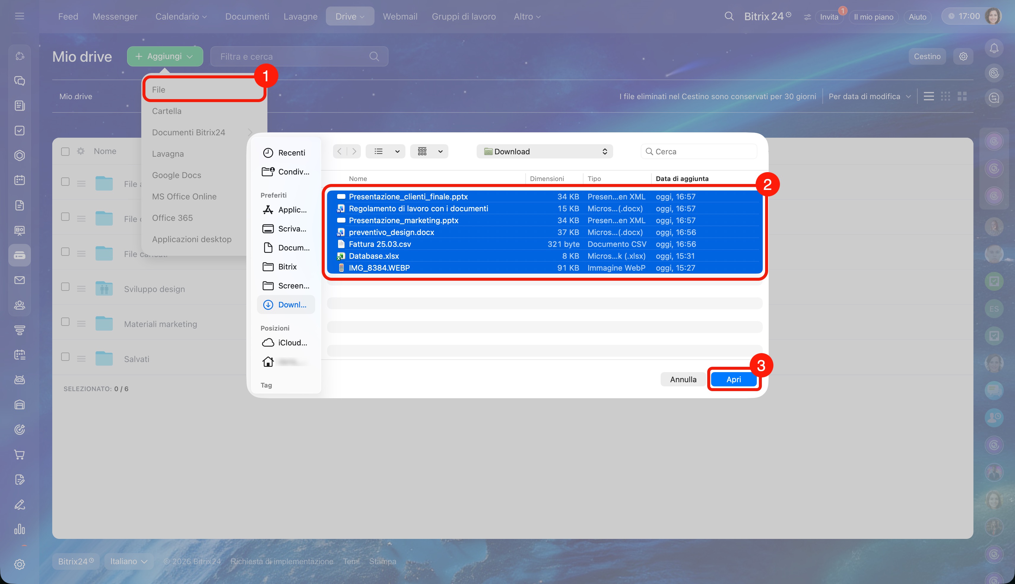 - In Bitrix24 sul computer è possibile creare o caricare un file, nell’applicazione mobile è disponibile solo il caricamento.