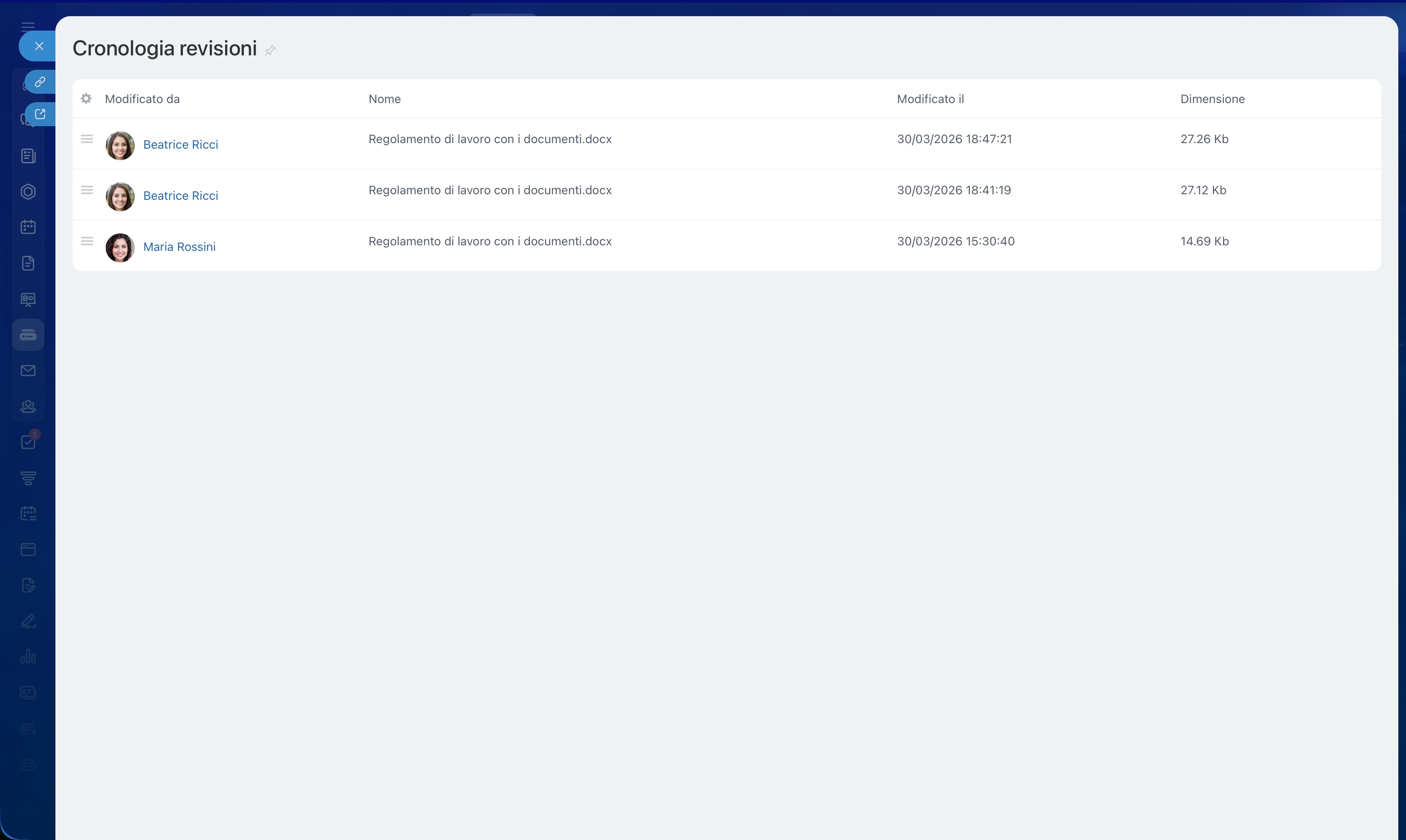 Cronologia delle modifiche. Mostra chi ha modificato il file e quando. È possibile vedere le versioni precedenti.