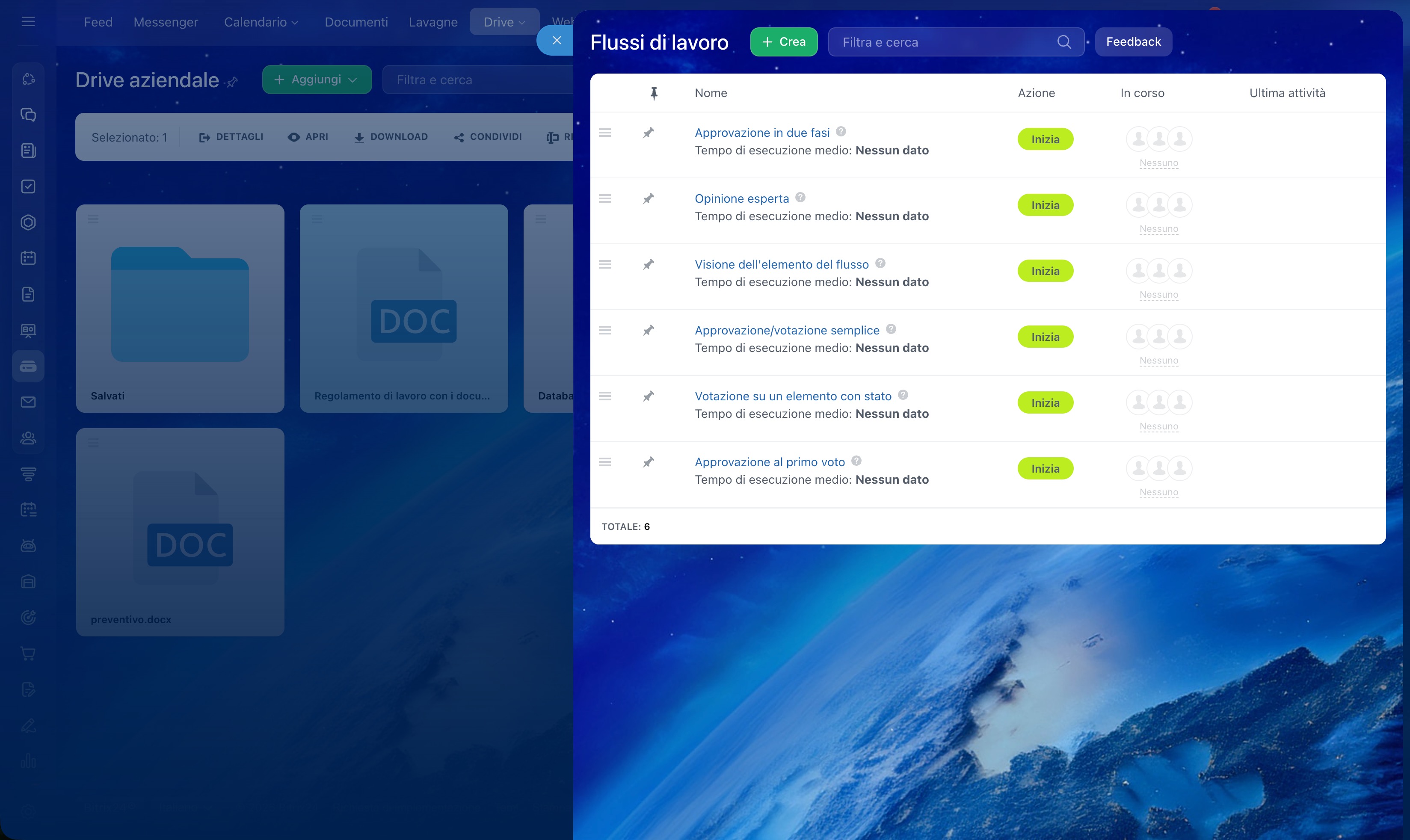 Flussi di lavoro. Disponibile solo per i file nel Drive aziendale: permette di automatizzare il lavoro con i file, ad esempio l’approvazione dei documenti o l’elaborazione delle richieste.