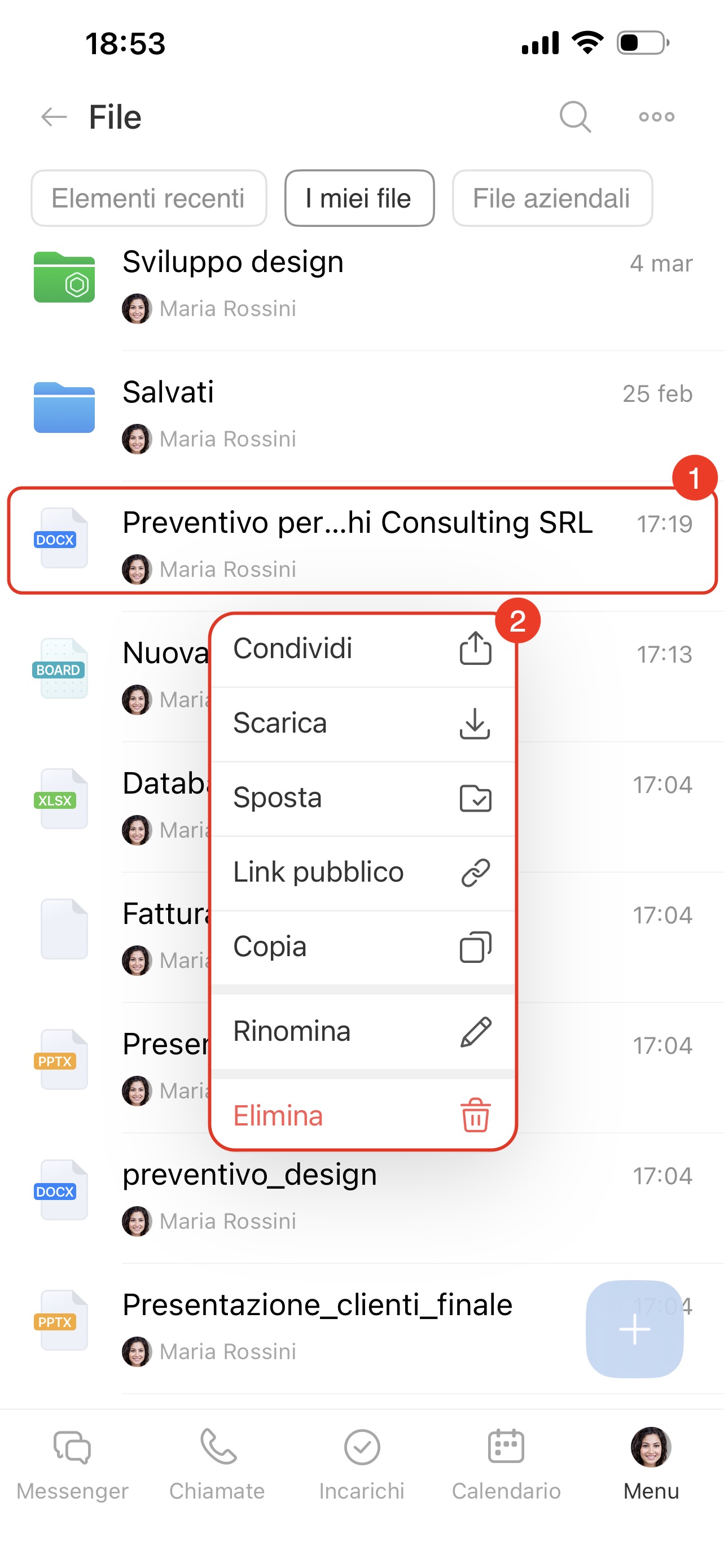 Seleziona il file oppure fai clic su Menu (≡). L’elenco delle azioni disponibili verrà mostrato sia nella barra superiore sia nel menu del file.