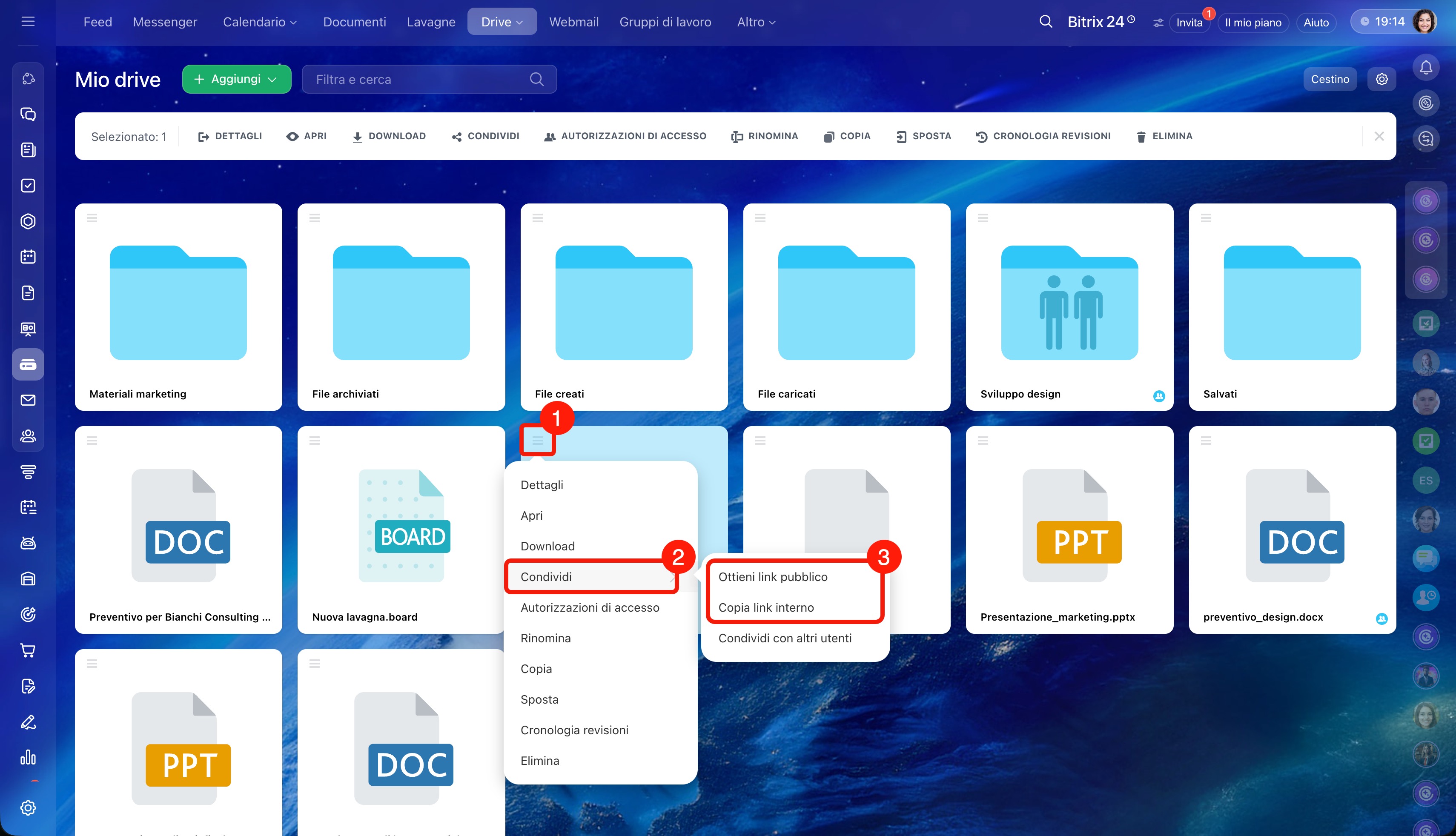 Inviare un link a una cartella o a un file nella chat di Bitrix24, in un messenger esterno, via SMS oppure e-mail. Utilizza i link interni per i colleghi e quelli pubblici per chi non lavora nella tua azienda.