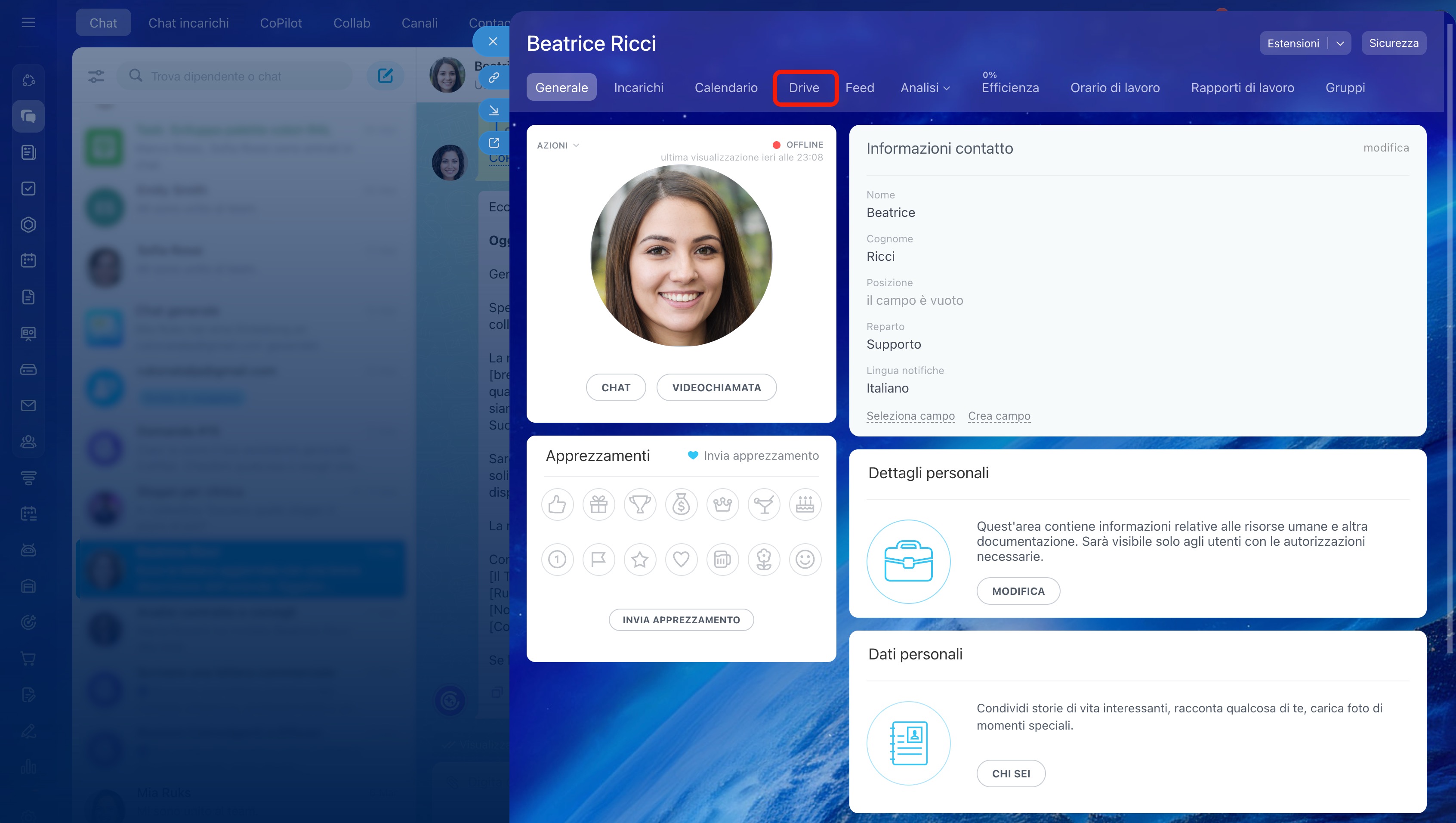 Dopo la configurazione il dipendente non riceverà notifiche. Per trovare i file disponibili, bisogna aprire il profilo del dipendente e andare alla scheda Drive: lì verranno mostrati gli elementi ai quali è consentito l’accesso.