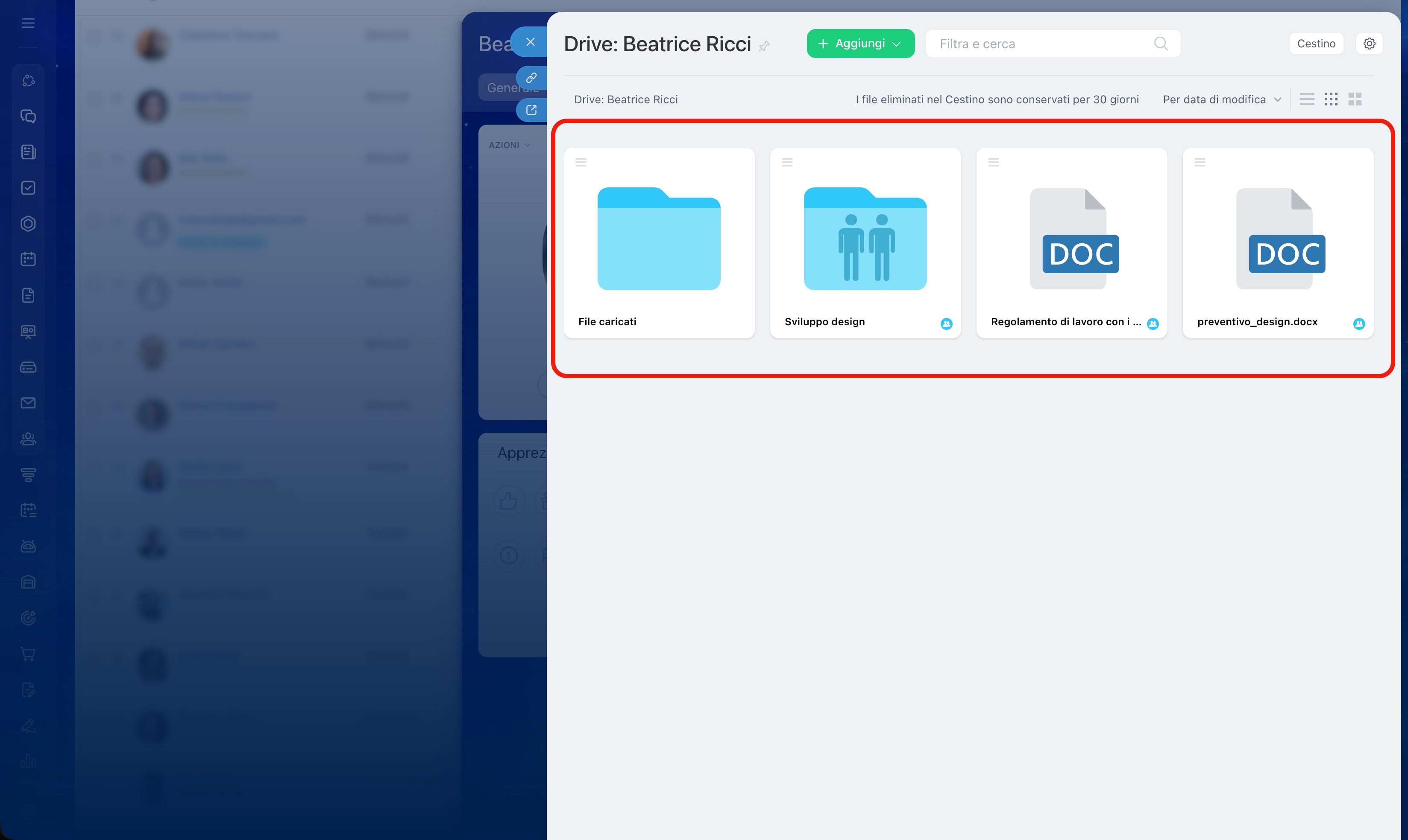 Nel Drive puoi aprire, modificare ed eseguire altre azioni sui file: le possibilità dipendono dalle autorizzazioni di accesso. Ad esempio, se un dipendente non ha le autorizzazioni di modifica, non potrà rinominare, spostare o eliminare il file.