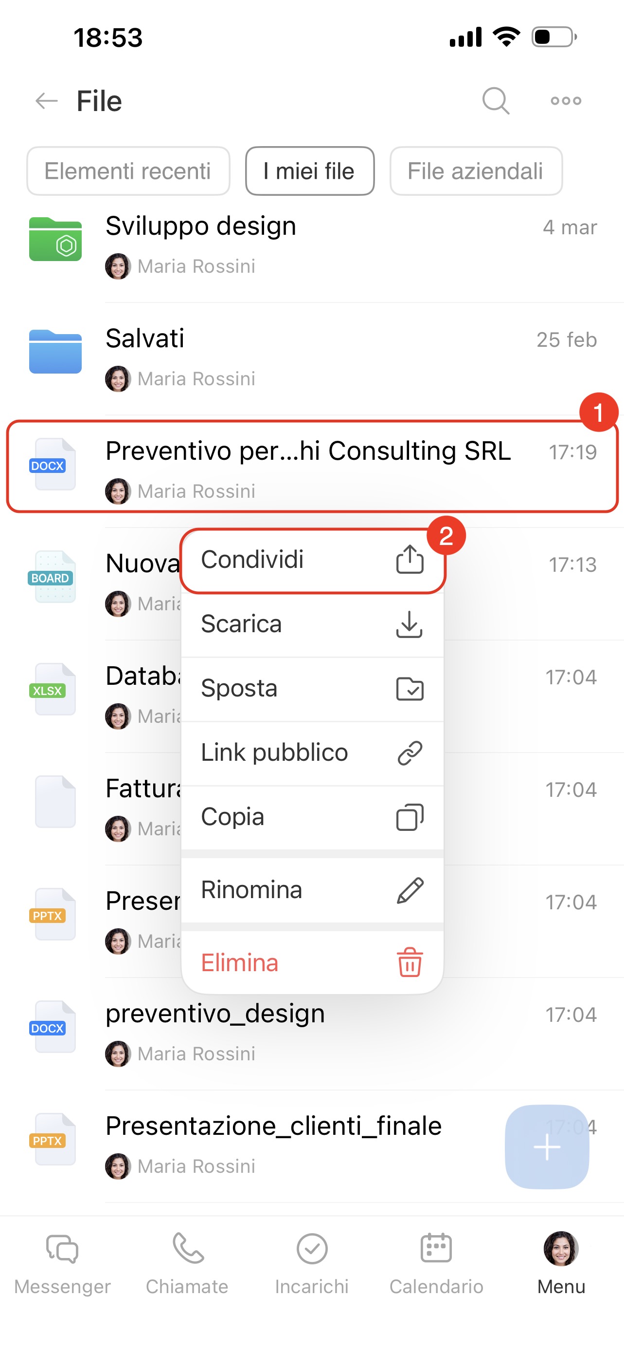 Condividere. Permette di copiare un link interno per i dipendenti oppure un link pubblico per utenti esterni e di configurare l’accesso. Il link ottenuto può essere inviato nel messenger, via SMS o e-mail.