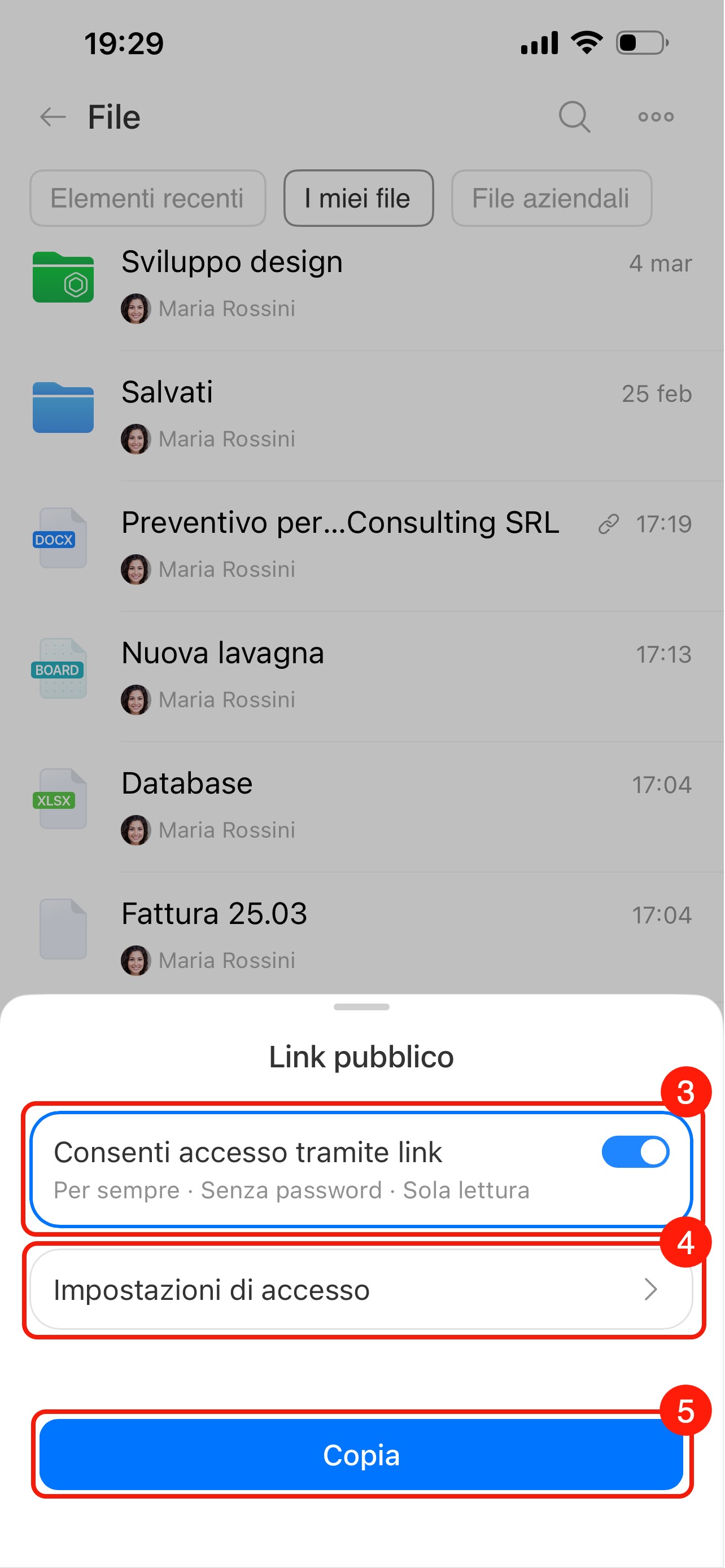 Tieni premuto il file per aprire il menu. Seleziona Link pubblico, attiva l’accesso tramite link, configura i parametri e fai clic su Copia.