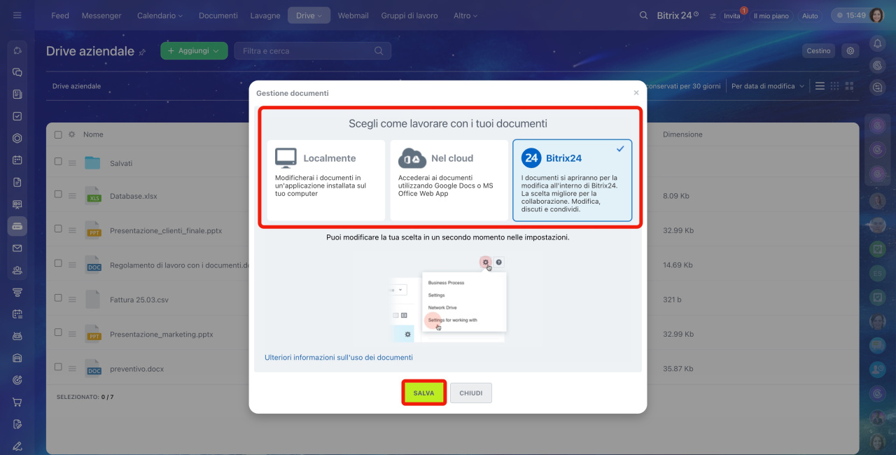 Configurazione del lavoro con i documenti. Scegli la modalità più comoda: locale, cloud oppure tramite l’editor integrato di Bitrix24. Salva le modifiche.