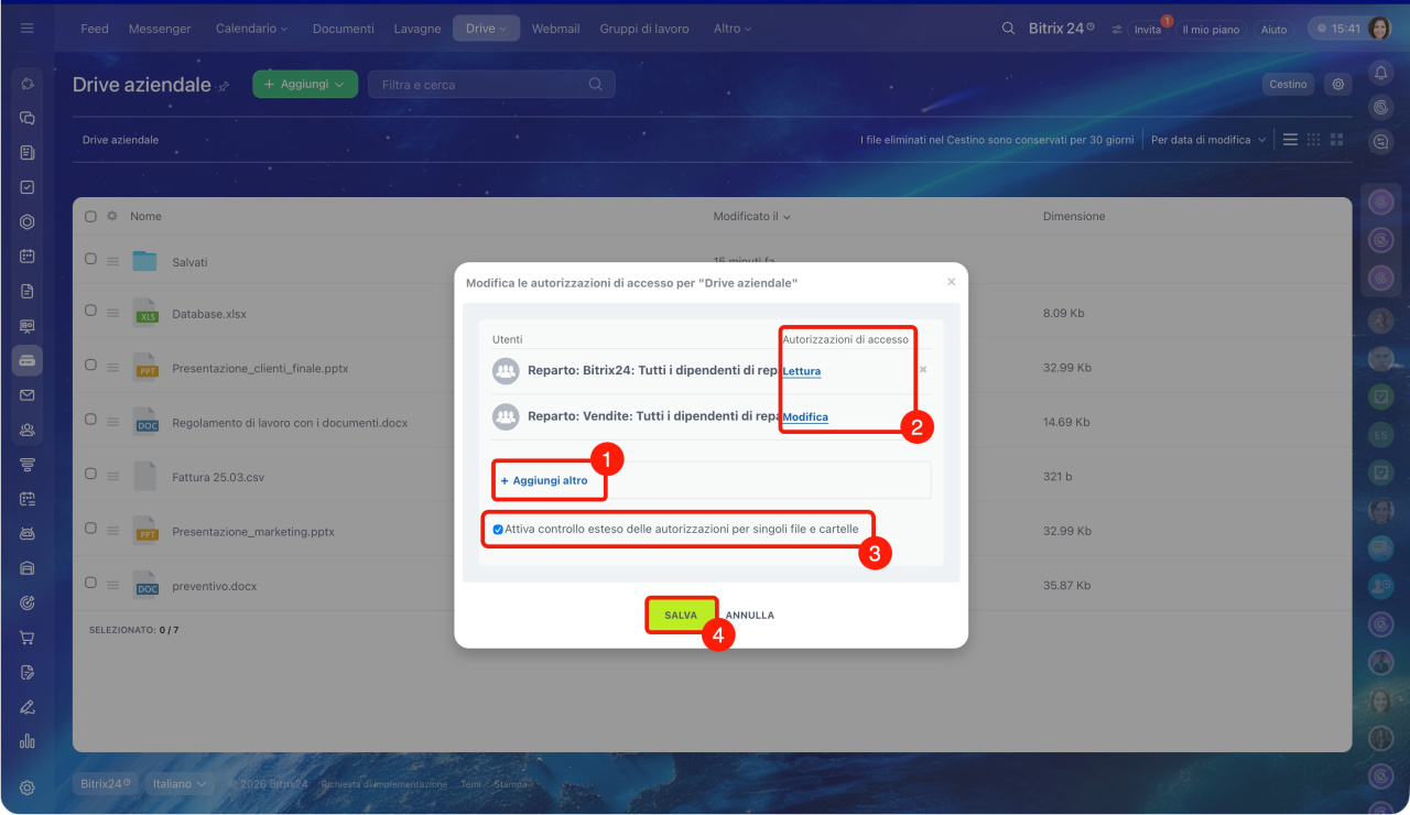 Per impostazione predefinita l’amministratore di Bitrix24 ha accesso completo al Drive aziendale, mentre i dipendenti hanno l’autorizzazione di modifica.