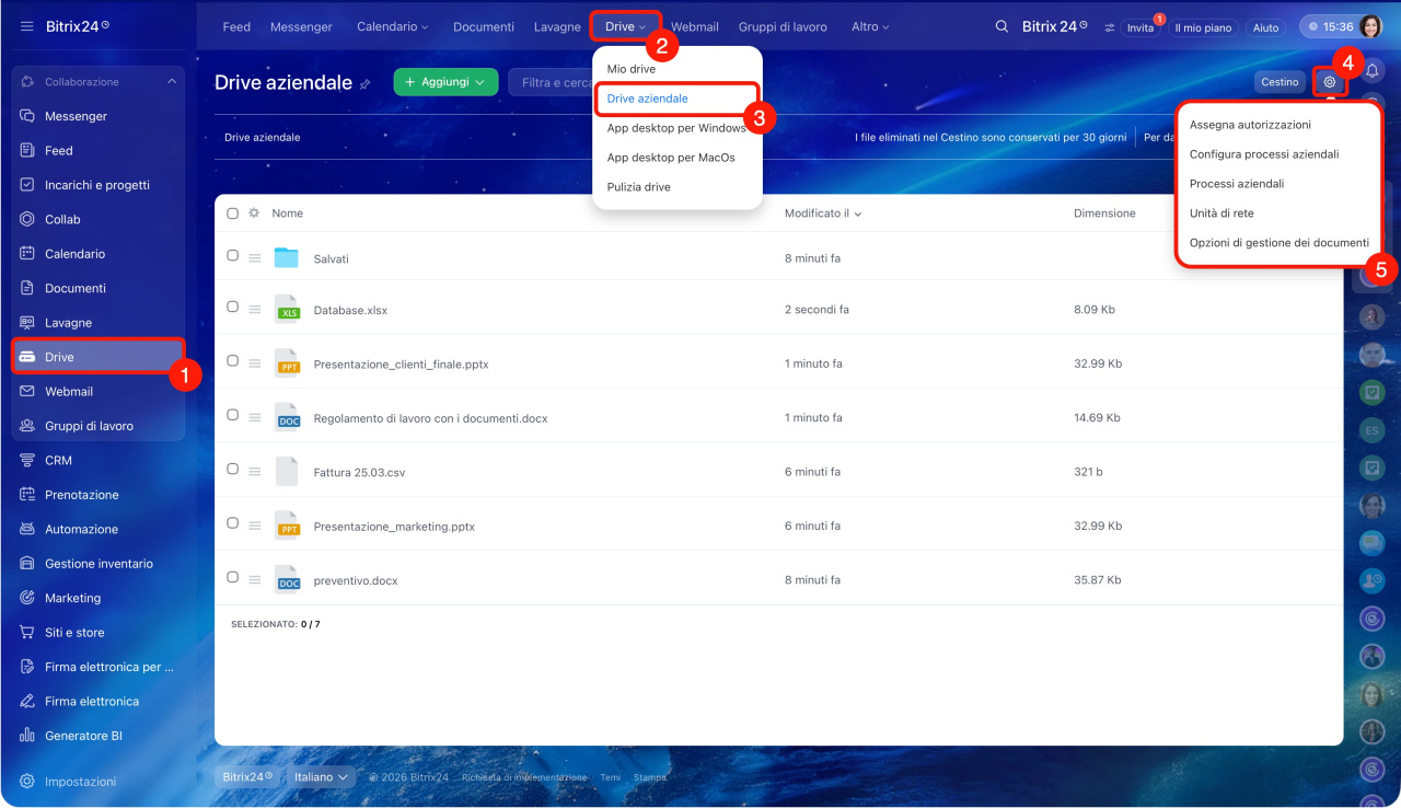 - Il Drive aziendale in Bitrix24 è un archivio cloud per i file: istruzioni, modelli di documenti e altri materiali. È disponibile sul computer e nell’applicazione mobile di Bitrix24.