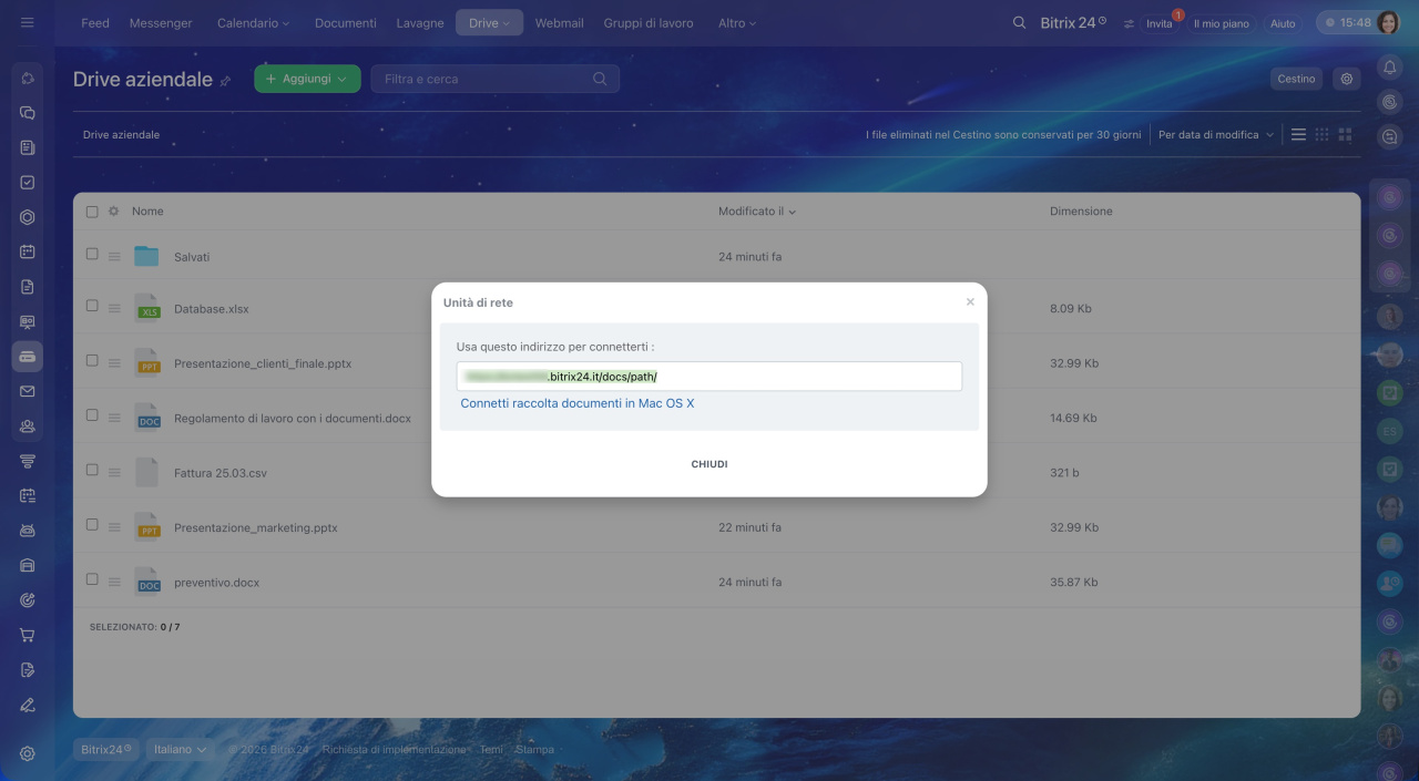 Drive di rete. Copia l’indirizzo per collegare al computer il Drive personale, sarà disponibile come una normale cartella in Esplora file. Tutte le modifiche vengono sincronizzate in entrambe le direzioni: dopo aver salvato un documento, le modifiche effettuate sul computer appariranno in Bitrix24 e viceversa.