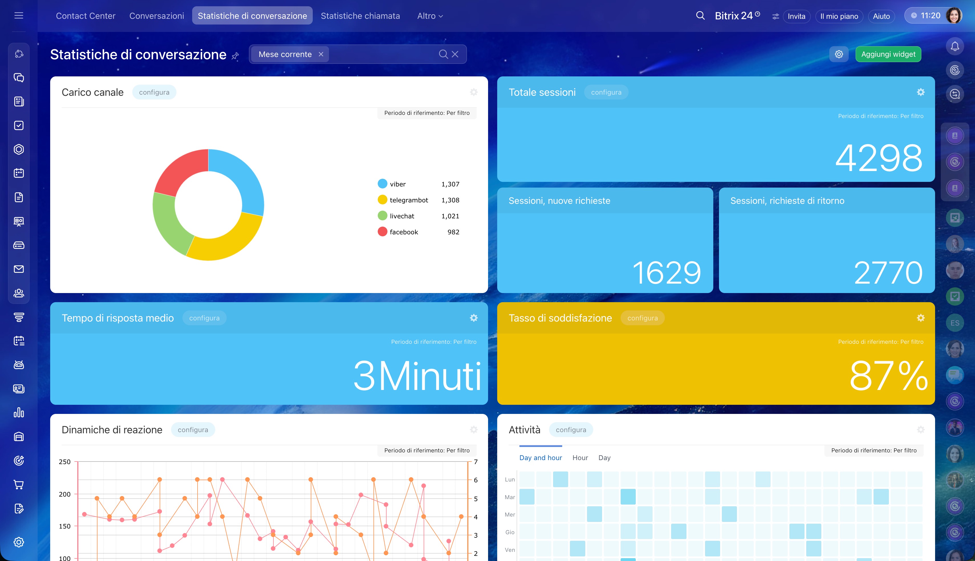 Statistiche di conversazione mostrano come il team comunica con i clienti nelle chat: velocità di risposta, valutazioni dei clienti e popolarità dei canali.