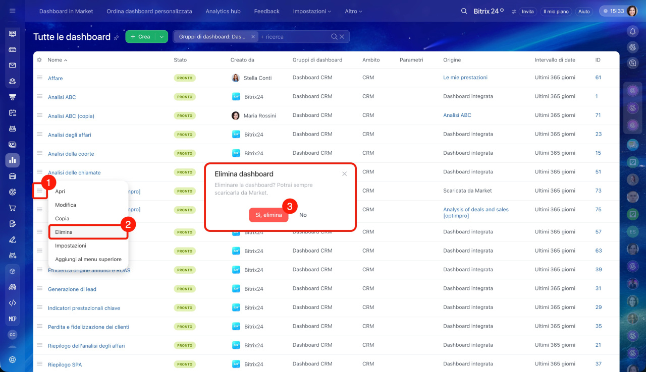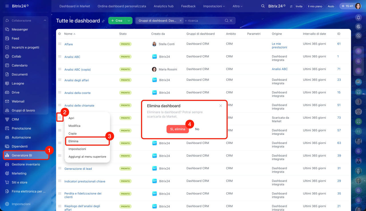 - La dashboard installata dal Bitrix24 Market può essere eliminata tramite il menu delle azioni nel Generatore BI.