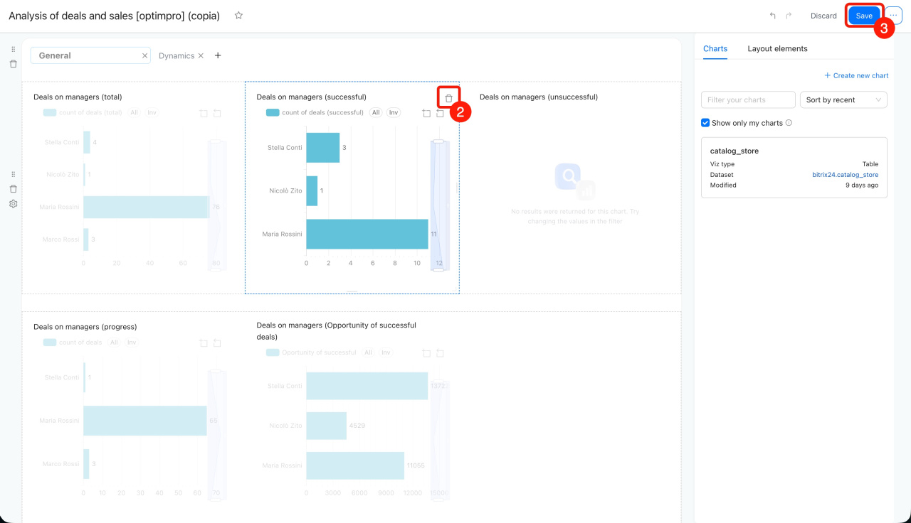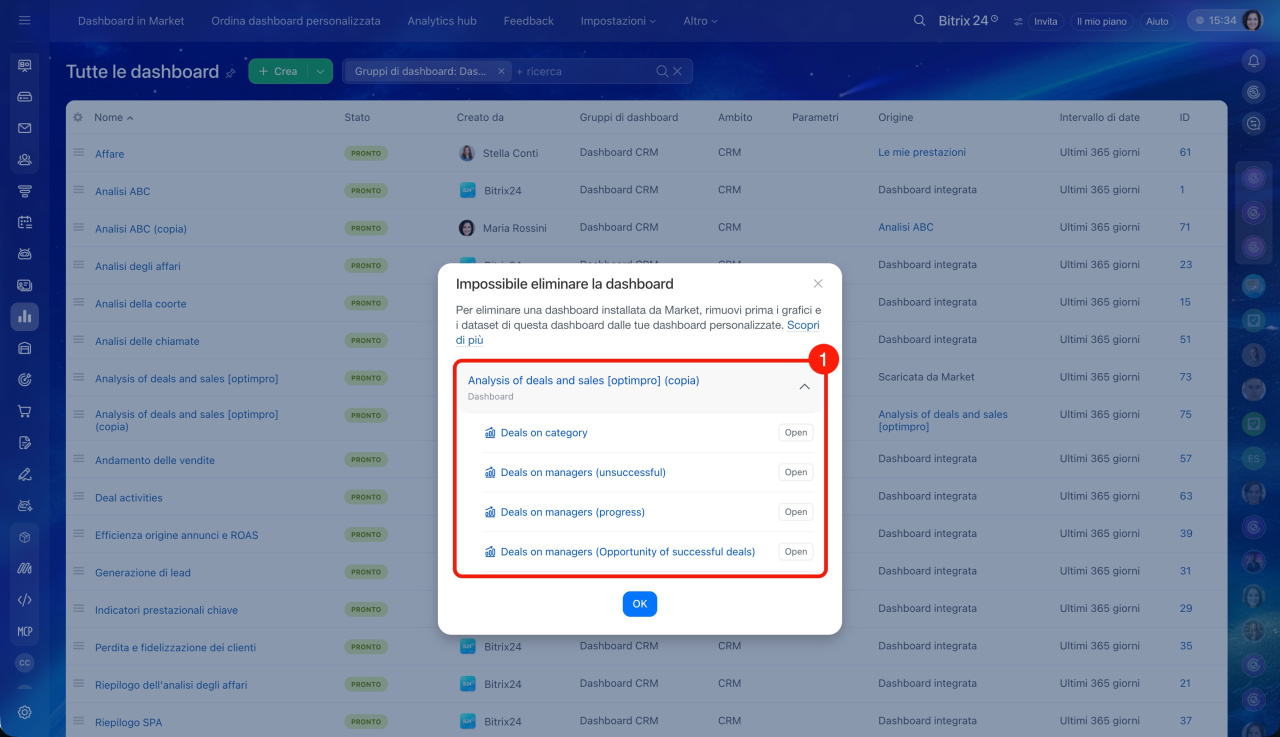 Bitrix24 mostrerà gli elementi collegati. Ad esempio, può trattarsi di un grafico o di un dataset utilizzato nelle tue dashboard. Apri la dashboard, elimina questi elementi e salva le modifiche.