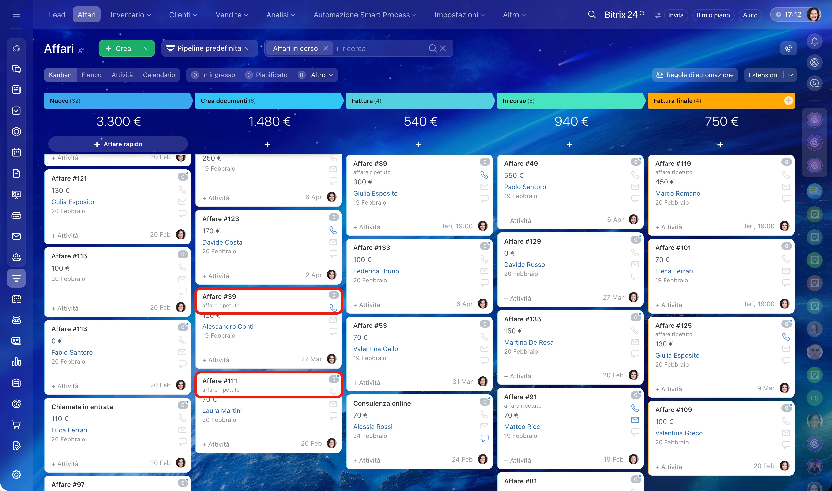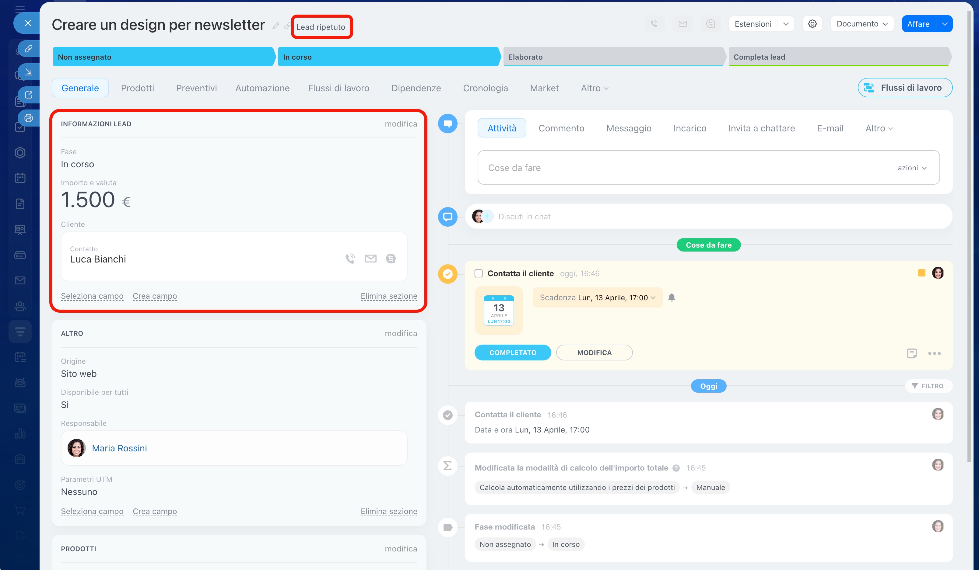 I lead e gli affari ripetuti vengono creati per clienti che hanno già contattato l’azienda o effettuato un acquisto. Il dipendente vede la cronologia delle richieste precedenti e degli accordi e può continuare il lavoro senza perdere il contesto. Questo aiuta a passare più rapidamente alla discussione di un nuovo ordine e a tenere conto dell’esperienza di collaborazione precedente. Questi lead e affari possono essere facilmente identificati nei rapporti e permettono di valutare quanti clienti tornano per un nuovo acquisto.
