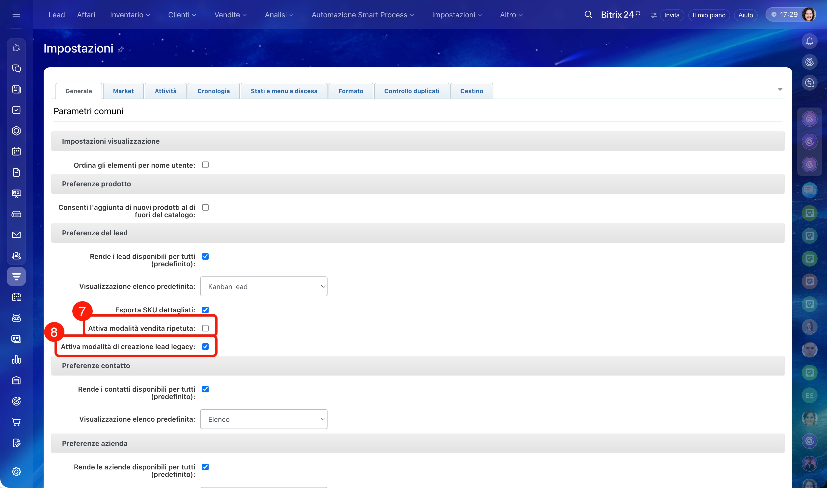 7–8. Disattiva il parametro Attiva modalità vendita ripetuta nella sezione Preferenze del lead. Successivamente attiva il parametro Attiva modalità di creazione lead legacy.