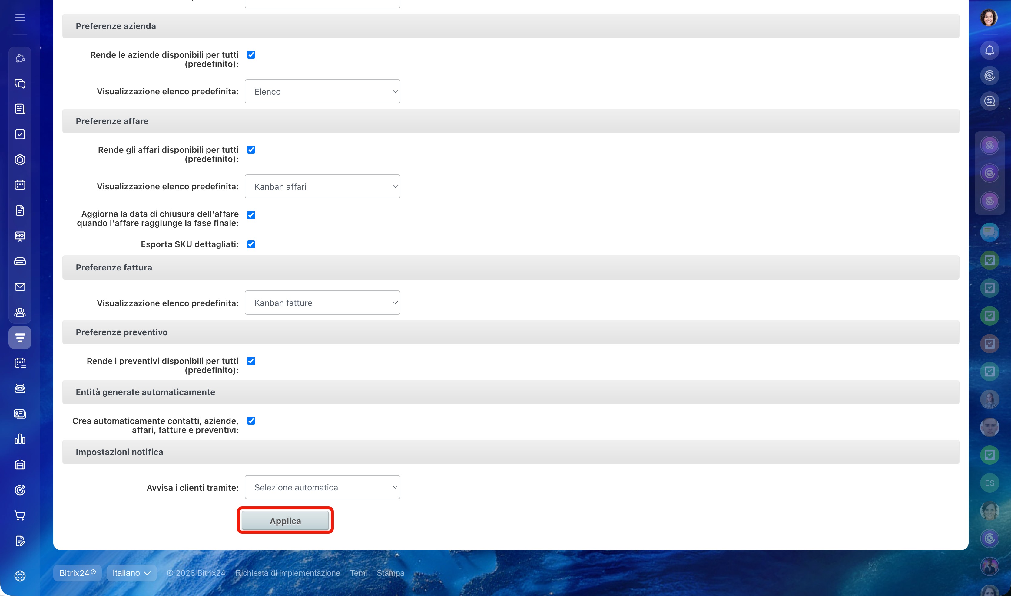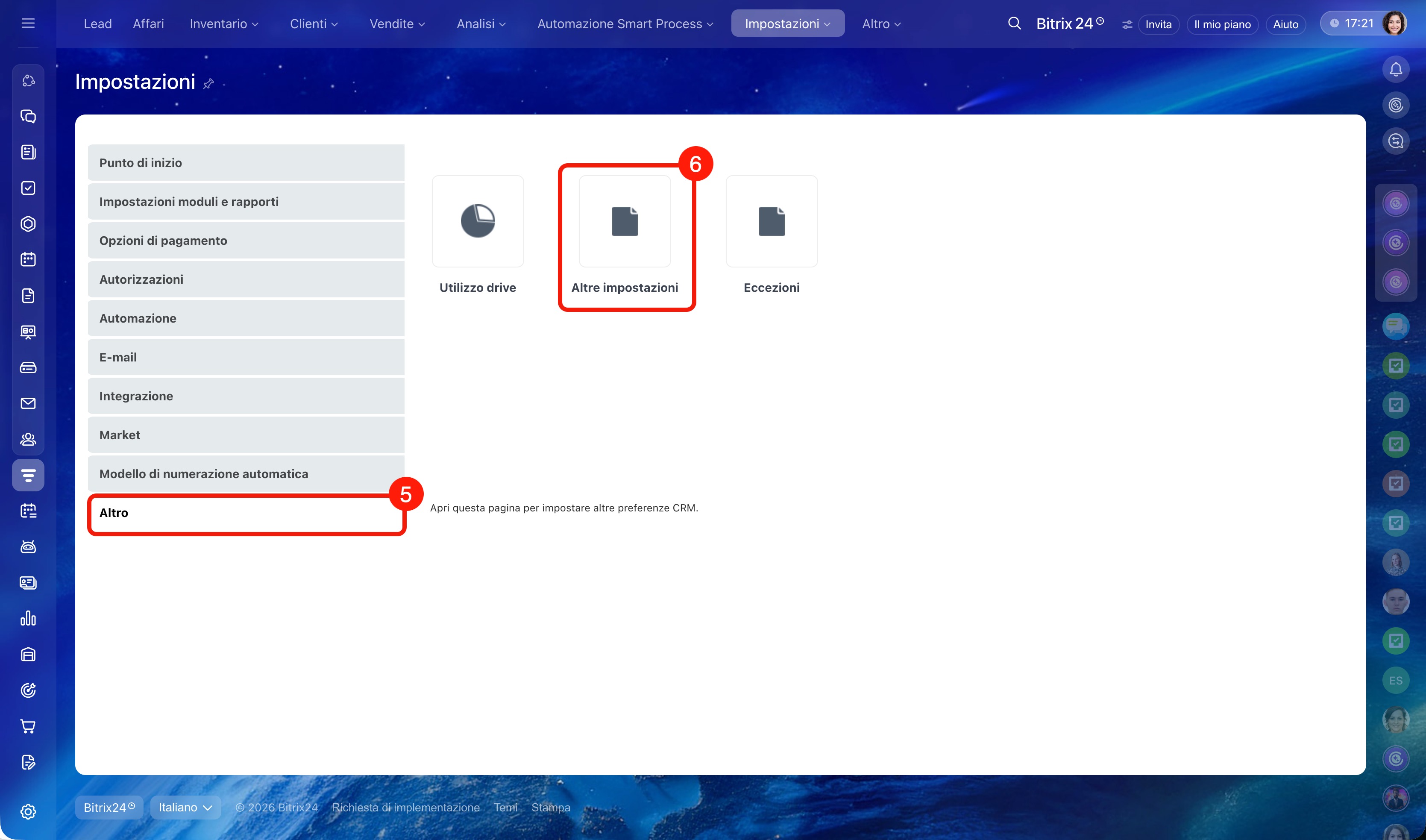 1–6. Vai in CRM > Altro > Impostazioni > Impostazioni CRM. Seleziona la sezione Altro nell’elenco a destra e clicca su Altre impostazioni.