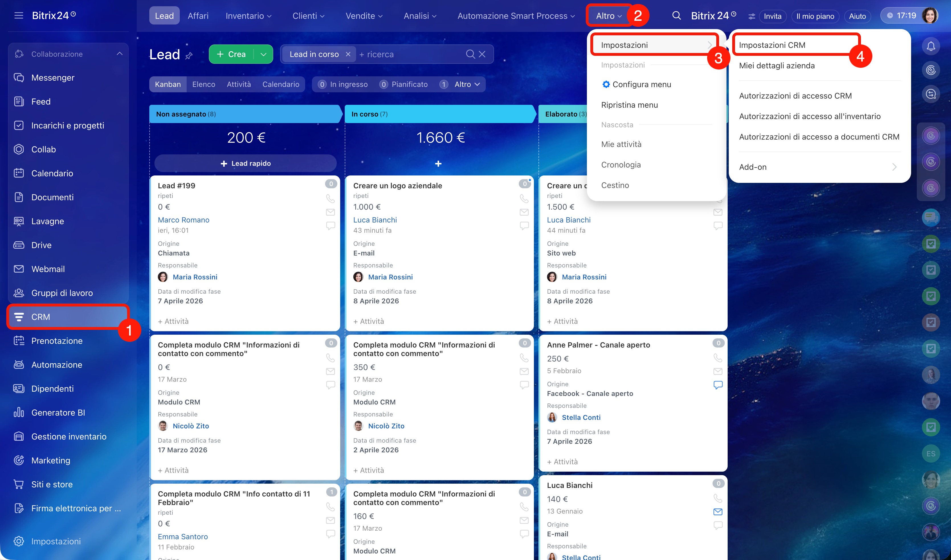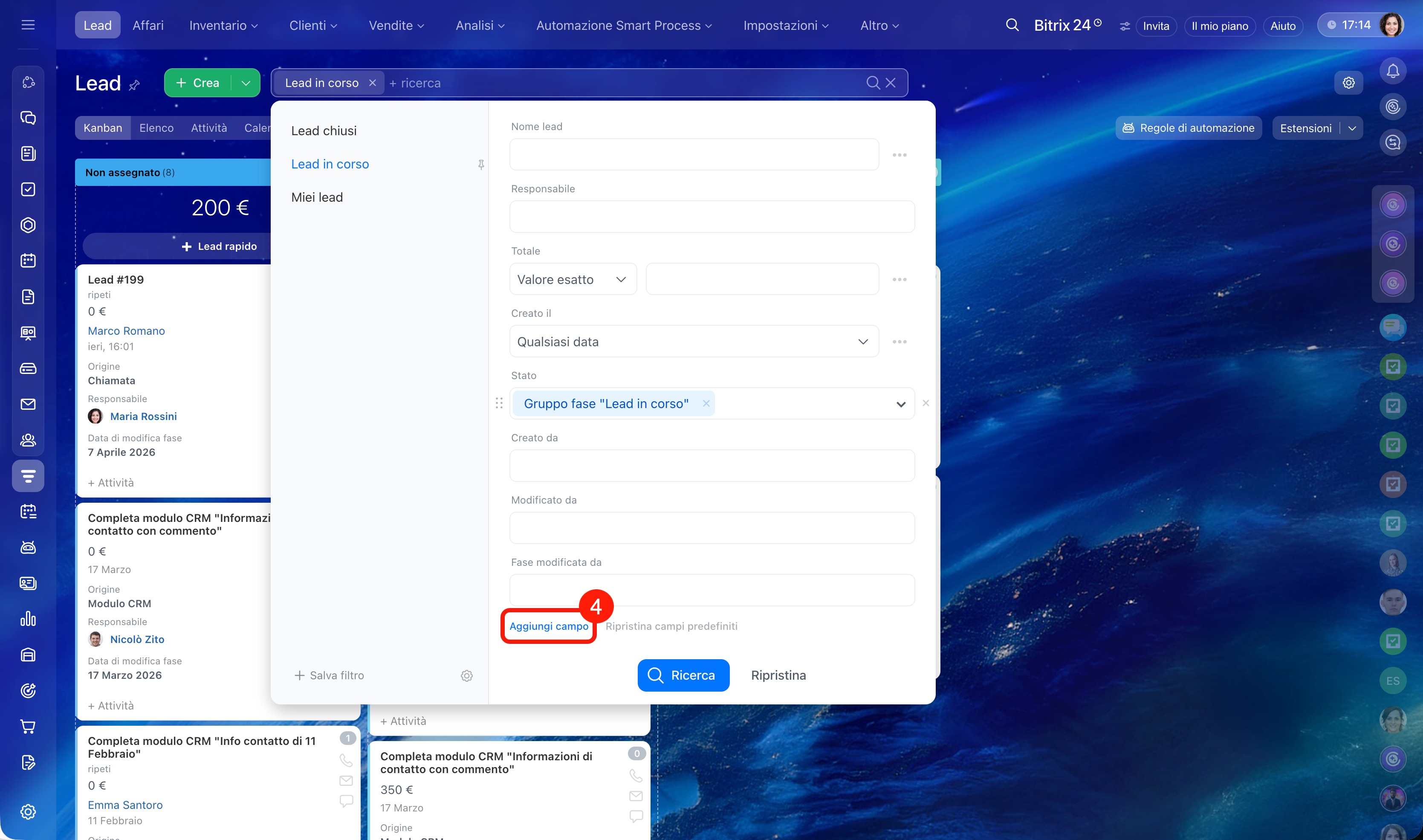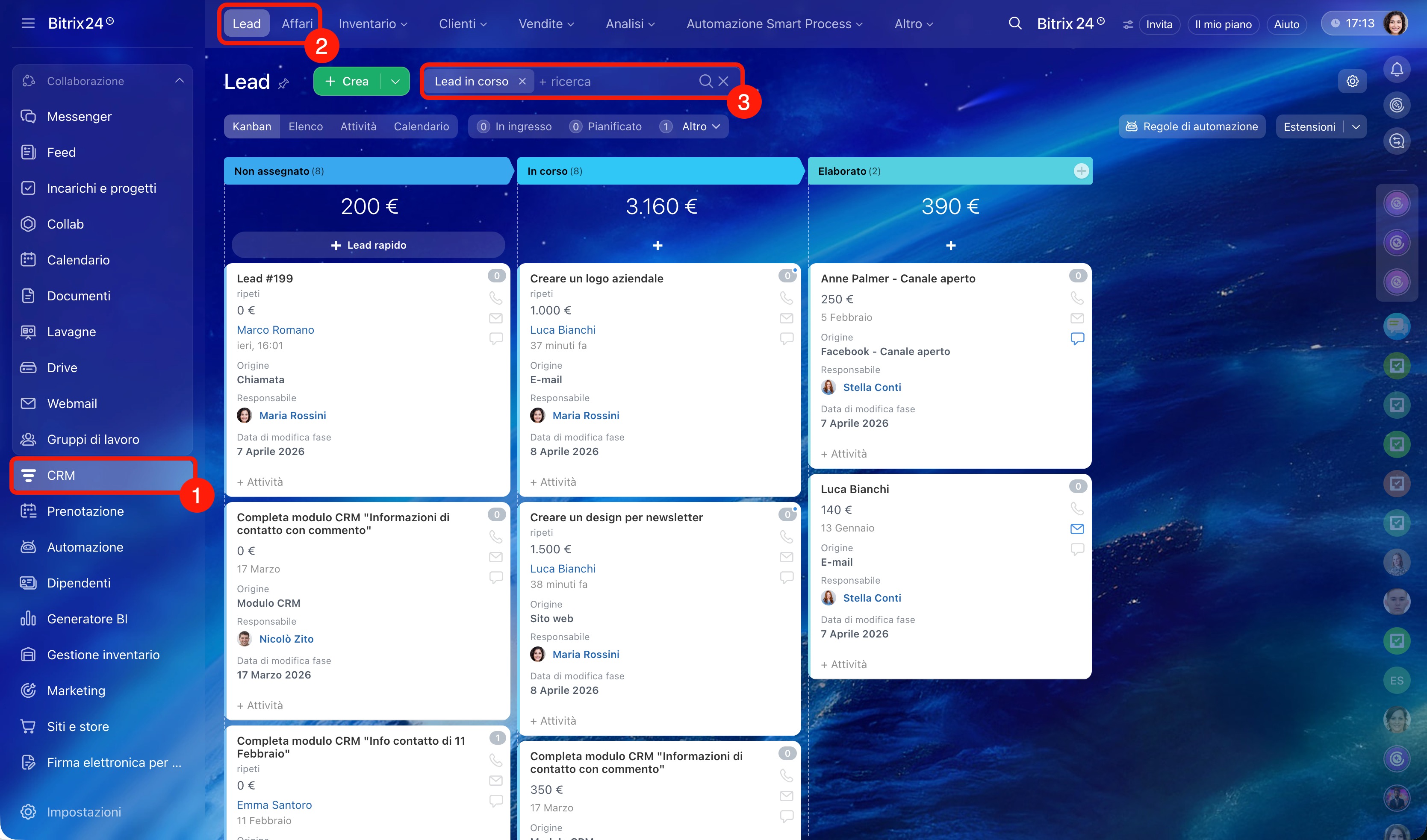 1–3. Vai in CRM > Lead oppure Affari. Clicca sulla barra di ricerca in alto.