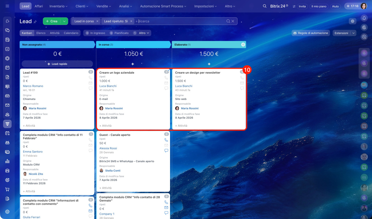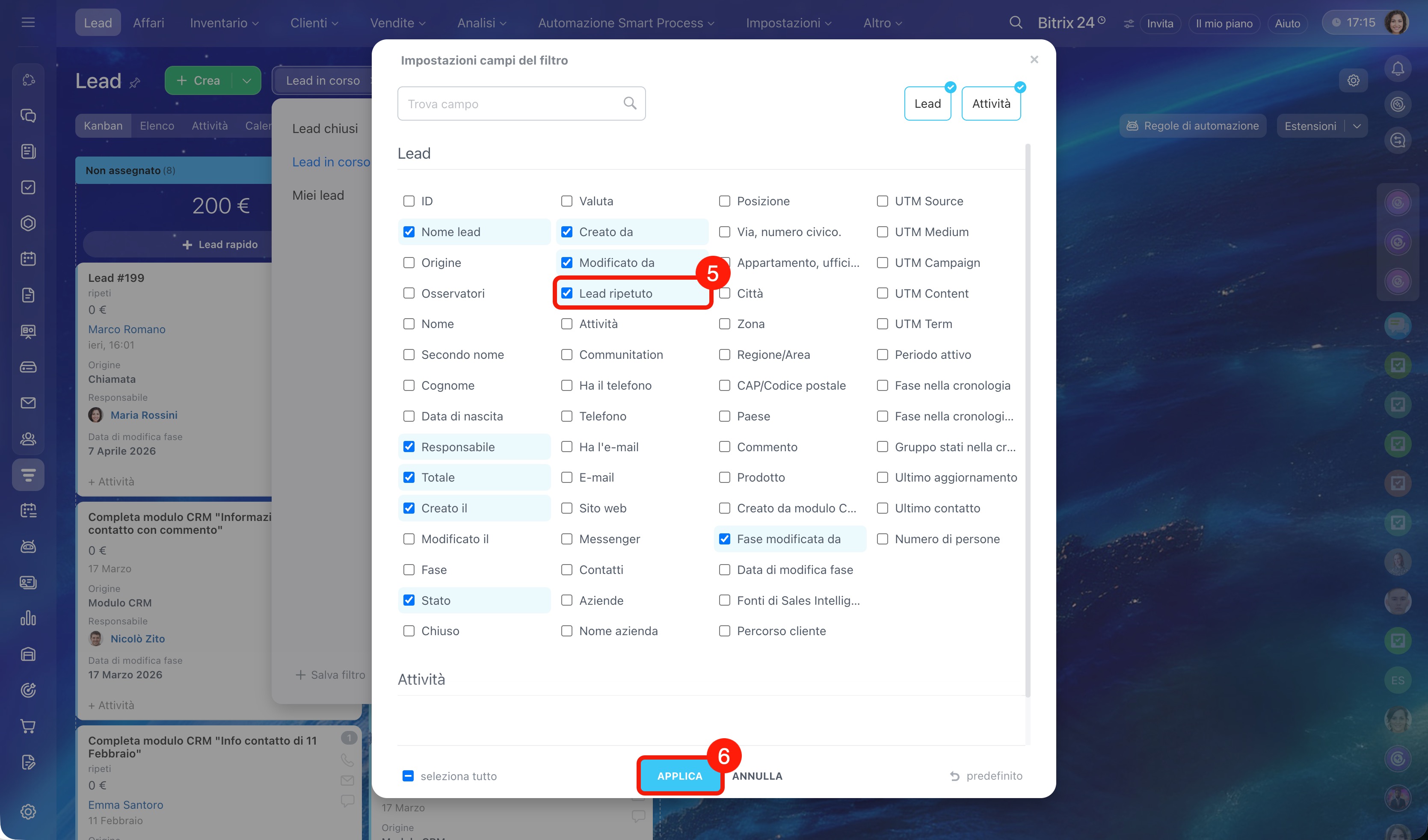 - I lead, le richieste e gli affari ripetuti possono essere trovati utilizzando i filtri nelle sezioni CRM > Lead oppure Affari.