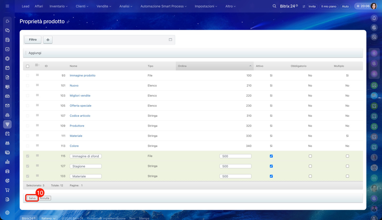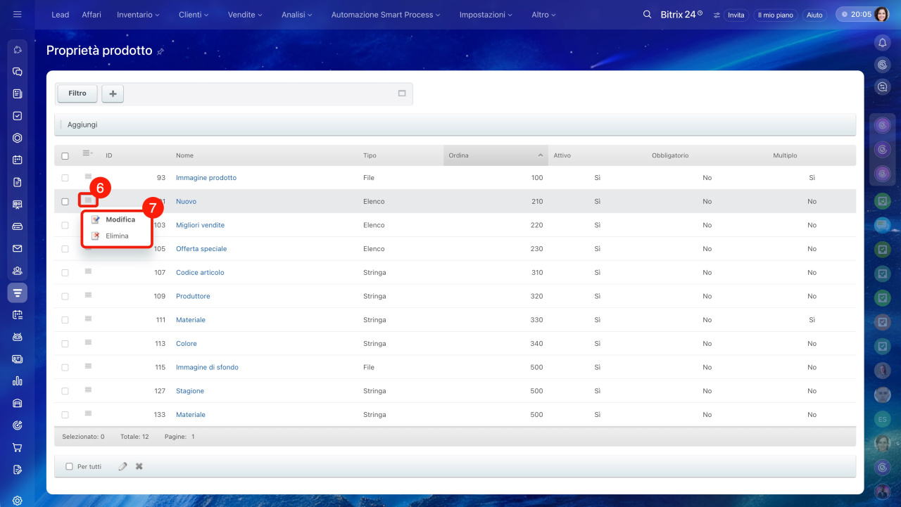- Le impostazioni della proprietà possono essere modificate nella scheda prodotto o nelle impostazioni CRM. Eliminare una proprietà è possibile solo nelle impostazioni CRM.