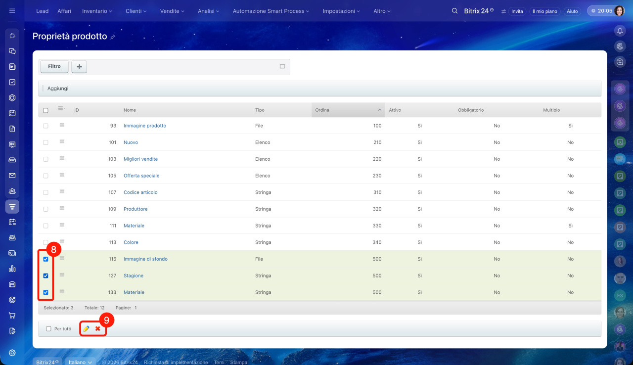 8–9. Per modificare o eliminare più proprietà contemporaneamente utilizza le azioni di gruppo. Seleziona le proprietà necessarie e fai clic su