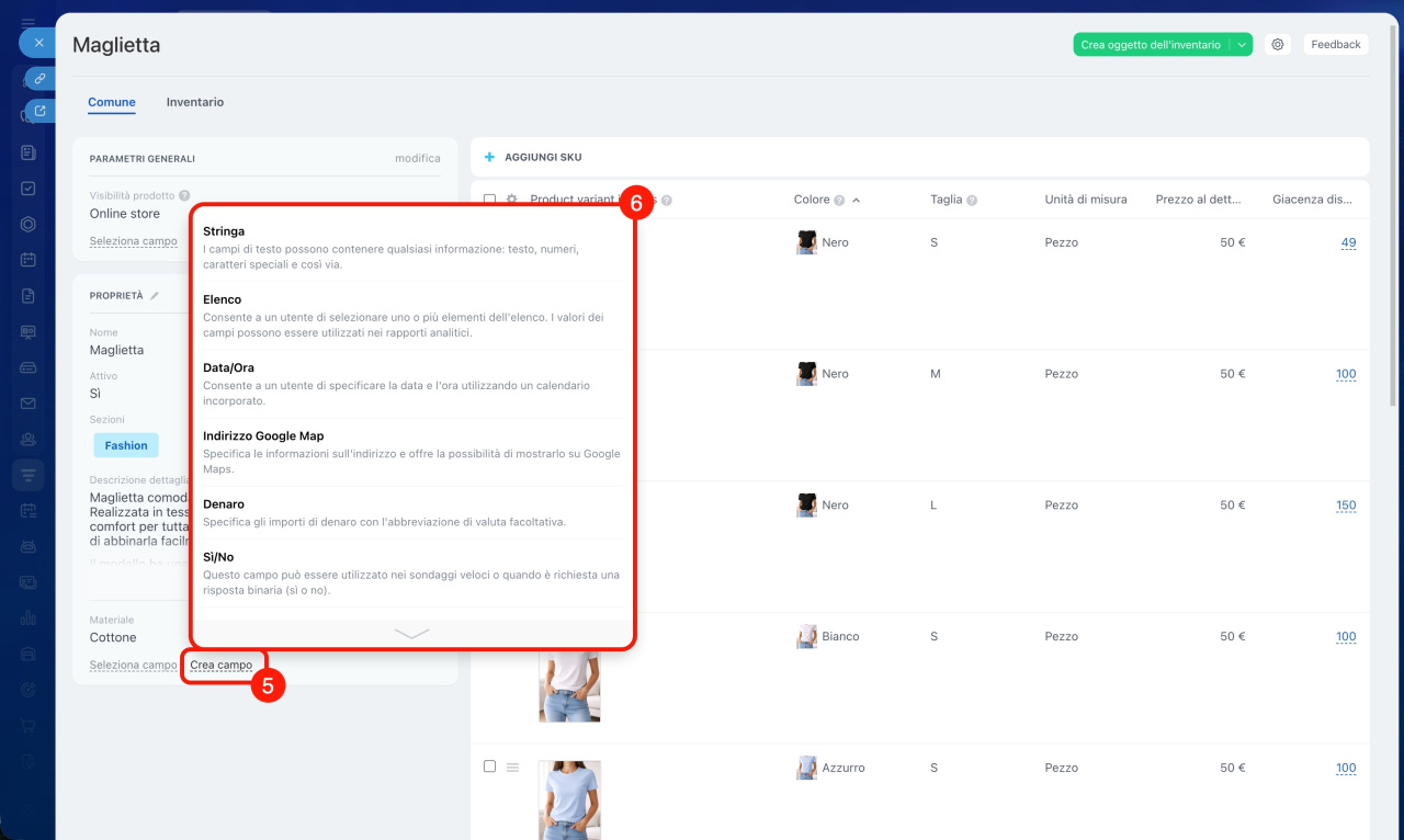 4–6. Apri la scheda prodotto, fai clic su Crea campo e seleziona il tipo di campo.