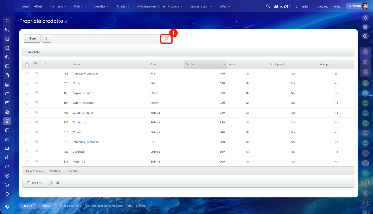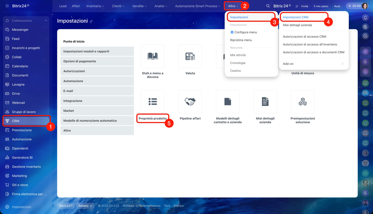 1–5. Vai in CRM > Altro > Impostazioni > Impostazioni CRM > Proprietà prodotto.